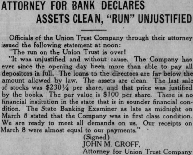 Officials of the Union Trust Company through their attorney issued the following statement at noon: The run on the Union Trust is over! "It was unjustified and without cause. The Company has ever since the opening day been more than able to pay all depositors in full. The loans to the directors are far below the amount allowed by law. The assets are clean. The last sale of stocks was $2301/4 per share, and that price was justified by the books. The par value is $100 per share. There is no financial institution in the state that is in sounder financial condition. The State Banking Examiner as late as midnight on March 8 stated that the Company was in first class condition. We are ready to meet all demands on us. Our receipts on March 8 were almost equal to our payments. (Signed) JOHN GROFF. Attorney for Union Trust Company