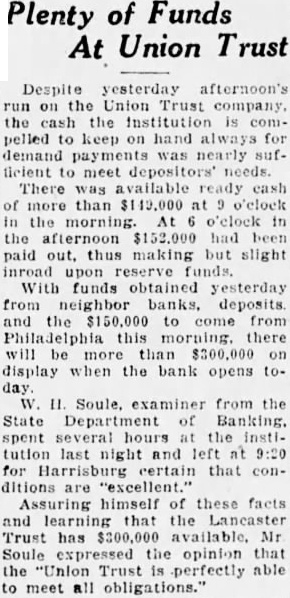 When depositors in the Union Trust company, at Lancaster, started run on the bank, word was telephoned to Philadelphia and banking houses there rushed $150,000 in currency to the bank by special messengers in fast cars. The arrival of the cash, piled up on the counters. quickly halted the run and calm was restored. Incidentally, confidence was also restored in the institution.
