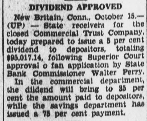 DIVIDEND APPROVED New Britain, Conn., October 15.(UP) I ( State receivers for the closed Commercial Trust Company, today prepared to issue a 5 per cent dividend to depositors, totaling $95,017.14, following Superior Court approval o fan application by State Bank Commissioner Walter Perry. In the commercial department, the diidend will bring to 35 per cent the amount paid to depositors, while the savings department has issued a 75 per cent payment.