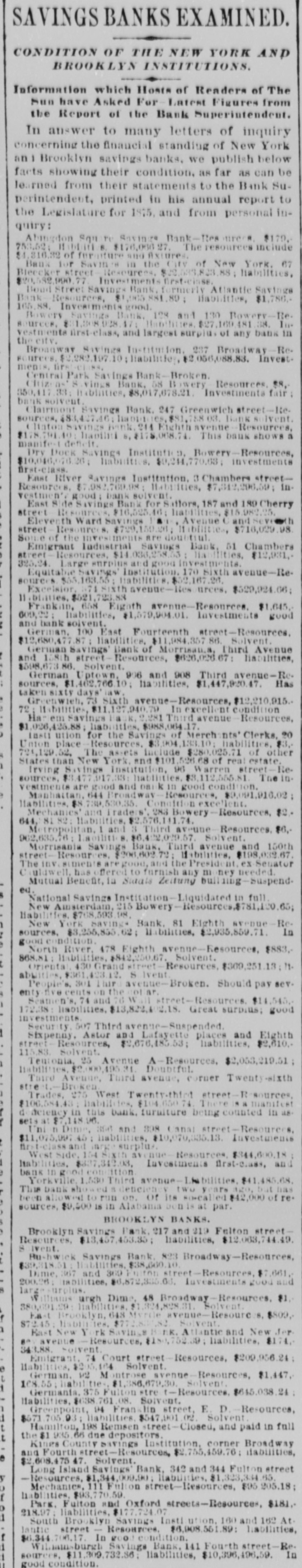 VINGS BANKS EXAMINED. NDITION OF THE NEW YORK AND BROOKLYN INSTITUTIONS. ormation which Hosts of Readers of The Sun have Asked For-Latest Figures from the Report of the Bank Superintendent. answer to many letters of inquiry cerning the financial standing of New York Brooklyn savings banks. we publish below showing their condition. as far as can be rned from their statements to the Bank Suintendent, printed in his annual report to Legislature for 1875, and from personal inbingdon Squ re Sevings Bank-Hes urces. $170.8. $176,066.27. The resources include 316.32 of furniture and Axtures. for Savings in the City of New York. 67 ecker street Resources. $22,523,823.88 ; liabilities, 1582,990.77 Investments Mrst-class. Street Savings Bank. formerly Atlantic Savings Resources, $1,965,881.89 ; Habilities, $1,786,.88. Investments good. owery Savings Bank, 128 and 130 Bowery-Re1,308,928.1 17: Habilities, $27,169 181 38. Intwents nrst-class, and largest surplus of any bank in CITY. roadway Savings Institution. 237 Broadway-Re$2,282,197.10 liabilities, $2,056,088.83. InvestDIS. time CLINA, entral Park Savings Bank-Broken. vings Bank, 58 Bowery Resources. $8,417 33: liabilities, $8,017,678.21 Investments fair: solvent. lairmont Savings Bank. 247 Greenwich street-Retrees, $83,427.46 hanni $81,788.03. Bank sulvent. linton savings Bank 211 Eighth avenue Resources, 791.40: hapiliti $178,068.74. This bank shows a nife-t deficit. Dock Savings Institution Bowery-Resources, 4046,078.26 : liabilities, $9,214,770.63 investments t-class. last River Savings Institution. 3 Chambers streetsources, $7,982,760.98 Habilities, $7,312,206.59; intimen's good: bank solvent. last Side Savings Bank for Saflors, 187 and 189 Cherry Resources, $16,525.46: liabilities, $15,982.25. Deventh Ward Savings I a., Avenue C and Seventh Resources. $729,150.20; liabilities, $716,029.98 of the investments are doubtiul. Imigrant Industrial Savings Bank, 51 Chambers Resources, $14,036,258.53 : lia ilities, $12,931,Large surplus and goodinvestments. iquitable Savings' Institution. 170 Sixth avenue-Re$65,163.55 : liabilities. $52,167.26. Excelsior, 571 Sixth avenue-Res urces, $529,924.06 billies. $521,723.83 Trankin, 658 Eighth avenue-Resources. $1,645.1,22 : liabilities, $1,579,904.01. Investments good bank solvent. terman, 100 East Fourteenth street-Resources. 1,680,477.87 ; liabilities, $11,984,357.86 Solvent. erman Savings Bank of Morrisan.a. Third Avenue 158th street-Resoturces, $626,026.67: liabilities, 8,673.86. Solvent. German Uptown. 906 and 908 Third avenue-Reirces, $1,462,766.10 liabilities, $1,447,920.47. Has sixty days' \reenwieh, 73 Sixth avenue-Resources, $12,210,915.lisbilities, $11,127,940.79 In excellent condition em Savings Back, 2,281 Third avenue Resources, 026,425.88 ; liabilities, $988,064.17. nst1 ution for the Savings of Merchants' Clerks. 20 place Resources. $3,904,133.10; habilities, $3,1,129.52, The assets include $280,025.71 of other than New York, and $101,526.68 of real estate. rving Savings Institution, 96 Warren street-Reurces, $3,477,917.33 liabilities. $3,112,555.81 The instments are good and oank in good condition. Manhattan, 644 Broadway- Resources, $9,091,916.02 ; bilities. $8,739,530.35. Condition excellent. techanics' and Fraders'. 283 Bowery-Resources, $2.81 82: Habilities, $2,576,141.74. tropolitan, 1 and 8 Third avenue- Resources. $6,2,635.76 : Laoiliti $6,422,029.57. Solvent. Morrisania Savings Bank, Third avenue and 150th eet-Resources, $206,602.72 Habilities, $198,032.67. inv. siments aregood, and the Preside nt. ex Senator uldwell, has offered to furnish any m ney needed. tutual Benefit, in Staats Zeitung bulling-SuspendVational Savings Institation-Liquidated in full. New Amsterdam, 215 Bowery-Resources,$781,120.65; bilities. $768,593.98. New York Saving* Bank. 81 Eighth avenue-Rearces. $3,255,855.62 liabilities, $2,935,859.71. In condition. North River, 478 Eighth avenue-Resources, $883,3.81; liabilities. $842,250.67. Solvent. Priental, 430Grand street-Resources, $369,251.13 11. witles, $361,423.12. S Ivent People's, 301 Thir avenue-Broken. Should pay sevfive cents on the Tol ar. Seamen's, 74 and 76 W an street-Resources. $14,545.liabilities. $13,822.4 2.18. Great surprus: good