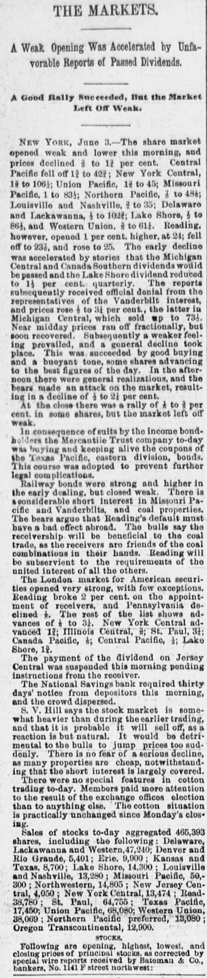 THE MARKETS. A Weak Opening Was Accelerated by Unfavorable Reports of Passed Dividends. A Good Rally Succeeded, But the Market Left Off Weak. NEW YORK, June 3.-The share market opened weak and lower this morning, and prices declined i to 11 per cent. Central Pacific fell off 11 to 423; New York Central, 1@ to 1061; Union Pacific, 1@ to 45; Missouri Pacific, 1 to 83}; Northern Pacific, 7 to 48#; Louisville and Nashville, I to 35; Delaware and Lackawanna, 1 to 1021; Lake Shore, 1 to 861, and Western Union, à to 614. Reading, however, opened 1 per cent. higher, at 24; fell off to 23], and rose to 25. The early decline was accelerated by stories that the Michigan Central and Canada Southern dividends would be passed and the Lake Shore dividend reduced to 11 per cent. quarterly. The reports subsequently received official denial from the representatives of the Vanderbilt interest, and prices rose à to 3t per cent., the latter in Michigan Central, which sold up to 731. Near midday prices ran off fractionally, but soon recovered. Subsequently a weaker feeling prevailed, and a general decline took place. This was succeeded by good buying and a buoyant tone, some shares advancing to the best figures of the day. In the afternoon there were general realizations, and the bears made an attack on the market, resulting in a decline of 1 to 21 per cent. At the close there was & rally of 1 to # per cent. in some shares, but the market left off weak. In consequence of suits by the income bondbolders the Mercantile Trust company to-day was buying and keeping alive the coupons of the Texas Pacific, eastern division, bonds. This course was adopted to prevent further legal complications. Railway bonds were strong and higher in the early dealing, but closed weak. There is a considerable short interest in Missouri Pacific and Vanderbilts, and coal properties. The bears argue that Reading's default must have a bad effect abroad. The bulls say the receivership will be beneficial to the coal trade, as the receivers are friends of the coal combinations in their hands. Reading will be subservient to the requirements of the united interest of all the others. The London market for American securities opened very strong, with few exceptions. Reading broke 2 per cent. on the appointment of receivers, and Pennsylvania declined 1. The rest of the list shows advances of # to 31. New York Central advanced 12; Illinois Central, #; St. Paul, 31; Canada Pacific, #; Central Pacific, 1; Lake Shore, 1%. The payment of the dividend on Jersey Central was suspended this morning pending instructions from the receiver. The National Savings bank required thirty days' notice from depositors this morning, and the crowd dispersed. S. v. Hill says the stock market is somewhat heavier than during the earlier trading, and that it is probable it will sell off, as a reaction is but natural. It would be detrimental to the bulls to jump prices too suddenly. There is no fear of a serious decline, as many properties are cheap, notwithstanding that the short interest is largely covered. There were no special features in cotton trading to-day. Members paid more attention to the result of the exchange offices election than to anything else. The cotton situation is practically unchanged since Monday's closing. Sales of stocks to-day aggregated 465,393 shares, including the following Delaware, Lackawanna and Western,47,240; Denver and Rio Grande, 5,401; Erie, 9,900 ; Kansas and Texas, 8,700; Lake Shore, 14,300 Louisville and Nashville, 13,280 ; Missouri Pacific, 50,300; Northwestern, 14,805 New Jersey Central, 4,050 New York Central, 13,474 ; Read38,780; St. Paul, 64,755; Texas Pacific, 17,450; Union Pacific, 68,080; Western Union, 38,069 ; Northern Pacific preferred, 13,080 Oregon Transcontinental, 12,900. STOCKS. Following are opening, highest, lowest, and closing prices of principal stocks. as corrected by special wire reports received by Bateman & Co., bankers, No. 1141 F street northwest: