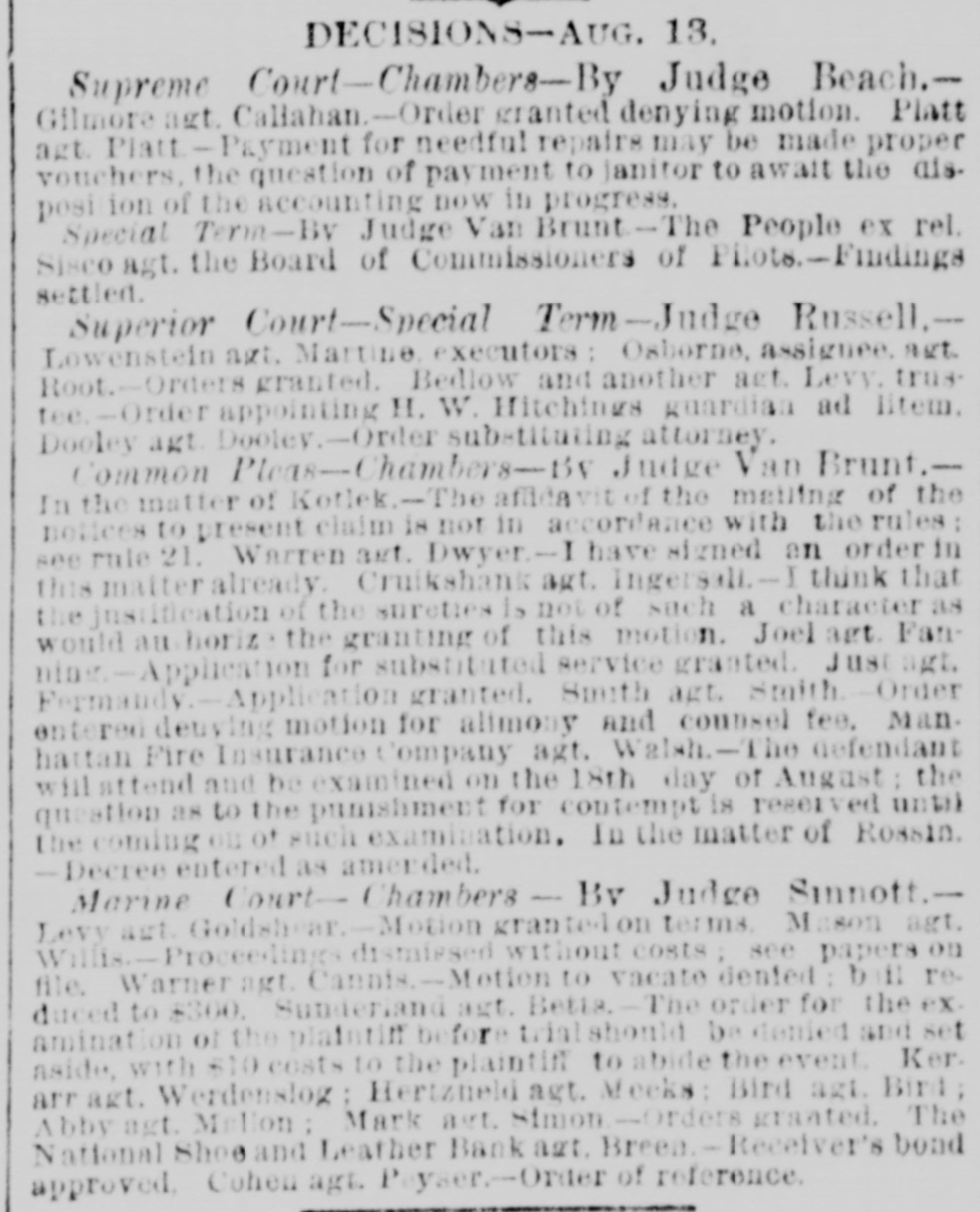 DECISIONS-AUG. 13. Supreme Court-Chambers-By Judge Beach.- Gilmore agt. Callahan.-Order granted denying motion. Platt agt. Platt-Payment for needful repairs may be made proper vouchers, the question of payment to janitor to await the dis-posi ion of the accounting now in progress. Special Term-By Judge Van Brunt-The People ex rel. Sisco agt. the Board of Commissioners of Pilots.-Findings settled. Superior Court-Special Term-Judge Russell.- Lowenstein agt. Martine, executors: Osborne, assignee, agt. Root.-Orders granted. Bedlow and another act. Levy, trustee. -Order appointing H. W. Hitchings guardian ad litem. Dooley agt. Dooley.-Order substituting attorney. Common Pleas-Chambers-By Judge Van Brunt.- In the matter of Kotlek.-The affidavit of the mailing of the notices to present claim is not in accordance with the rules: see rule 21. Warren art. Dwyer.-I have signed an order in this matter already. Cruikshank agt. Ingersali-I think that the justification of the sureties is not of such a character as would authorize the granting of this motion. Joel art. Fanning-Application for substituted service granted. Just agt. Fermandy. Application granted. Smith agt. Smith. Order entered deuving motion for alimony and counsel fee, Manhattan Fire Insurance company agt. Walsh. The defendant will attend and be examined on the 18th day of August; the question as to the punishment for contempt is reserved untai The coming on of such examination. In the matter of Rossin. -Decree entered as amended. Marine Court-Chambers - By Judge Sinnott.- Levy agt. Goldshear.-Motion granted on terms. Mason agt. Willis. Proceedings dismissed without costs; see papers on file. Warner agt. Cannis. --Motion to vacate dented: bil reduced to $300. Sunderland agt. Betis. The order for the examination of the plaintiff before trial should be denied and set aside, with 510 costs to the plaintiff to abide the event. Ker. arr agt. Werdenslog: Hertzneli agt. Meeks: Bird agi. Bird; Abby agt. Melion; Mark act. Simon-Orders granted. The National Shoe and Leather Bank azt. Breen. - Receiver's bond approved, Cohen agt. Peyser.-Order of reference.