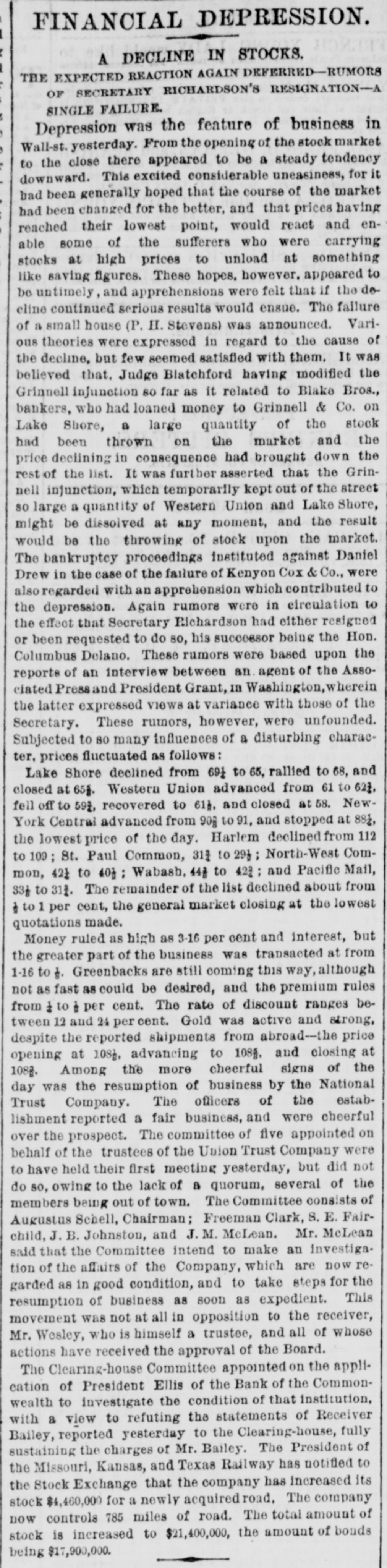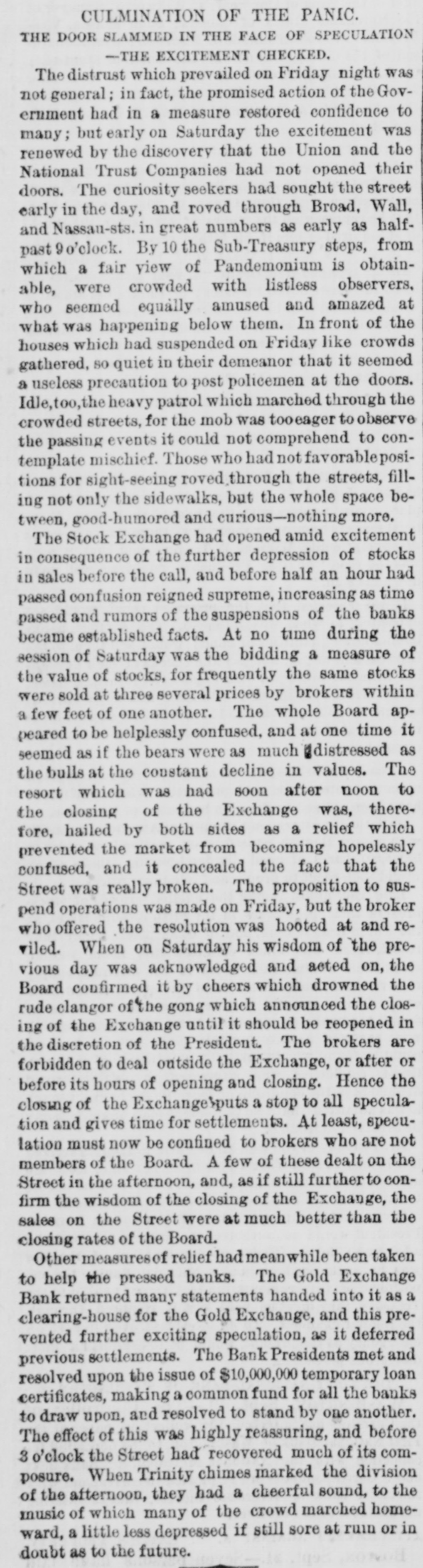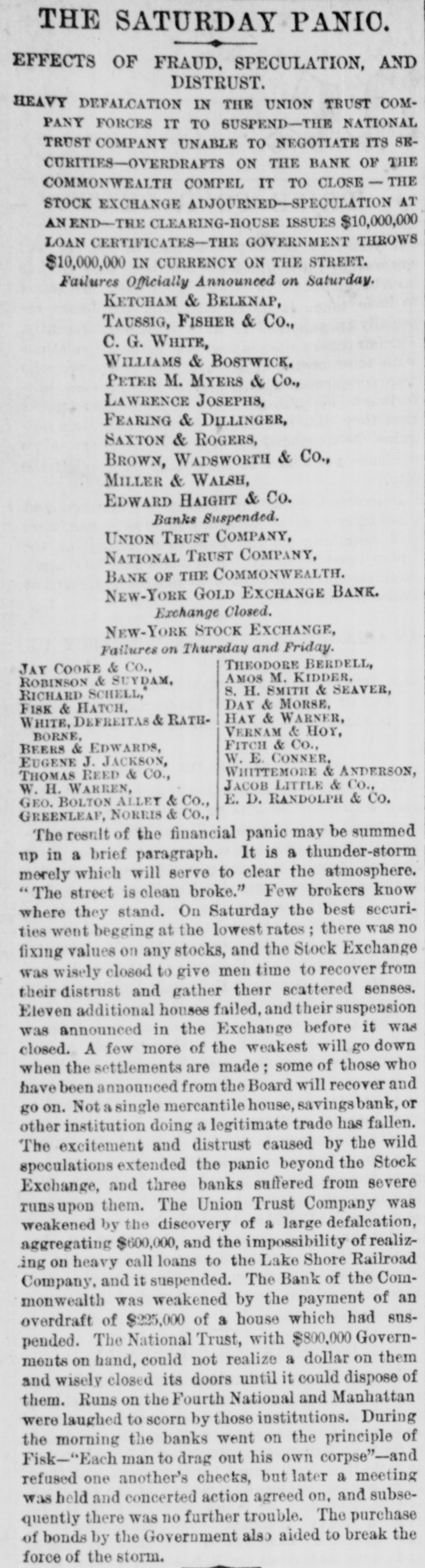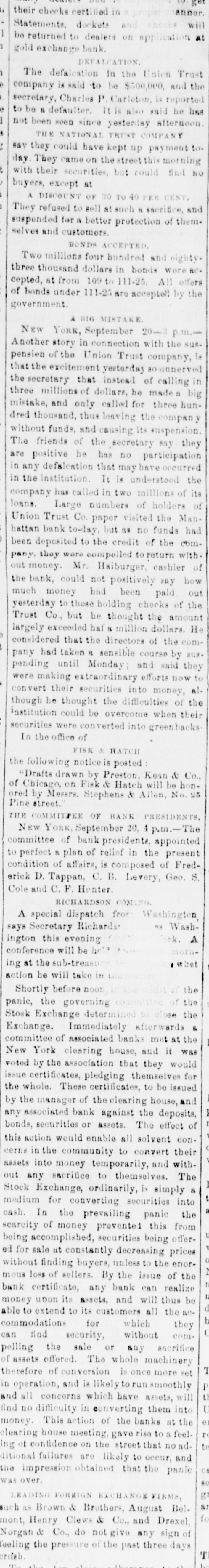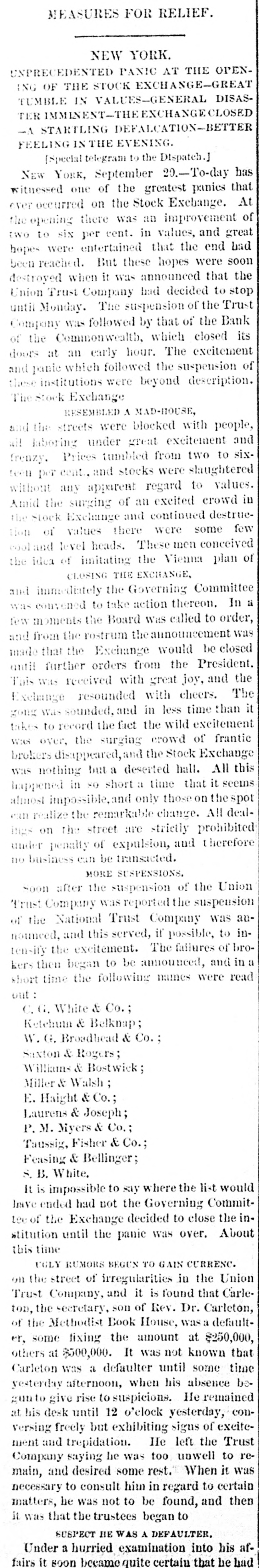 MEASURES FOR RELIEF. NEW YORK. # UNPRECEDENTED PANIC AT THE OPENING OF THE STOCK EXCHANGE-GREAT TUMBLE IN VALUES-GENERAL DISASTER IMMINENT-THE EXCHANGE CLOSED -A STARTLING DEFALCATION-BETTER FEELING IN THE EVENING. [Special telegram to the Dispatch.] NEW YORK, September 20.-To-day has witnessed one of the greatest panics that ever occurred on the Stock Exchange. At the opening there was an improvement of two to six per cent. in values, and great hopes were entertained that the end had been reached. But these hopes were soon destroyed when it was announced that the Union Trust Company had decided to stop until Monday. The suspension of the Trust Company was followed by that of the Bank of the Commonwealth, which closed its doors at an early hour. The excitement and panic which followed the suspension of these institutions were beyond description. The Stock Exchange RESEMBLED A MAD-HOUSE, and the streets were blocked with people, all laboring under great excitement and frenzy. Prices tumbled from two to sixteen per cent., and stocks were slaughtered without any apparent regard to values. Amid the surging of an excited crowd in the Stock Exchange and continued destruction of values there were some few cool and level heads. These men conceived the idea of imitating the Vienna plan of CLOSING THE EXCHANGE, and immediately the Governing Committee was convened to take action thereon. In a few moments the Board was called to order, and from the rostrum the announcement was made that the Exchange would be closed until further orders from the President. This was received with great joy, and the Exchange resounded with cheers. The gong was sounded, and in less time than it takes to record the fact the wild excitement was over, the surging crowd of frantic brokers disappeared, and the Stock Exchange was nothing but a deserted hall. All this happened in so short a time that it seems almost impossible, and only those on the spot can realize the remarkable change. All dealings on the street are strictly prohibited under penalty of expulsion, and therefore no business can be transacted. MORE SUSPENSIONS. Soon after the suspension of the Union Trust Company was reported the suspension of the National Trust Company was announced, and this served, if possible, to intensify the excitement. The failures of brokers then began to be announced, and in a short time the following names were read out: C. G. White & Co.; Ketchumn & Belknap; W. G. Broadhead & Co.; Saxton & Rogers; Williams & Bostwick; Miller & Walsh; E. Haight & Co.; Laurens & Joseph; P. M. Myers & Co.; Taussig, Fisher & Co.; Feasing & Bellinger; S. B. White. It is impossible to say where the list would have ended had not the Governing Committee of the Exchange decided to close the institution until the panic was over. About this time UGLY RUMORS BEGUN TO GAIN CURRENC. on the street of irregularities in the Union Trust Company, and it is found that Carleton, the secretary, son of Rev. Dr. Carleton, of the Methodist Book House, was a defaulter, some fixing the amount at $250,000, others at $500,000. It was not known that Carleton was a defaulter until some time yesterday afternoon, when his absence begun to give rise to suspicions. He remained at his desk until 12 o'clock yesterday, conversing freely but exhibiting signs of excitement and trepidation. He left the Trust Company saying he was too unwell to remain, and desired some rest. When it was necessary to consult him in regard to certain matters, he was not to be found, and then it was that the trustees began to SUSPECT HE WAS A DEFAULTER. Under a hurried examination into his affairs it soon became quite certain that he had