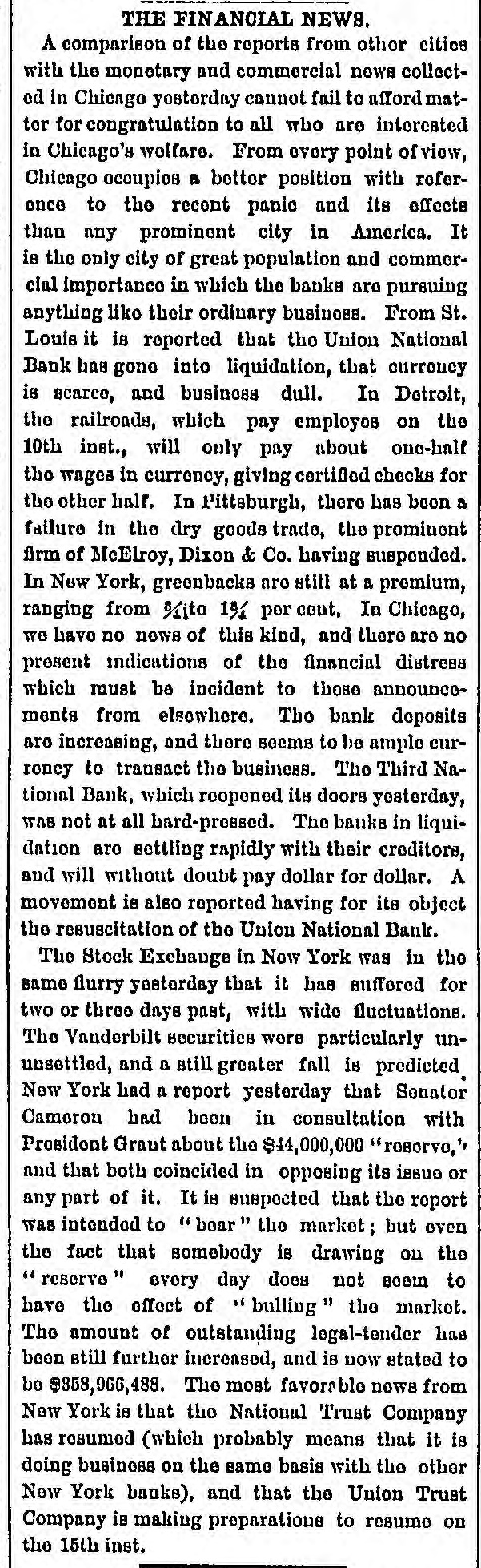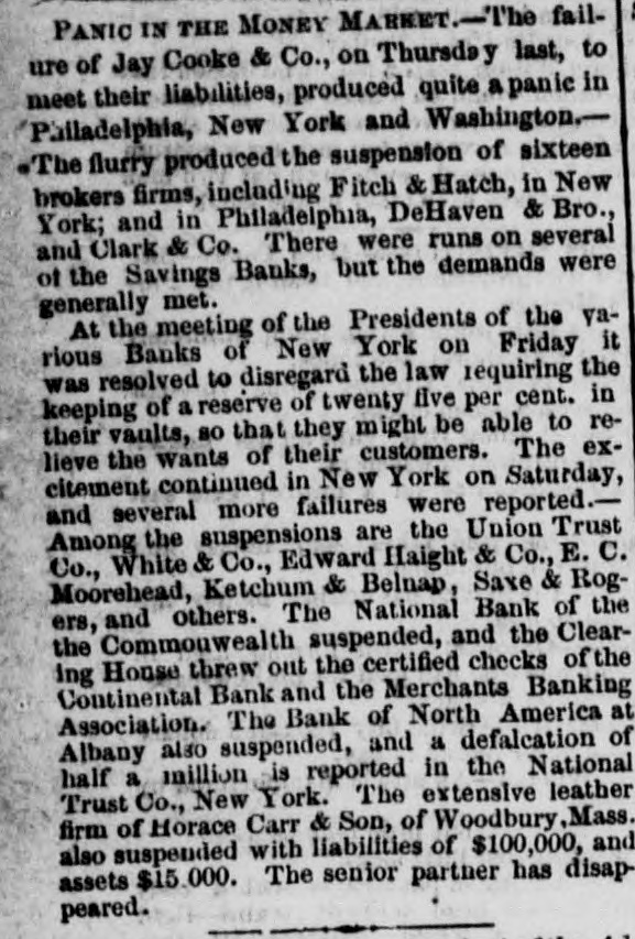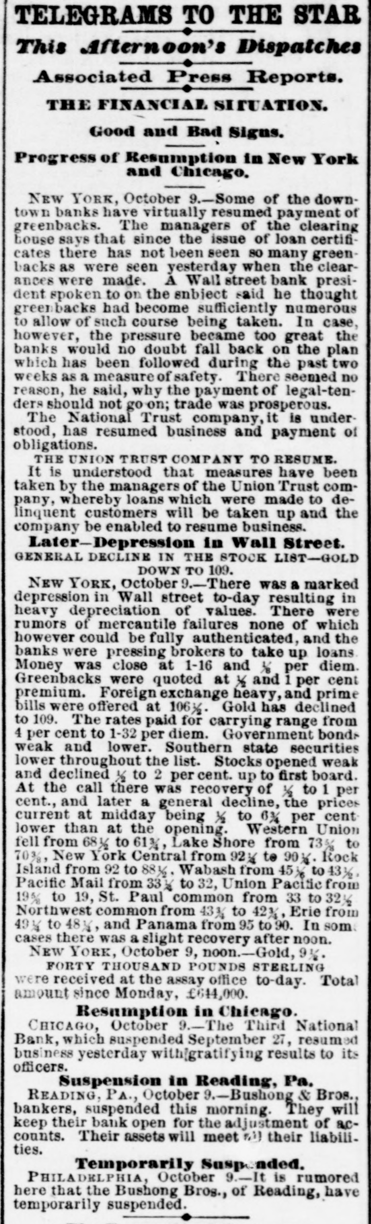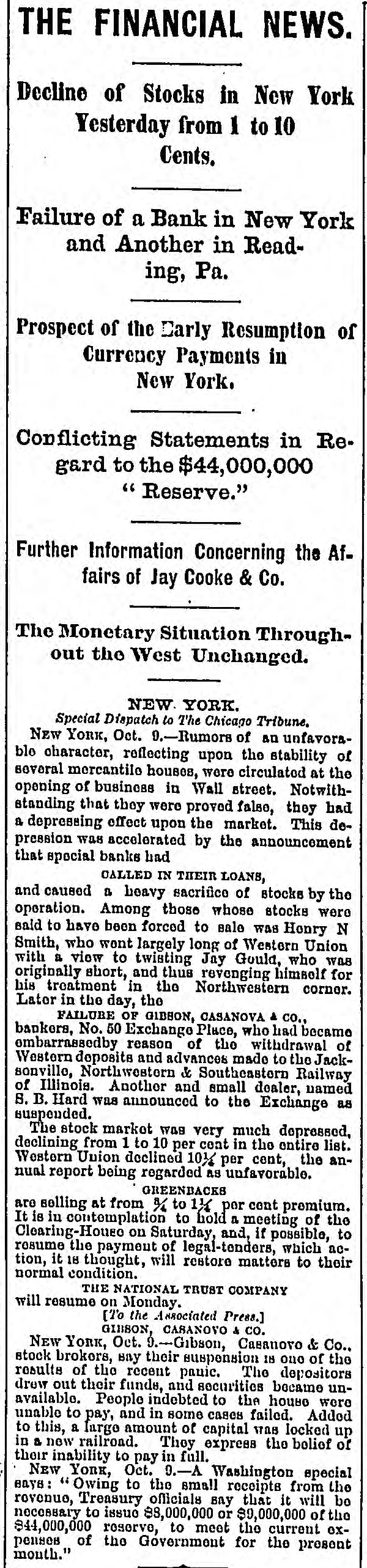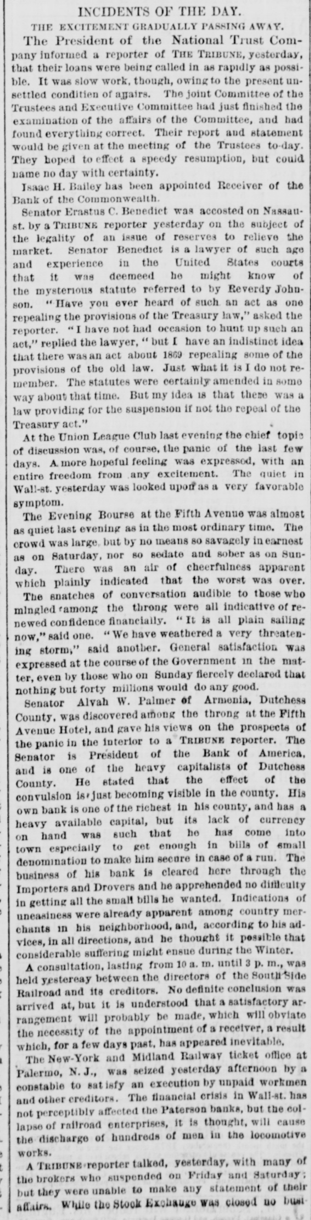 MEASURES FOR RELIEF. NEW YORK. # UNPRECEDENTED PANIC AT THE OPENING OF THE STOCK EXCHANGE-GREAT TUMBLE IN VALUES-GENERAL DISASTER IMMINENT-THE EXCHANGE CLOSED -A STARTLING DEFALCATION-BETTER FEELING IN THE EVENING. [Special telegram to the Dispatch.] NEW YORK, September 20.-To-day has witnessed one of the greatest panics that ever occurred on the Stock Exchange. At the opening there was an improvement of two to six per cent. in values, and great hopes were entertained that the end had been reached. But these hopes were soon destroyed when it was announced that the Union Trust Company had decided to stop until Monday. The suspension of the Trust Company was followed by that of the Bank of the Commonwealth, which closed its doors at an early hour. The excitement and panic which followed the suspension of these institutions were beyond description. The Stock Exchange RESEMBLED A MAD-HOUSE, and the streets were blocked with people, all laboring under great excitement and frenzy. Prices tumbled from two to sixteen per cent., and stocks were slaughtered without any apparent regard to values. Amid the surging of an excited crowd in the Stock Exchange and continued destruction of values there were some few cool and level heads. These men conceived the idea of imitating the Vienna plan of CLOSING THE EXCHANGE, and immediately the Governing Committee was convened to take action thereon. In a few moments the Board was called to order, and from the rostrum the announcement was made that the Exchange would be closed until further orders from the President. This was received with great joy, and the Exchange resounded with cheers. The gong was sounded, and in less time than it takes to record the fact the wild excitement was over, the surging crowd of frantic brokers disappeared, and the Stock Exchange was nothing but a deserted hall. All this happened in so short a time that it seems almost impossible, and only those on the spot can realize the remarkable change. All dealings on the street are strictly prohibited under penalty of expulsion, and therefore no business can be transacted. MORE SUSPENSIONS. Soon after the suspension of the Union Trust Company was reported the suspension of the National Trust Company was announced, and this served, if possible, to intensify the excitement. The failures of brokers then began to be announced, and in a short time the following names were read out: C. G. White & Co.; Ketchumn & Belknap; W. G. Broadhead & Co.; Saxton & Rogers; Williams & Bostwick; Miller & Walsh; E. Haight & Co.; Laurens & Joseph; P. M. Myers & Co.; Taussig, Fisher & Co.; Feasing & Bellinger; S. B. White. It is impossible to say where the list would have ended had not the Governing Committee of the Exchange decided to close the institution until the panic was over. About this time UGLY RUMORS BEGUN TO GAIN CURRENC. on the street of irregularities in the Union Trust Company, and it is found that Carleton, the secretary, son of Rev. Dr. Carleton, of the Methodist Book House, was a defaulter, some fixing the amount at $250,000, others at $500,000. It was not known that Carleton was a defaulter until some time yesterday afternoon, when his absence begun to give rise to suspicions. He remained at his desk until 12 o'clock yesterday, conversing freely but exhibiting signs of excitement and trepidation. He left the Trust Company saying he was too unwell to remain, and desired some rest. When it was necessary to consult him in regard to certain matters, he was not to be found, and then it was that the trustees began to SUSPECT HE WAS A DEFAULTER. Under a hurried examination into his affairs it soon became quite certain that he had