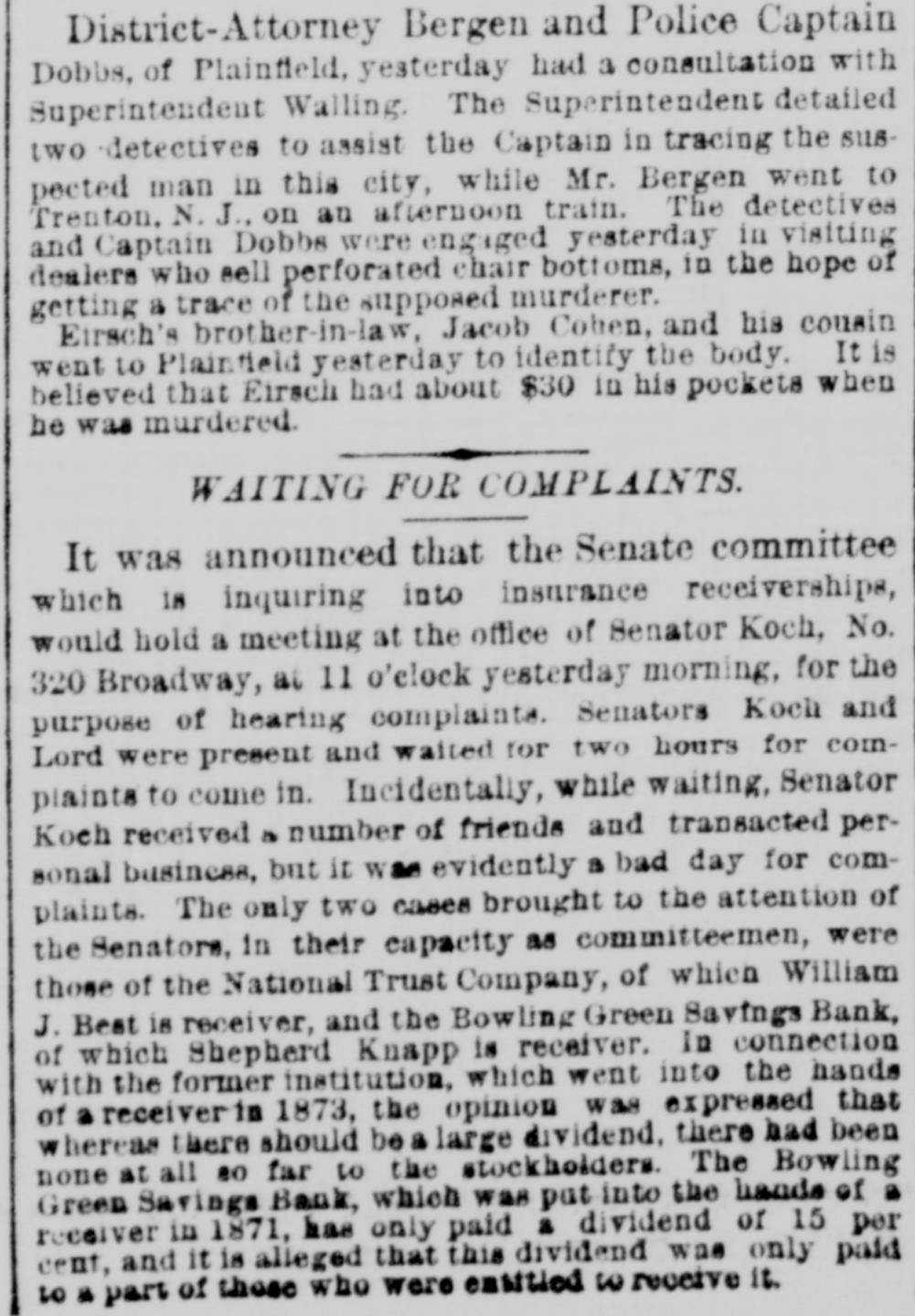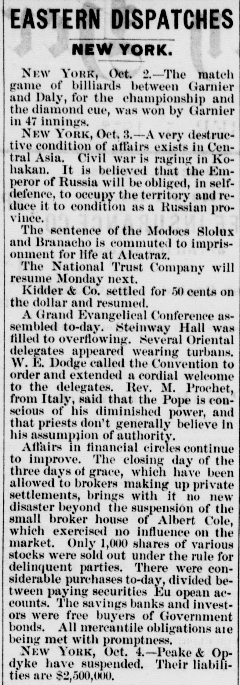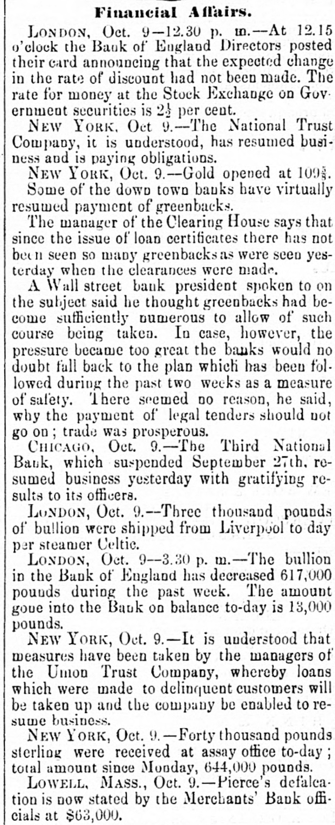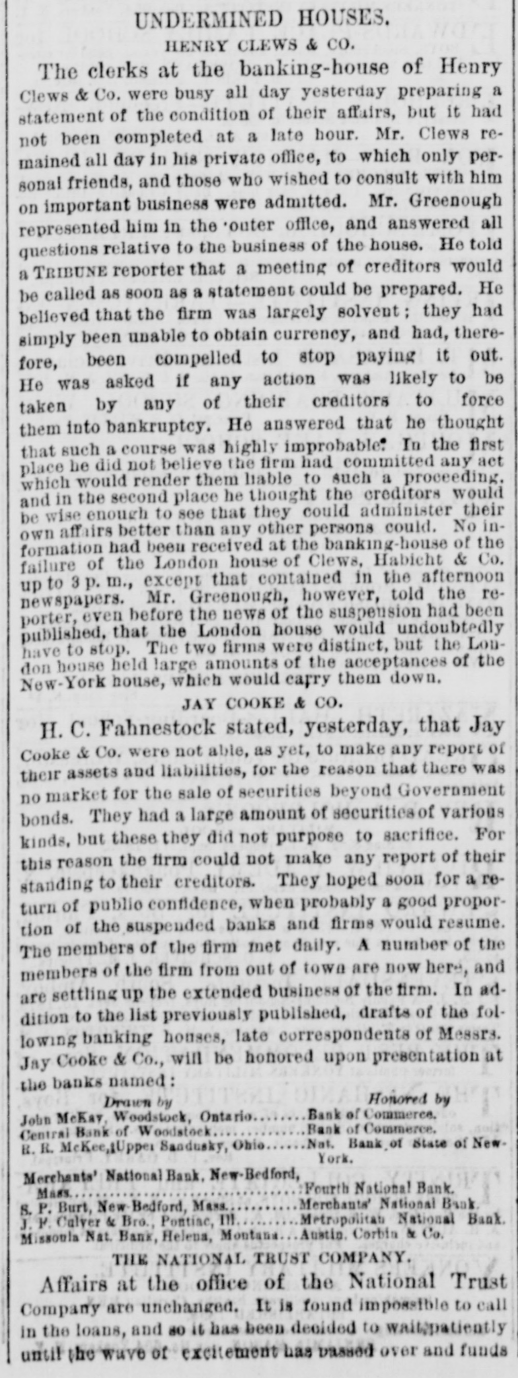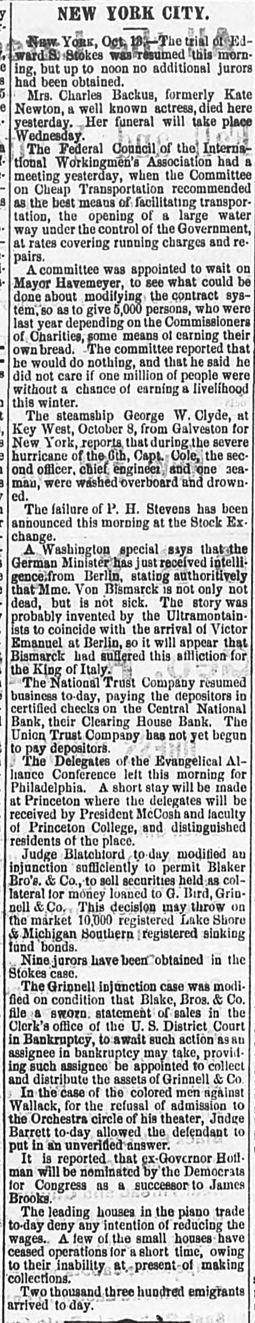 MEASURES FOR RELIEF. NEW YORK. # UNPRECEDENTED PANIC AT THE OPENING OF THE STOCK EXCHANGE-GREAT TUMBLE IN VALUES-GENERAL DISASTER IMMINENT-THE EXCHANGE CLOSED -A STARTLING DEFALCATION-BETTER FEELING IN THE EVENING. [Special telegram to the Dispatch.] NEW YORK, September 20.-To-day has witnessed one of the greatest panics that ever occurred on the Stock Exchange. At the opening there was an improvement of two to six per cent. in values, and great hopes were entertained that the end had been reached. But these hopes were soon destroyed when it was announced that the Union Trust Company had decided to stop until Monday. The suspension of the Trust Company was followed by that of the Bank of the Commonwealth, which closed its doors at an early hour. The excitement and panic which followed the suspension of these institutions were beyond description. The Stock Exchange RESEMBLED A MAD-HOUSE, and the streets were blocked with people, all laboring under great excitement and frenzy. Prices tumbled from two to sixteen per cent., and stocks were slaughtered without any apparent regard to values. Amid the surging of an excited crowd in the Stock Exchange and continued destruction of values there were some few cool and level heads. These men conceived the idea of imitating the Vienna plan of CLOSING THE EXCHANGE, and immediately the Governing Committee was convened to take action thereon. In a few moments the Board was called to order, and from the rostrum the announcement was made that the Exchange would be closed until further orders from the President. This was received with great joy, and the Exchange resounded with cheers. The gong was sounded, and in less time than it takes to record the fact the wild excitement was over, the surging crowd of frantic brokers disappeared, and the Stock Exchange was nothing but a deserted hall. All this happened in so short a time that it seems almost impossible, and only those on the spot can realize the remarkable change. All dealings on the street are strictly prohibited under penalty of expulsion, and therefore no business can be transacted. MORE SUSPENSIONS. Soon after the suspension of the Union Trust Company was reported the suspension of the National Trust Company was announced, and this served, if possible, to intensify the excitement. The failures of brokers then began to be announced, and in a short time the following names were read out: C. G. White & Co.; Ketchumn & Belknap; W. G. Broadhead & Co.; Saxton & Rogers; Williams & Bostwick; Miller & Walsh; E. Haight & Co.; Laurens & Joseph; P. M. Myers & Co.; Taussig, Fisher & Co.; Feasing & Bellinger; S. B. White. It is impossible to say where the list would have ended had not the Governing Committee of the Exchange decided to close the institution until the panic was over. About this time UGLY RUMORS BEGUN TO GAIN CURRENC. on the street of irregularities in the Union Trust Company, and it is found that Carleton, the secretary, son of Rev. Dr. Carleton, of the Methodist Book House, was a defaulter, some fixing the amount at $250,000, others at $500,000. It was not known that Carleton was a defaulter until some time yesterday afternoon, when his absence begun to give rise to suspicions. He remained at his desk until 12 o'clock yesterday, conversing freely but exhibiting signs of excitement and trepidation. He left the Trust Company saying he was too unwell to remain, and desired some rest. When it was necessary to consult him in regard to certain matters, he was not to be found, and then it was that the trustees began to SUSPECT HE WAS A DEFAULTER. Under a hurried examination into his affairs it soon became quite certain that he had