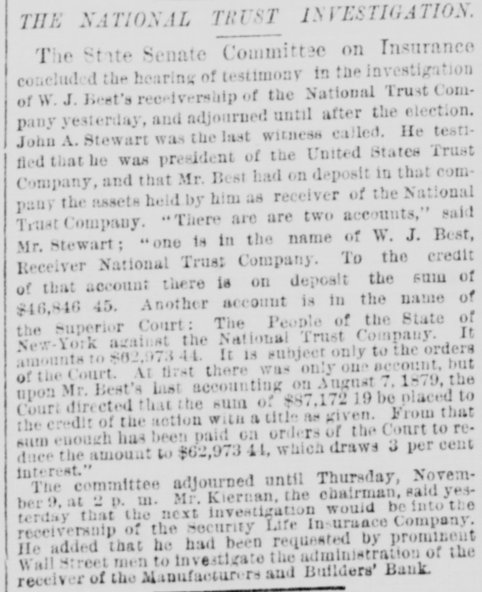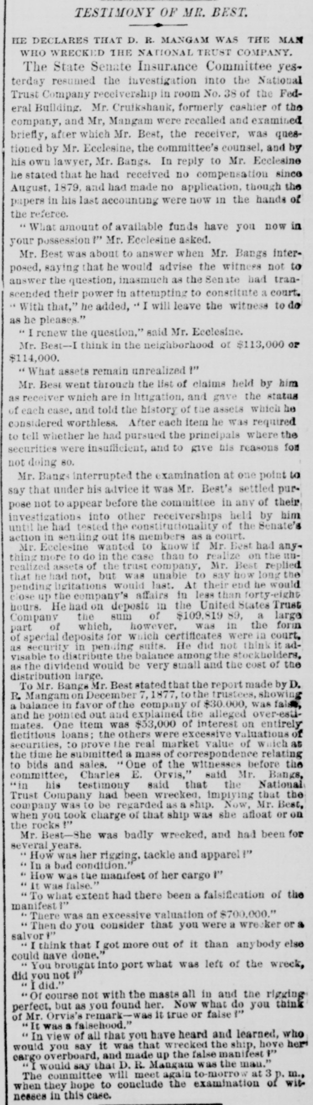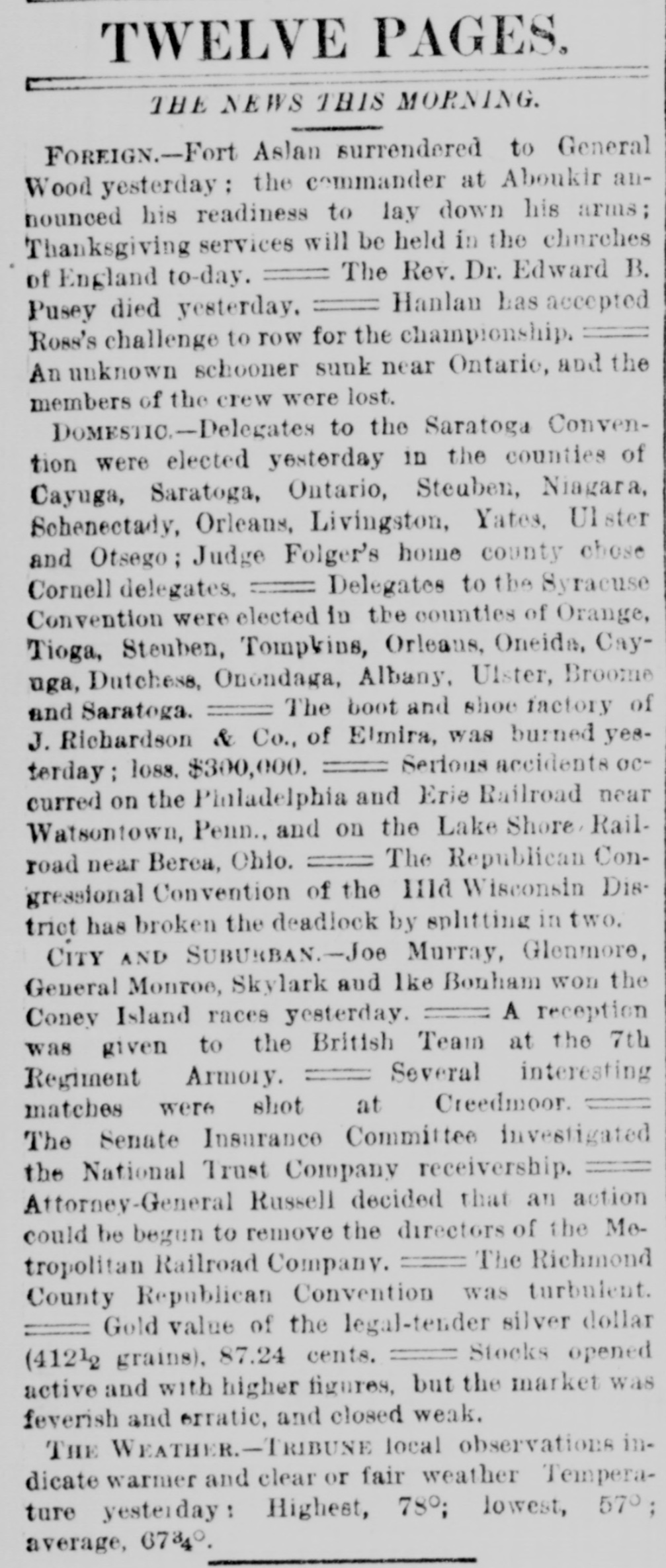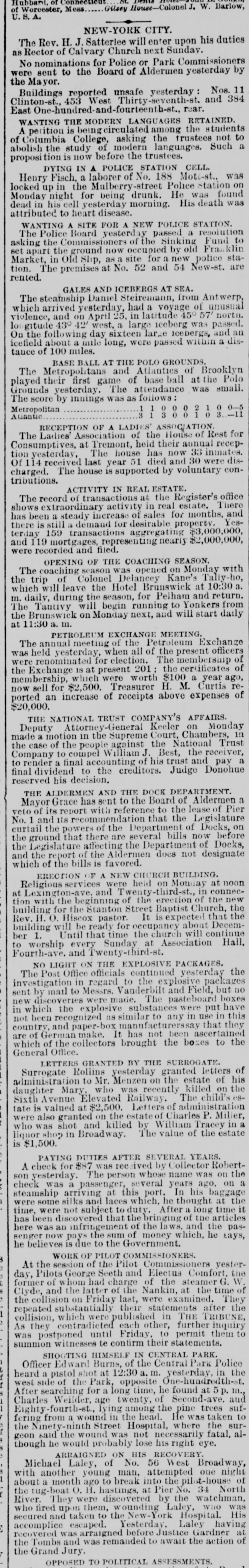 Hubbani. Worcester, Meas Gilsey House-Colonel J. W. Barlow, U.S.A. NEW-YORK CITY. The Rev. H.J. Satterlee will enter upon his duties as Rector of Calvary Church next Sunday. No nominations for Police or Park Commissioners were sent to the Board of Aldermen yesterday by the Mayor. Buildings reported unsafe yesterday Nos. 11 Clinton-st. West Thirty-seventh-st. and 384 East One-hundred-and-fourteenth-at. rear. WANTING THE MODERN LANGUAGES RETAINED. A perition is circulated among the students of Columbia College, asking the trustees not to abolish the study of modern languages. Such a proposition is now before the trustees. DYING IN A POLICE STATION CELL. Henry Fisch, a laborer of No. 188 Mott-st. locked up in the Mulberry-street Police station was Monday night for being drunk. He was dead in his cell yesterday morning. His death found attributed to heart disease. WANTING A SITE FOR A NEW POLICE STATION. The Police Board yesterday passed a resolution asking the Commissioners of the Sinking Fund to apart the ground now occupied by old Franklin Market, in Old Slip, as a site for new police station. The premises at No. 52 and 54 New-st. are rented. GALES AND ICEBERGS AT SEA. The steamship Daniel Steiremann, from Antwerp, which arrived yesterday, had a voyage of unusual violence, and on April 25, in latitude 45 57 north, lo: gitude 43° 42 west, a large iceberg was passed. On the following day sixteen large icebergs, and icefield about a mile long, were passed within a dis- an tauce of 100 miles. BASE BALL AT THE POLO GROUNDS. The Metropolitans and Atlantics of Brooklyn played their first game of base ball at the Polo Grounds yesterday. The attendance was small. The score by innings was as follows: Metropolitan Atlantic RECEPTION OF A LADIES' ASSOCIATION. for The Ladies' Association of the House of Rest Consumptives, at Tremont, held their annual reception yesterday, The house has now 33 inmates, received last year 51 died and 30 were discharged. The house is supported by voluntary contributions. ACTIVITY IN REAL ESTATE. The record of transactions at the Register's office shows extraordinary activity in real estate, There has been a steady increase of sales for months and there is still demand for desirable property. Yesterday 159 transactions aggregating $3,000,000, and 119 mortgages, representing nearly $2,000,000, were recorded and filed. OPENING OF THE COACHING SEASON. The coaching season was opened on Monday with the trip of Colonel Delancey Kane's Taliy-ho, which will leave the Hotel Brunswick at 10:30 a m. daily, during the season, for Pelham and return. The Tantivy will begin running to Yonkers from the Brunswick on Monday next, and will start daily at 11:30 m. PETROLEUM EXCHANGE MEETING. The annual meeting of the Petroleum Exchange as held yesterday, when all of the present officers were renominated for election. The membership the Exchange is at present 201 the certificates of of membership, which were worth $100 a year now sell for $2,500. Treasurer H. M. Curtis ago, reported an increase of receipts above expenses of $20,000. THE NATIONAL TRUST COMPANY'S AFFAIRS. Deputy Attorney-General Keeler on Monday made motion in the Supreme Court. Chambers, in the case of the people against the National Trust Company to compel William J. Best, the receiver, to render a final accounting of his trust and pay a final dividend to the creditors. Judge Donohue reserved his decision, THE ALDERMEN AND THE DOCK DEPARTMENT. a Mayor Grace has sent to the Board of Aldermen veto of its report with reference to the lease of Pier No. 1 and its recommendation that the Legislature curtail the powers of the Department of Docks, os the ground that there: are several bills now before the Legislature affecting the Department of Docks, and the report of the Aldermen does not designate which of the bills is favored. ERECTION OF A NEW CHURCH BUILDING. noon Religious services were held on Monday at at Lexington-ave and Twenty-third-st., in connection with the beginning of the erection of the new building for the Stanton Street Baptist Church, the Rev. H. O. Hiscox pastor. It is expected that the building will be ready for occupancy about December 1. Until that time the church will continue to worship every Sunday at Association Hall, Fourth-ave and Twenty-third-st, NO LIGHT ON THE EXPLOSIVE PACKAGES. The Post Office officials continued yesterday the investigation in regard to the explosive packages sent by mail to Messrs. Vanderbilt and Field, but no new discoveries were made. The pasteboard boxes in which the explosive substances were put have not been recognized as similar to any in use in this country, and paper-box manuf urerssav that are of German make. It has not been ascertained which of the collectors brought the boxes to the General Office. LETTERS GRANTED BY THE SURROGATE Surrogate Rollins yesterday granted letters of administration to Mr. Menzen on the estate of his daughter Marv. who was recently killed on the Sixth Avenue Elevated Railway. The child's tate is valued at $2,500. Letters of administration a were also granted on the estate of Charles P. Miller, who was shot and killed by William Tracey in liquor shop in Broadway. The value of the estate is $1,500. PAYING DUTIES AFTER SEVERAL YEARS. A check for $87 ived by Collector Robertson yesterday. The person whose name was on the check was a passenger, several years ago, on steamship arriving at this port. In his baggage a were some silks and laces which, he thought at the time, were not subject toduty. After long time has been discovered that the bringing of the articles here was an infringement of the laws, and the senger now pays the sum of money which, he tays, pashe believes is due to the Government, WORK OF PILOT COMMISSIONERS At the session of the Pilot Commissioners yesterday, Pilots George Seeth and Electus Comfort, the former of whom had charge of the steamer Clyde, and the latter of the Nankin, at the time of the collision on Friday last, were e
