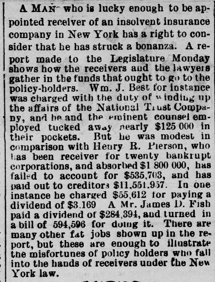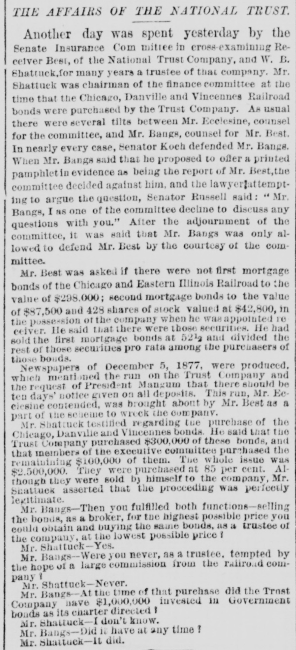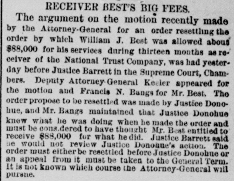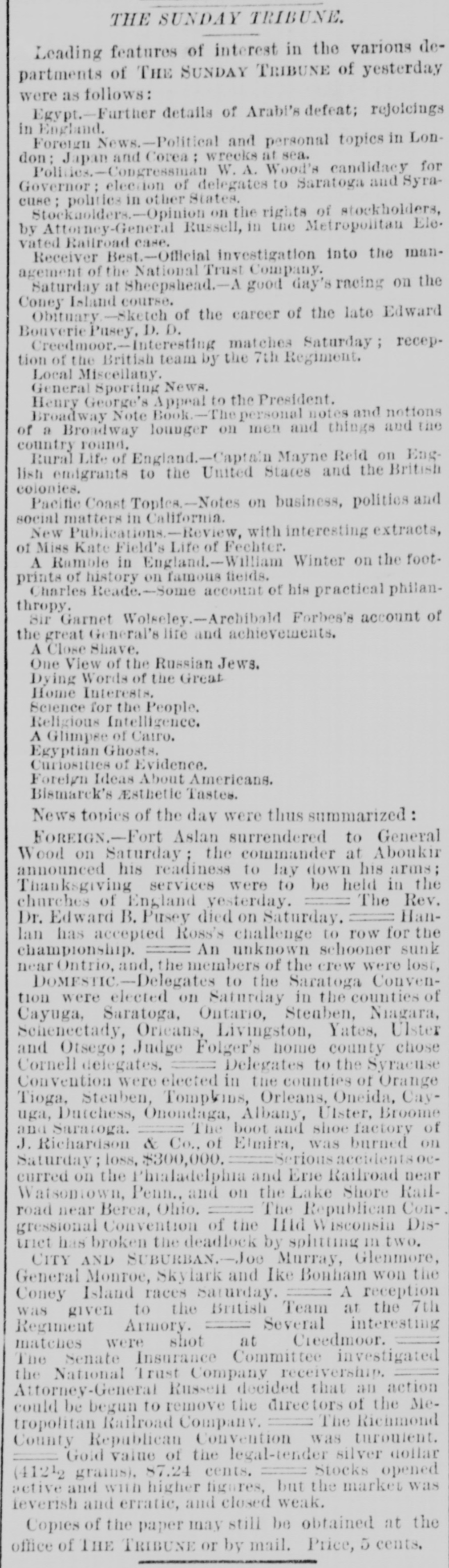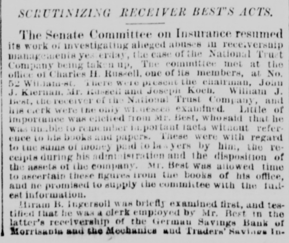 Hubbani. Worcester, Meas Gilsey House-Colonel J. W. Barlow, U.S.A. NEW-YORK CITY. The Rev. H.J. Satterlee will enter upon his duties as Rector of Calvary Church next Sunday. No nominations for Police or Park Commissioners were sent to the Board of Aldermen yesterday by the Mayor. Buildings reported unsafe yesterday Nos. 11 Clinton-st. West Thirty-seventh-st. and 384 East One-hundred-and-fourteenth-at. rear. WANTING THE MODERN LANGUAGES RETAINED. A perition is circulated among the students of Columbia College, asking the trustees not to abolish the study of modern languages. Such a proposition is now before the trustees. DYING IN A POLICE STATION CELL. Henry Fisch, a laborer of No. 188 Mott-st. locked up in the Mulberry-street Police station was Monday night for being drunk. He was dead in his cell yesterday morning. His death found attributed to heart disease. WANTING A SITE FOR A NEW POLICE STATION. The Police Board yesterday passed a resolution asking the Commissioners of the Sinking Fund to apart the ground now occupied by old Franklin Market, in Old Slip, as a site for new police station. The premises at No. 52 and 54 New-st. are rented. GALES AND ICEBERGS AT SEA. The steamship Daniel Steiremann, from Antwerp, which arrived yesterday, had a voyage of unusual violence, and on April 25, in latitude 45 57 north, lo: gitude 43° 42 west, a large iceberg was passed. On the following day sixteen large icebergs, and icefield about a mile long, were passed within a dis- an tauce of 100 miles. BASE BALL AT THE POLO GROUNDS. The Metropolitans and Atlantics of Brooklyn played their first game of base ball at the Polo Grounds yesterday. The attendance was small. The score by innings was as follows: Metropolitan Atlantic RECEPTION OF A LADIES' ASSOCIATION. for The Ladies' Association of the House of Rest Consumptives, at Tremont, held their annual reception yesterday, The house has now 33 inmates, received last year 51 died and 30 were discharged. The house is supported by voluntary contributions. ACTIVITY IN REAL ESTATE. The record of transactions at the Register's office shows extraordinary activity in real estate, There has been a steady increase of sales for months and there is still demand for desirable property. Yesterday 159 transactions aggregating $3,000,000, and 119 mortgages, representing nearly $2,000,000, were recorded and filed. OPENING OF THE COACHING SEASON. The coaching season was opened on Monday with the trip of Colonel Delancey Kane's Taliy-ho, which will leave the Hotel Brunswick at 10:30 a m. daily, during the season, for Pelham and return. The Tantivy will begin running to Yonkers from the Brunswick on Monday next, and will start daily at 11:30 m. PETROLEUM EXCHANGE MEETING. The annual meeting of the Petroleum Exchange as held yesterday, when all of the present officers were renominated for election. The membership the Exchange is at present 201 the certificates of of membership, which were worth $100 a year now sell for $2,500. Treasurer H. M. Curtis ago, reported an increase of receipts above expenses of $20,000. THE NATIONAL TRUST COMPANY'S AFFAIRS. Deputy Attorney-General Keeler on Monday made motion in the Supreme Court. Chambers, in the case of the people against the National Trust Company to compel William J. Best, the receiver, to render a final accounting of his trust and pay a final dividend to the creditors. Judge Donohue reserved his decision, THE ALDERMEN AND THE DOCK DEPARTMENT. a Mayor Grace has sent to the Board of Aldermen veto of its report with reference to the lease of Pier No. 1 and its recommendation that the Legislature curtail the powers of the Department of Docks, os the ground that there: are several bills now before the Legislature affecting the Department of Docks, and the report of the Aldermen does not designate which of the bills is favored. ERECTION OF A NEW CHURCH BUILDING. noon Religious services were held on Monday at at Lexington-ave and Twenty-third-st., in connection with the beginning of the erection of the new building for the Stanton Street Baptist Church, the Rev. H. O. Hiscox pastor. It is expected that the building will be ready for occupancy about December 1. Until that time the church will continue to worship every Sunday at Association Hall, Fourth-ave and Twenty-third-st, NO LIGHT ON THE EXPLOSIVE PACKAGES. The Post Office officials continued yesterday the investigation in regard to the explosive packages sent by mail to Messrs. Vanderbilt and Field, but no new discoveries were made. The pasteboard boxes in which the explosive substances were put have not been recognized as similar to any in use in this country, and paper-box manuf urerssav that are of German make. It has not been ascertained which of the collectors brought the boxes to the General Office. LETTERS GRANTED BY THE SURROGATE Surrogate Rollins yesterday granted letters of administration to Mr. Menzen on the estate of his daughter Marv. who was recently killed on the Sixth Avenue Elevated Railway. The child's tate is valued at $2,500. Letters of administration a were also granted on the estate of Charles P. Miller, who was shot and killed by William Tracey in liquor shop in Broadway. The value of the estate is $1,500. PAYING DUTIES AFTER SEVERAL YEARS. A check for $87 ived by Collector Robertson yesterday. The person whose name was on the check was a passenger, several years ago, on steamship arriving at this port. In his baggage a were some silks and laces which, he thought at the time, were not subject toduty. After long time has been discovered that the bringing of the articles here was an infringement of the laws, and the senger now pays the sum of money which, he tays, pashe believes is due to the Government, WORK OF PILOT COMMISSIONERS At the session of the Pilot Commissioners yesterday, Pilots George Seeth and Electus Comfort, the former of whom had charge of the steamer Clyde, and the latter of the Nankin, at the time of the collision on Friday last, were e