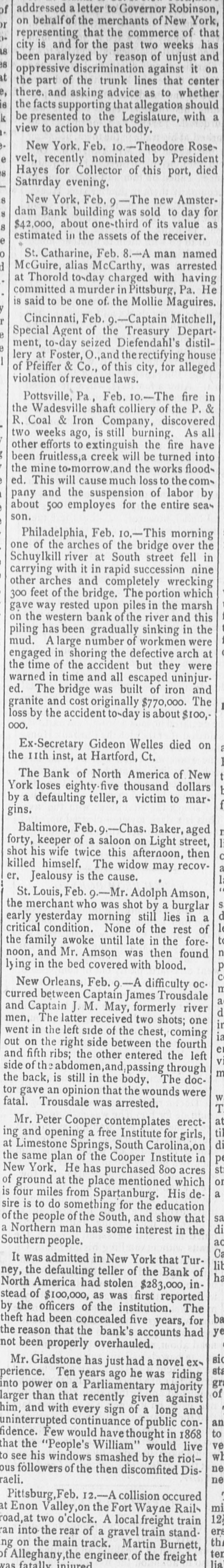 of addressed a letter to Governor Robinson, on behalfof the merchants of New York, representing that the commerce of that city is and for the past two weeks has been paralyzed by reason of unjust and oppressive discrimination against it on at the part of the trunk lines that center there. and asking advice as to whether the facts supporting that allegation should be presented to the Legislature, with a view to action by that body. New York. Feb. 10.-Theodore Rosevelt, recently nominated by President Hayes for Collector of this port, died Satnrday evening. New York, Feb. 9 -The new Amsterdam Bank building was sold to day for $42,000, about one-third of its value as estimated in the assets of the receiver. St. Catharine, Feb. 8.-A man named McGuire, alias McCarthy, was arrested at Thorold tosday charged with having committed a murder in Pittsburg, Pa. He is said to be one of. the Mollie Maguires. Cincinnati, Feb. 9.-Captain Mitchell, Special Agent of the Treasury Department, to-day seized Diefendahl's distillery at Foster, O. and therectifying house of Pfeiffer & Co., of this city, for alleged violation of revenue laws. Pottsville, Pa, Feb. 10.-The fire in the Wadesville shaft colliery of the P. & R. Coal & Iron Company, discovered two weeks ago, is still burning. As all other efforts to extinguish the fire have been fruitless,a creek will be turned into the mine to-morrow and the works floods ed. This will cause much loss to the coms pany and the suspension of labor by about 500 employes for the entire seas son. Philadelphia, Feb. 10.-This morning one of the arches of the bridge over the Schuylkill river at South street fell in carrying with it in rapid succession nine other arches and completely wrecking 300 feet of the bridge. The portion which gave way rested upon piles in the marsh on the western bank of the river and this piling has been gradually sinking in the mud. A large number of workmen were engaged in shoring the defective arch at the time of the accident but they were warned in time and all escaped uninjured. The bridge was built of iron and granite and cost originally $770,000. The loss by the accident to-day is about $100,000. Ex-Secretary Gideon Welles died on the 11th inst, at Hartford, Ct. The Bank of North America of New t York loses eighty-fiv thousand dollars b by a defaulting teller, a victim to marf gins. Baltimore, Feb. 9.-Chas. Baker, aged forty, keeper of a saloon on Light street, shot his wife twice this afternoon, then C a killed himself. The widow may recover. Jealousy is the cause. St. Louis, Feb. 9.-Mr. Adolph Amson, S the merchant who was shot by a burglar d early yesterday morning still lies in a le critical condition. None of the rest of to the family awoke until late in the foren noon, and Mr. Amson was then found p lying in the bed covered with blood. C New Orleans, Feb. 9-A difficulty OC. m curred between Captain James Trousdale a and Captain J. M. May, formerly river d men, The latter received two shots; one in went in the left side of the chest, coming ia out on the right side between the fourth el and fifth ribs; the other entered the left VI side of th abdomen,a passing through m the back, is still in the body. The doctor gave an opinion that the wounds were W fatal. Trousdale was arrested. T at Mr. Peter Cooper contemplates erecttil ing and opening a free Institute for girls, di at Limestone Springs, South Carolina,on personal the same plan of the Cooper Institute in st: New York. He has purchased 800 acres or of ground at the place mentioned which a is four miles from Spartanburg. His desire is to do something for the education sa of the people of the South, and show that a Northern man has some interest in the di ao Southern people. Ca It was admitted in New York that Turlib ney, the defaulting teller of the Bank of ha North America had stolen $283,000, instead of $100,000, as was first reported by the officers of the institution. The ba theft had been concealed five years, for the reason that the bank's accounts had ye not been properly overhauled. sio Mr. Gladstone has just had a novel exsta perience. Ten years ago he was riding gra into power on a Parliamentary majority of larger than that recently given against him, and with every sign of a long and an uninterrupted continuance of public conto fidence. Few would have thought in 1868 ve that the "People's William" would live wh to see his windows smashed by the riotne ous followers of the then discomfited Disraeli. ne Pittsburg Feb. 12.-A collision occured mi at Enon Valley,on the Fort Wayne Rails 12, road,at two 0 clock. A local freight train ers an into the rear of a gravel train standth ng on the main track. Martin Burnett, ten of Alleghany the engineer of the freight lia was fatally injured