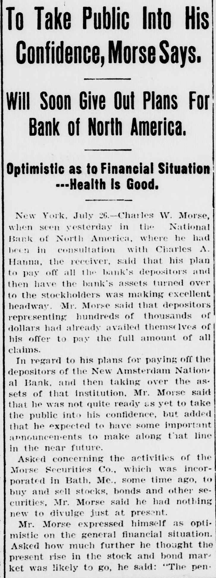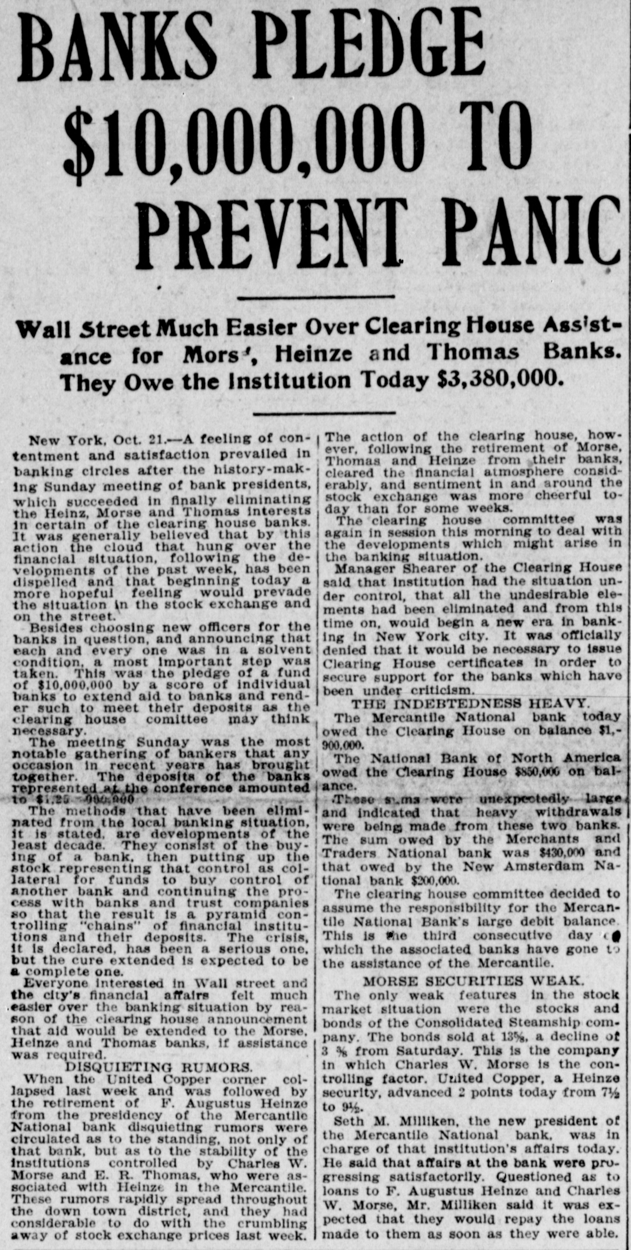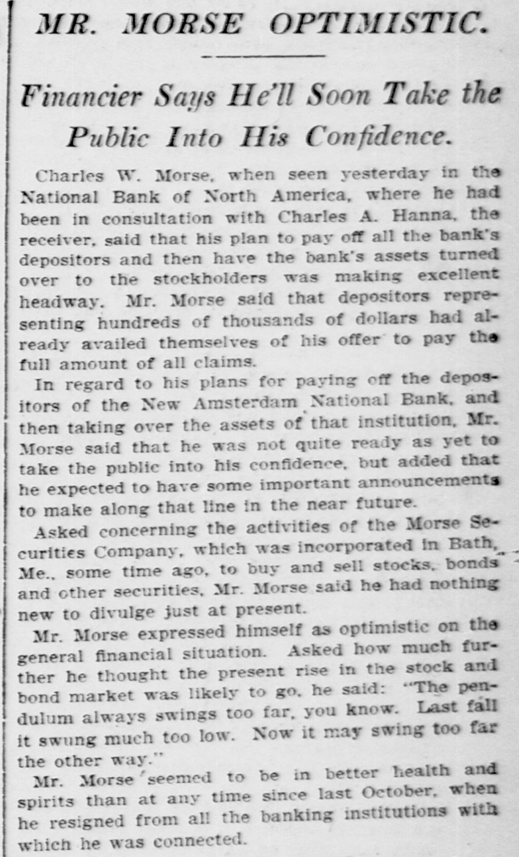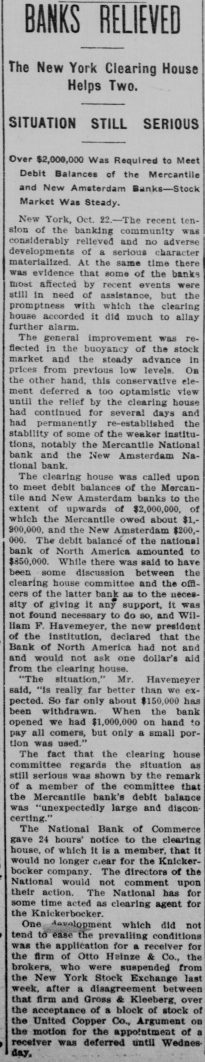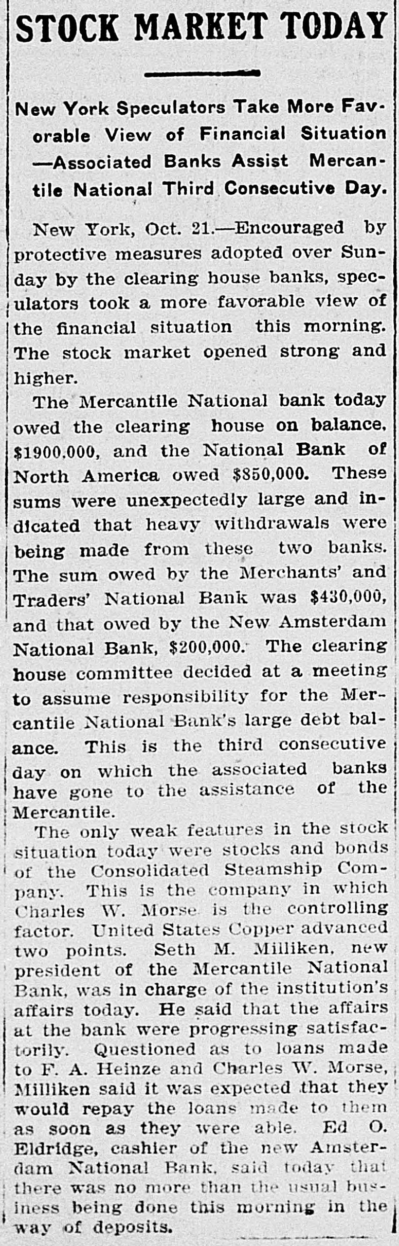 STOCK MARKET TODAY New York Speculators Take More Favorable View of Financial Situation -Associated Banks Assist Mercantile National Third Consecutive Day. New York, Oct. -Encouraged by protective measures adopted over Sunday by the clearing house banks, speculators took a more favorable view of the financial situation this morning. The stock market opened strong and higher. The Mercantile National bank today owed the clearing house on balance, $1900.000, and the National Bank of North America owed $850,000. These sums were unexpectedly large and indicated that heavy withdrawals were being made from these two banks. The sum owed by the Merchants' and Traders' National Bank was $430,000, and that owed by the New Amsterdam National Bank, $200,000. The clearing house committee decided at a meeting to assume responsibility for the Mercantile National Bank's large debt balance. This is the third consecutive day on which the associated banks have gone to the assistance of the Mercantile. The only weak features in the stock situation today were stocks and bonds of the Consolidated Steamship Company. This is the company in which Charles W. Morse is the controlling factor. United States Copper advanced two points. Seth M. Milliken, new president of the Mercantile National Bank, was in charge of the institution's affairs today. He said that the affairs at the bank were progressing satisfactorily. Questioned as to loans made to F. A. Heinze and Charles W. Morse, Milliken said it was expected that they would repay the loans made to them as soon as they were able. Ed O. Eldridge, cashier of the new Amsterdam National Bank, said today that there was no more than the usual business being done this morning in the way of deposits.