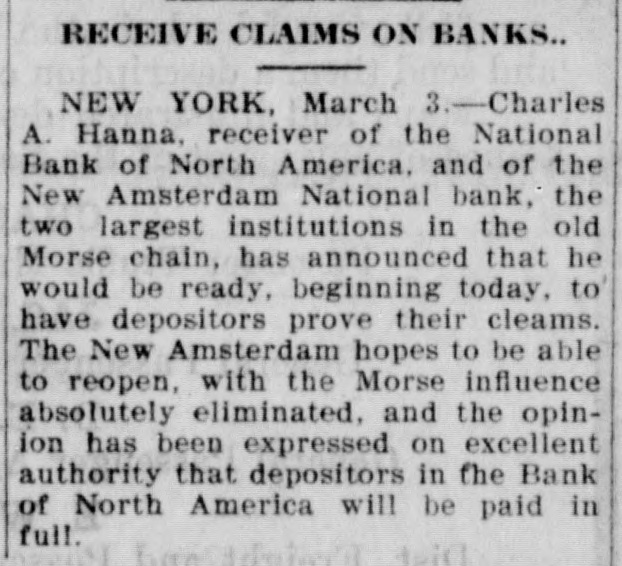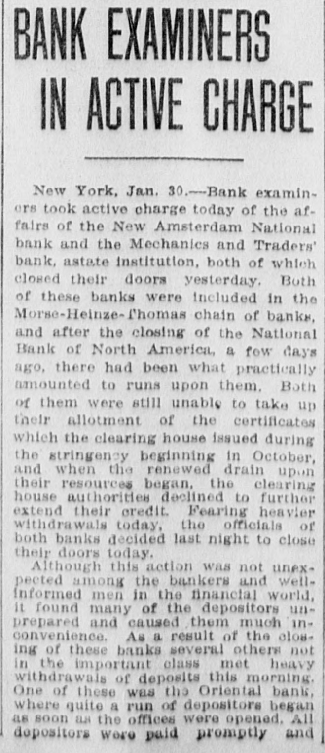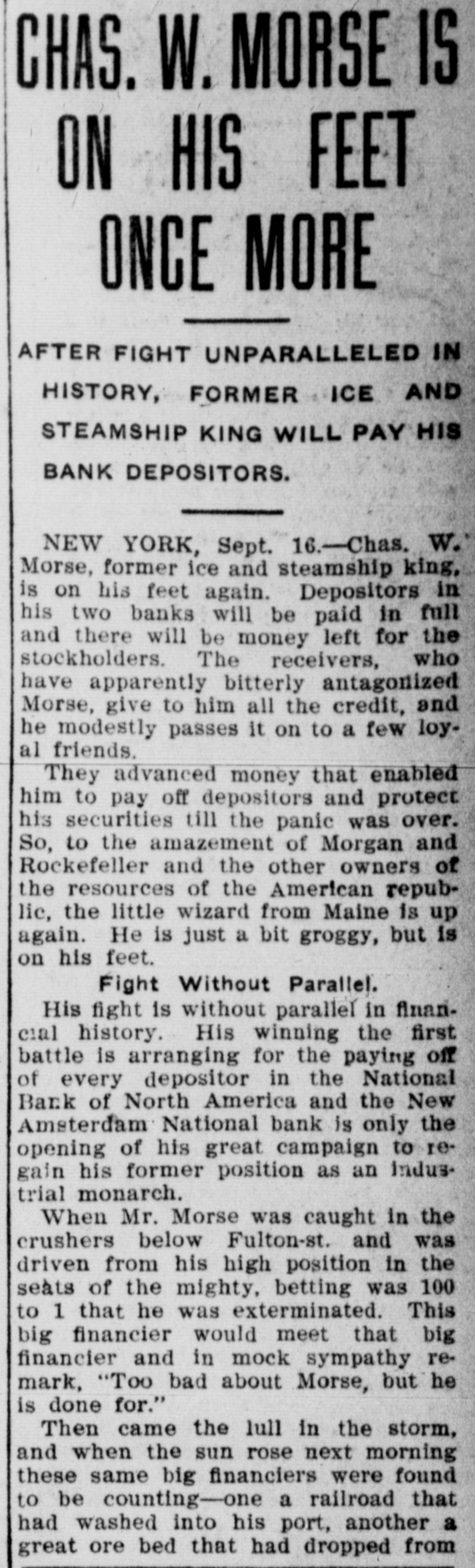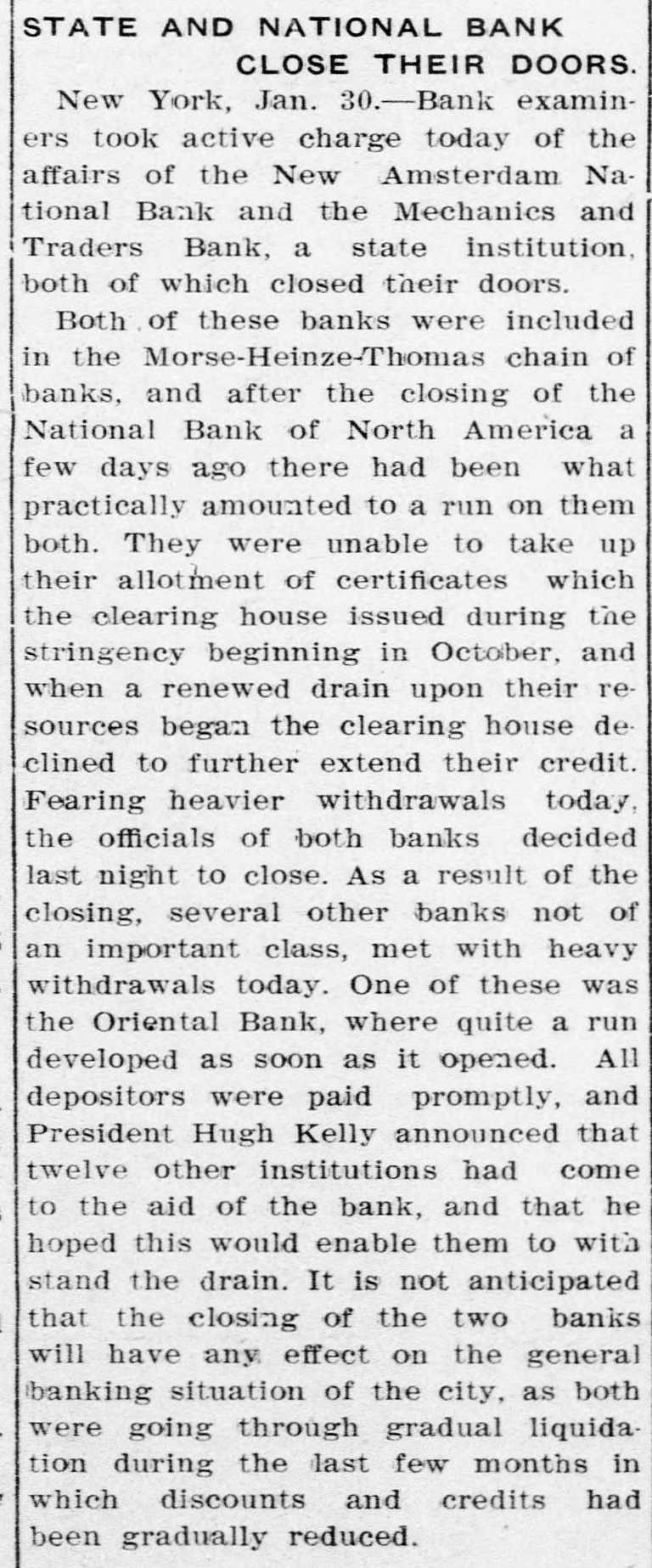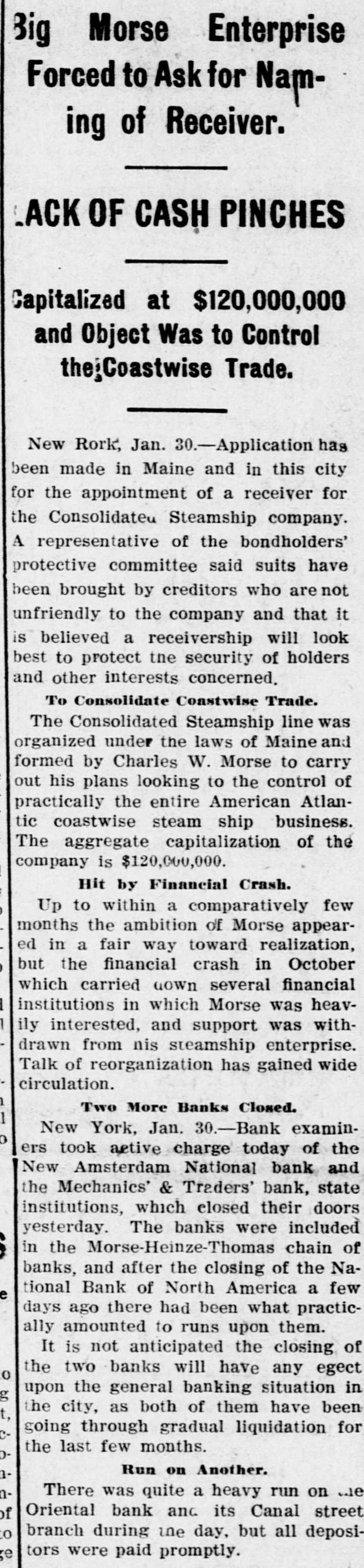 STOCK MARKET TODAY New York Speculators Take More Favorable View of Financial Situation -Associated Banks Assist Mercantile National Third Consecutive Day. New York, Oct. -Encouraged by protective measures adopted over Sunday by the clearing house banks, speculators took a more favorable view of the financial situation this morning. The stock market opened strong and higher. The Mercantile National bank today owed the clearing house on balance, $1900.000, and the National Bank of North America owed $850,000. These sums were unexpectedly large and indicated that heavy withdrawals were being made from these two banks. The sum owed by the Merchants' and Traders' National Bank was $430,000, and that owed by the New Amsterdam National Bank, $200,000. The clearing house committee decided at a meeting to assume responsibility for the Mercantile National Bank's large debt balance. This is the third consecutive day on which the associated banks have gone to the assistance of the Mercantile. The only weak features in the stock situation today were stocks and bonds of the Consolidated Steamship Company. This is the company in which Charles W. Morse is the controlling factor. United States Copper advanced two points. Seth M. Milliken, new president of the Mercantile National Bank, was in charge of the institution's affairs today. He said that the affairs at the bank were progressing satisfactorily. Questioned as to loans made to F. A. Heinze and Charles W. Morse, Milliken said it was expected that they would repay the loans made to them as soon as they were able. Ed O. Eldridge, cashier of the new Amsterdam National Bank, said today that there was no more than the usual business being done this morning in the way of deposits.