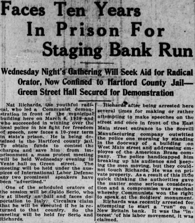 Faces Ten Years In Prison For Staging Bank Run Wednesday Night's Gathering Will Seek Aid for Radical Orator, Now Confined to Hartford County JailGreen Street Hall Secured for Demonstration Nat Richards, the youthful radical, who led Communist demonstration in front of the municipal *building here on March 6, and who succeeeded in winning over the local police in his fight for freedom of speech, now faces year term state's prison. He is being detained in the Hartford county jail. To obtain funds to contest the charges and save him from immass meeting will be held evening in Vente on Green street. The meeting will be held under the auspices of International Labor Defense any two prominent speakers have been "advertised. One of the scheduled orators of the session will be Guido Serio, who at liberty on ball and faces deItaly: Circulars claim that he will be executed if he turned to that country. So the meeting will be held for Serio and after being arrested here several times for making or rather attempting to make speeches on the street and once in front of the East Main street entrance to the Scovill Manufacturing company outwitted the police morning by standing in the of building on est Main street and addressing employes of the American Brass company The police handicapped him breaking up his audience and keepIng the men moving, but they couldnot touch Richards, He was on private property. result of this little quick thinking the authorities gave the matter some serious consideration and a compromise was reached whereby Communists won the right to speak the Soldiers' monument. Richards was recently arrested for attempting to start "run" on New Britain bank. It was the "Interest' of his labor movement, It was claimed.