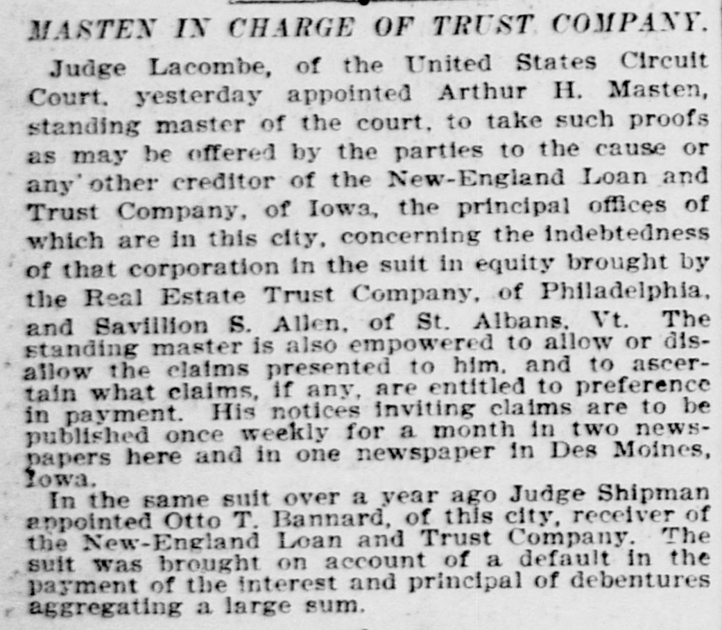 MASTEN IN CHARGE OF TRUST COMPANY. Judge Lacombe, of the United States Circuit Court. yesterday appointed Arthur H. Masten, standing master of the court. to take such proofs as may be offered by the parties to the cause or any' other creditor of the New-England Loan and Trust Company, of Iowa, the principal offices of which are in this city, concerning the indebtedness of that corporation in the suit in equity brought by the Real Estate Trust Company, of Philadelphia, and Savillion S. Allen, of St. Albans, Vt. The standing master is also empowered to allow or disallow the claims presented to him. and to ascertain what claims, if any, are entitled to preference in payment. His notices inviting claims are to be published once weekly for a month in two newspapers here and in one newspaper in Des Moines, Iowa. In the same suit over a year ago Judge Shipman appointed Otto T. Bannard, of this city, receiver of the New-England Loan and Trust Company. The suit was brought on account of a default in the payment of the interest and principal of debentures aggregating a large sum.