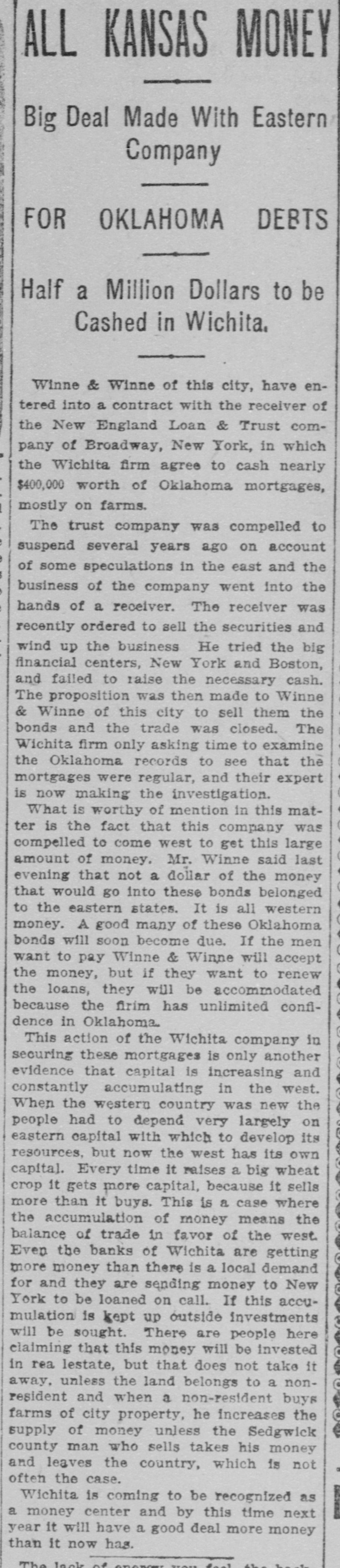 ALL KANSAS MONEY Big Deal Made With Eastern Company FOR OKLAHOMA DEBTS Half a Million Dollars to be Cashed in Wichita. Winne & Winne of this city, have entered into a contract with the receiver of the New England Loan & Trust company of Broadway, New York, in which the Wichita firm agree to cash nearly $400,000 worth of Oklahoma mortgages, mostly on farms. The trust company was compelled to suspend several years ago on account of some speculations in the east and the business of the company went into the hands of a receiver. The receiver was recently ordered to sell the securities and wind up the business He tried the big financial centers, New York and Boston, and failed to raise the necessary cash. The proposition was then made to Winne & Winne of this city to sell them the bonds and the trade was closed. The Wichita firm only asking time to examine the Oklahoma records to see that the mortgages were regular, and their expert is now making the investigation. What is worthy of mention in this matter is the fact that this company was compelled to come west to get this large amount of money. Mr. Winne said last evening that not a dollar of the money that would go into these bonds belonged to the eastern states. It is all western money. A good many of these Oklahoma bonds will soon become due. If the men want to pay Winne & Winne will accept the money, but if they want to renew the loans, they will be accommodated because the firim has unlimited confidence in Oklahoma. This action of the Wichita company in securing these mortgages is only another evidence that capital is increasing and constantly accumulating in the west. When the western country was new the people had to depend very largely on eastern capital with which to develop its resources, but now the west has its own capital. Every time it raises a big wheat crop it gets more capital, because it sells more than it buys. This is a case where the accumulation of money means the balance of trade in favor of the west. Even the banks of Wichita are getting more money than there is a local demand for and they are sending money to New York to be loaned on call. If this accumulation is kept up outside investments will be sought. There are people here claiming that this money will be invested in rea lestate, but that does not take it away, unless the land belongs to a nonresident and when a non-resident buys farms of city property, he increases the supply of money unless the Sedgwick county man who sells takes his money and leaves the country, which is not often the case. Wichita is coming to be recognized as a money center and by this time next year it will have a good deal more money than it now has. The look of BEAU 4h.
