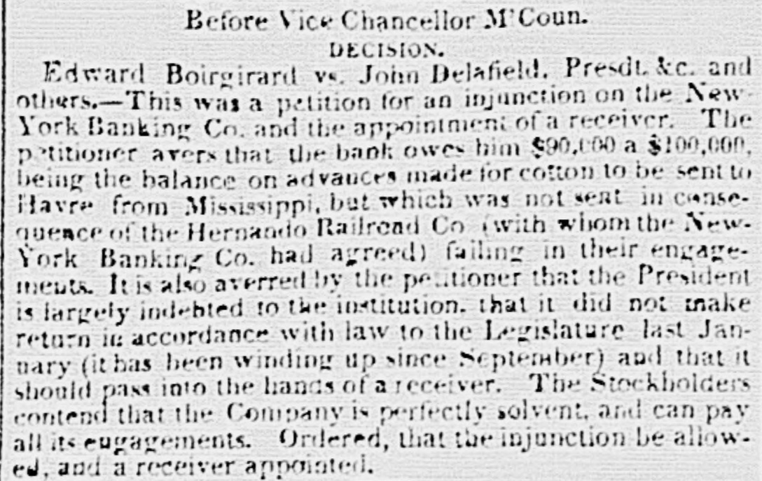 Vice Chancellor's Court. Before Vice Chancellor McCoun. DECISION. March 19 - Edward Boirgirard vs. John Delafield, President of the New York Banking Co, and others.-This was a motion for an injunction on the New York Banking Company, and the appointment of a receiver. In 1839 the Company agreed to loan the Hernando Railroad Cd pany, Mississippi, $200,000, ment for which was to be made in cotton, to be shipped to Mr Delafield. Joachim Hydecker, agent for the house of Boi affi, Boirgirard & Co., of Havre, agreed with the New York Banking Com. pany to advance the $200,000 to latter, and have the cot. ton sent to said house at Havre. He advanced $150,000, the Company being responsible for such; but only 182 bales of cotton were sent, when the Mississippi Company failed in its contract. A very small amount of money was remitted by the New York Banking Company, and a balance of $90,000 to $100,000 remains due to Bonaffi, Boirgirard & Co., of which house complainant was a member. He petitions for an injunction on the bank on the ground that it had failed in paying him his money; has ceased to do business; (it has been closing up for some months) did not make proper return to the Legislature agreeable to law. and in its return placed a debt for $110,000, due by Mr. Hubbard, President of the Columbus Insurance Co., Ohio, down as a portion of its good assets, but immediately afterwards took $40,000 in pay ment for the debt. Petitioner avers, also, that the directors have expressed an intention of placing the bank in other and strange hands, but even if they do not, justice to the creditors require the appointment of a receiver, as Mr. Delafield himself is indebted to the company in a large amount, being something like $69,000. The petition is opposed on the ground that the complainant is not a creditor of the company, his contract having been signed by the President alone, whereas the law requires that such contracts should be signed by both President and Cashier. The stockholders also aver that the Com. pany is not insolvent, and will be able to pay all de mands against it, and have a handsome surplus, provided the bank does not gointo the hands of a receiver. The Vice Chancellor, in giving his decision, showed that this court had power by law over the Free Banking institutions, treating them as incorporations. As to the objaction that the contract is signed only by the president, he thought it might stand as a defence in an action at law, but did not think this court, in its powers of equity, bound by it. The contract was evidently made by Mr. Dalafield on behalf of the bank, which was to get a profit on the sales of cotton sent to Havre, and actually received the money from complainment. Independant of this it had failed in making a proper return of its condition agreeably to the law of 1841, which requires all free banks to present a return'i January giving their situation then, and also their condition in the July previous. This is a wholesome9aw, and one which they should strictly be held to, and a way by which the free banks may be made useful and safe to the public. The Court considers the complainant entitled to come in as a creditor. Ordered, that the injunction be allowed, and a receiver appointed.