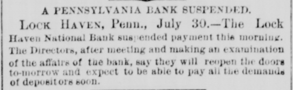 It is thought that the suspension of the Lock Haven National Bank will be but temporary, and that depositors will get all that is due them, dollar for dollar. We anxiously hope the prediction may be verified. The business interests of Lock Haven have suffered severely for several years past, and to have their best bank go under at this time would be a severe stroke indeed.