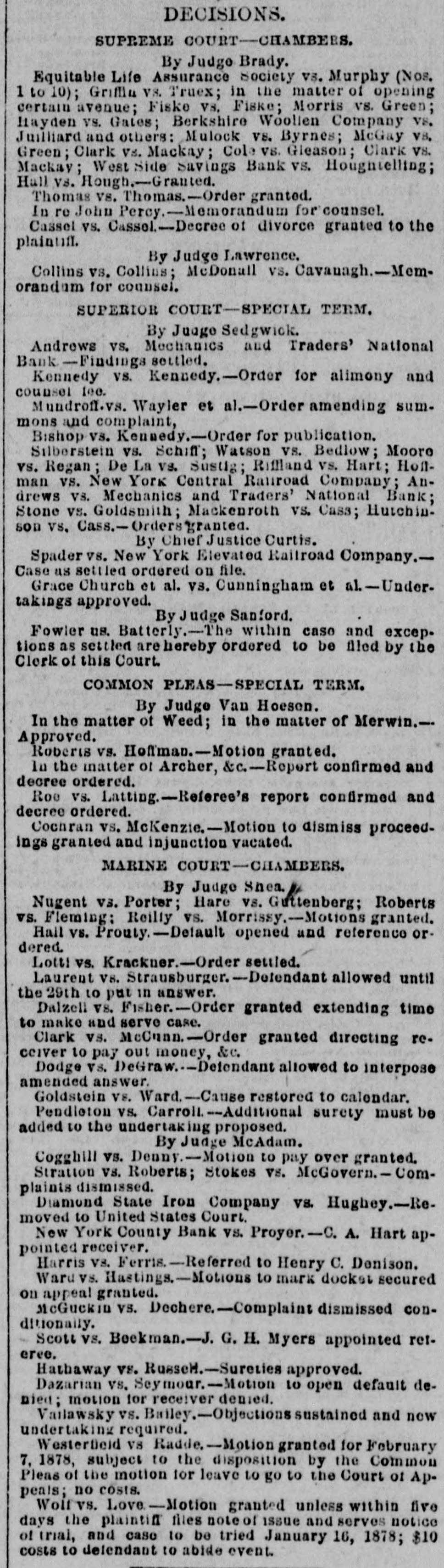 DECISIONS. SUPREME COURT-CHAMBERS. By Judge Brady. Equitable Life Assurance Society VS. Murphy (Nos. 1 to 10); Griffin vs. Truex; in the matter of opening certain avenue; Fiske vs. Fiske; Morris vs. Green; Hayden vs. Gates; Berkshire Woolien Company vs. Juilliard and others: Mulock vs. Byrnes; McGay VS. Green; Clark Vs. Mackay; Cole vs. Gleason; Clark VS. Mackay; West Side Savings Bank VS. Houghtelling; Hall vs. Hough.-Granted. Thomas vs. Thomas.-Order granted. In re John Percy.-Memorandum forcounsel. Cassel vs. Cassel.-Decree of divorce granted to the plaintiff. By Judge Lawrence. Collins vs. Collins; McDonall vs. Cavauagh.-Memorandum for counsel. SUPERIOR COURT-SPECIAL TERM. By Juage Sedgwick. Andrews vs. Mechanics and Traders' National ank - Findings settled. Kennedy vs. Kennedy.-Order for alimony and counsel fee. Mundroff.vs. Wayler et al.-Order amending summons and complaint, Bishop vs. Kennedy.—Order for publication. Silberstein vs. Schiff; Watson vs. Bedlow; Moore vs. Regan; De La vs. Sustig; Riffland vs. Hart; Hoffman vs. New York Central Rairoad Company; Andrews vs. Mechanics and Traders' National Bank; Stone vs. Goldsmith; Mackenroth vs. Cass; Hutchinson vs. Cass.-Ordersgranted. By Chief Justice Curtis. Spader VS. New York Elevated Raitroad Company.Case as settled ordered on file. Grace Church et al. vs. Cunningham et al.-Undertakings approved. By Judge Sanford. Fowler us. Batterly.-The within caso and exceptions as settled rehereby ordered to be filed by the Clerk of this Court. COMMON PLEAS-SPECIAL TERM. By Judge Van Hoesen. In the matter ot Weed; in the matter of Merwin.Approved. Roberts vs. Hoffman.-Motion granted. In the matter of Archer, &c.-Report confirmed and decree ordered. Roe vs. Latting.-Referee's report confirmed and decree ordered. Cochran vs. McKenzie.,-Motion to dismiss proceedings granted and injunction vacated. MARINE COURT-CHAMBERS. By Judge Shea. Nugent vs. Porter; Hare vs. Guttenberg; Roberts VS. Fleming: Reiliy vs. Morrissy.-Motions granted. Hall vs. Prouty.-Default opened and reference ordered. Lotti vs. Krackuer.-Order settled. Laurent vs. Strausburger.-Detendant allowed until the 29th to put in answer. Dalzell vs. Fisher.-Order granted extending time to make and serve case. Clark vs. McCunn.-Order granted directing receiver to pay out money, &c. Dodge vs. DeGraw.--Detendant allowed to interpose amended answer. Goldstein vs. Ward.-Cause restored to calendar. Pendleton vs. Carrolt--Additional surety must be added to the undertaking proposed. By Judge McAdam. Cogghill vs. Denny.-Motion to pay over granted. Stratton vs. Roberts; Stokes VS. McGovern.-Complaints dismissed. Diamond State Iron Company vs. Hughey.-Removed to United States Court. New York County Bank vs. Proyer.-C. A. Hart appointed receiver. Harris vs. Ferris.-Referred to Henry C. Denison. Ward vs. Hastings-Motions to mark docket secured on appeal granted. McGuckin vs. Dechere.-Complaint dismissed conditionally. Scott vs. Beekman.-J. G. H. Myers appointed reteree. Hathaway vs. RusseM.-Sureties approved. Dazarian VS. Seymour.-Motion to open default denied; motion for receiver denied. Vailawsky vs. Bailey.-Objections sustained and new undertaking required. Westerfield vs Radde,-Motion granted for February 7, 1878, subject to the disposition by the Common Pleas of the motion for leave to go to the Court of Appeals; no costs. Wolf vs. Love - Motion granted unless within five days the plaintiff files note of issue and serves notice of trial, and case to be tried January 16, 1878; $10 costs to defendant to abide event.