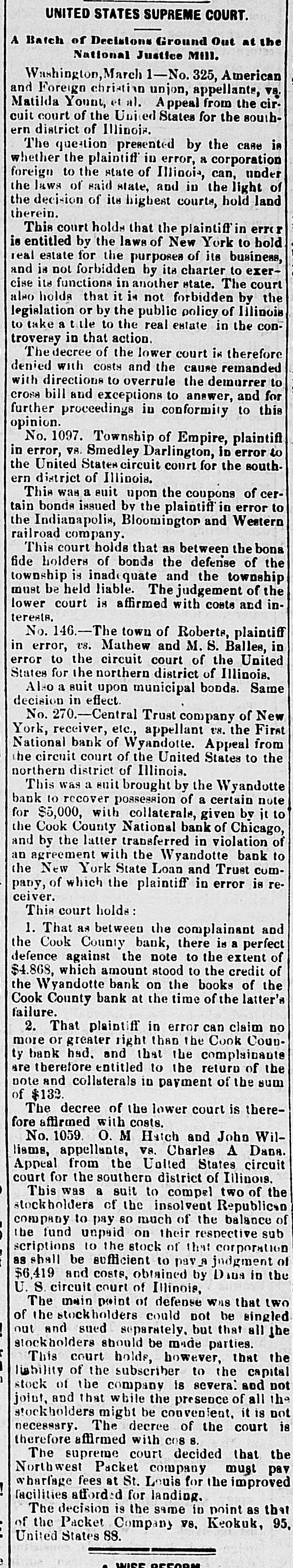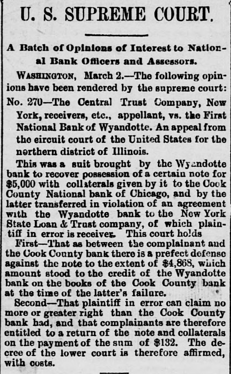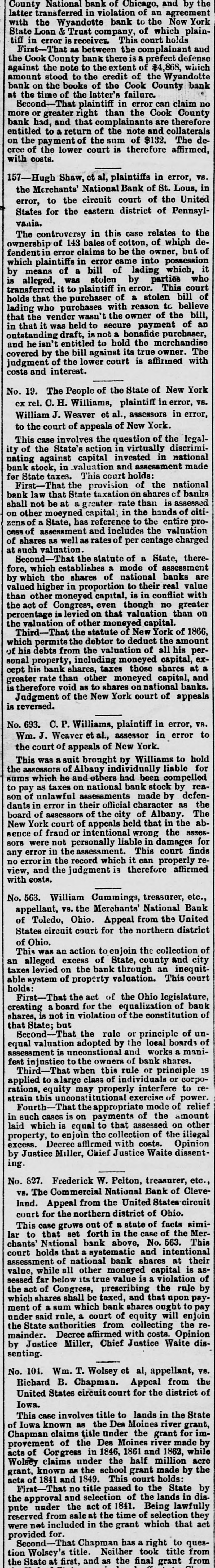 County National bank of Chicago, and by the latter transferred in violation of an agreement with the Wyandotte bank to the New York State Loan & Trust company, of which plaintiff in error is receiver. This court holds First-That as between the complainant and the Cook County bank there is a prefect defense against the note to the extent of $4,868, which amount stood to the credit of the Wyandotte bank on the books of the Cook County bank at the time of the latter's failure. Second-That plaintiff in error can claim no more or greater right than the Cook County bank had, and that complainants are therefore entitled to a return of the note and collaterals on the payment of the sum of $132. The decree of the lower court is therefore affirmed, with costs. 157-Hugh Shaw, et al, plaintiffs in error, VS. the Merchants' National Bank of St. Lous, in error, to the circuit court of the United States for the eastern district of Pennsylvania. The controversy in this case relates to the ownership of 143 bales of cotton, of which defendent in error claims to be the owner, but of which plaintiffs in error came into possession by means of a bill of lading which, it 18 alleged, was stolen by parties who transferred it to plaintiff in error. This court holds that the purchaser of a stolen bill of lading who purchases with reason tc believe that the vender wasn't the owner of the bill, in that it was held to secure payment of an outstanding draft, is not a bonafide purchaser, and heisn't entitled to hold the merchandise covered by the bill against its true owner. The judgment of the lower court is affirmed with costs and interest. No. 19. The People of the State of New York ex rel. C.H. Williams, plaintiff in error, VS. William J. Weaver et al., assessors in error, to the court of appeals of New York. This case involves the question of the legality of the State's action in virtually discriminating against capital invested in national bank stock, in valuation and assessment made for State taxes. This court holds: First-That the provision of the national bank law that State taxation on shares of banks shall not be at a greater rate than is assessed on other moeyned capital; in the hands of citizens of a State, has reference to the entire process of assessment and includes the valuation of shares as well as rates of per centage charged at such valuation. Second-That the statute of a State, therefore, which establishes a mode of assessment by which the shares of national banks are valued higher in proportion to their real value than other moneyed capital, is in conflict with the act of Congress, even though no greater percentage is levied on that valuation than on the valuation of other moneyed capital. Third-That the statute of New York of 1866, which permits the debtor to deduct the amount of his debts from the valuation of all his personal property, including moneyed capital, except his bank shares, taxes those shares at a greater rate than other moneyed capital, and is therefore void as to shares on national banks. Judgment of the New York court of appeals is reversed. No. 693. C. P. Williams, plaintiff in error, VS. Wm. J. Weaver et al., assessor in error to the court of appeals of New York. This was a suit brought by Williams to hold the assessors of Albany individually liable for sums which he and others had been compelled to pay as taxes on national bank stock by reason of unlawful assessments made by defendants in error in their official character as the board of assessors of the city of Albany. The New York court of appeals held that in the absence of fraud or intentional wrong the 88866sors were not personally liable in damages for any error in the assessment. This court finds no error in the record which it can properly review, and the judgment is therefore affirmed with costs. No. 563. William Cummings, treasurer, etc., appellant, VS. the Merchants' National Bank of Toledo, Ohio. Appeal from the United States circuit court for the northern district of Ohio. This was an action to enjoin the collection of an alleged excess of State, county and city taxes levied on the bank through an inequitable system of property valuation. This court holds: First-That the act of the Ohio legislature, creating a board for the equalization of bank shares, is not in violation of the constitution of that State; but Second-That the rule or principle of unequal valuation adopted by the local boards of assessment is unconstional and works a manifest injustice to the owners of bank shares. Third-That when this rule or principle 18 applied to alarge class of individuals or corporations, equity may properly interfere to restrain this unconstitutional exercise of power. Fourth-That the appropriate mode of relief in such cases is on payments of the amount laid which is equal to that assessed on other property, to enjoin the collection of the illegal excess. Decree affirmed with costs. Opinion by Justice Miller, Chief Justice Waite dissenting. No. 827. Frederick W. Peiton, treasurer, etc., VS. The Commercial National Bank of Cleveland. Appeal from the United States circuit court for the northern district of Ohio. This case grows out of a state of facts similar to that set forth in the case of the Merchants' National bank above, No. 563. This court holds that a systematic and intentional assessment of national bank shares at their value, while all other moneyed capital is assessed far below its true value is a violation of the act of Congress, prescribing the rule by which shares shall be taxed, and that upon payment of a sum which bank shares ought to pay under said rule, a court of equity will enjoin the State authorities from collecting the remainder. Decree affirmed with costs. Opinion by Justice Miller, Chief Justice Waite dissenting. No. 104. Wm. T. Wolsey et al, appellant, VS. Richard B. Chapman. Appeal from the United States circuit court for the district of Iowa. This case involves title to lands in the State of Iowa kn