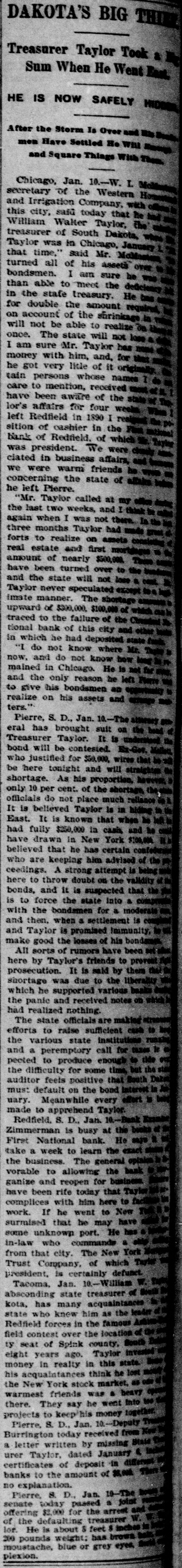 DAKOTA'S BIG THE Treasurer Taylor Took a Sum When He Went East. HE IS NOW SAFELY HIDDER After the Storm Is Over and as Bank Have Stttled : WILL I / and Square Things With Then, Chicago, Jan. 10.-W. I. secretary of the Western and Irrigation Company, with this city, said today that he William Walter Taylor, the treasurer of South Dakota, who Taylor was in Chicago, January that time," said Mr. turned all of his assets over bondsmen. I am sure be than able to meet the deficiency in the stafe treasury. He tas for double the amount required, on account of the shrinkage will not be able to realize in once. The state will not loss I am sure Mr. Taylor has money with him, and, for that he got very litle of it originally. tain persons whose names care to mention, received of have been aware of the state wf lor's affairs for four weeks Who left Redfield in 1890 I resigned the sition of cashier in the First national bank of Redfield. of which % was president. We were clossly clated in business affairs, and we were warm friends he - concerning the state of affairs In he left Pierre. "Mr. Taylor called at my office during the last two weeks, and I think be callet again when I was not there. In the three months Taylor had made great forts to realize on assets consisting real estate and first mortgages amount of nearly $500,000. These have been turned over to the bundetus and the state will not lose a cant. a Taylor never speculated except too legit imate manner. The shortage upward of $300,000, $100,000 of which cash traced to the failure of the n tional bank of this city and other bests in which he had deposited state funds. "I do not know where Mr. Taple # now, and do not know how long mained in Chicago. He is not for any, and the only reason he left Plane to give his bondsmen an opportunity to realize on his assets and arrange : ters." Pierre, S. D., Jan. 10.-The attorney eral has brought suit on the head Treasurer Taylor. It is understand the bond will be contested. Ex-Get. Mallets, who justified for $50,000, wires that be = be here tonight and will straighten the shortage. As his proportion, however, only 10 per cent. of the shortage, the state officials do not place much reliance It is believed Taylor is in hiding to East. It is known that when be left had fully $250,000 in cash and he casis have drawn in New York $100,000 BE believed that he has certain confederate who are keeping him advised of the R ceedings. A strong attempt is being here to throw doubt on the validity bonds, and it is suspected that the you is to force the state into & compress with the bondsmen for a moderate and then, when a settlement is completed and Taylor is promised Immunity, to make good the losses of his bondsmen. All sorts of rumors have been set the here by Taylor's friends to provent right prosecution. It is said by them the shortage was due to the liberality which he supported various banks the panic and received notes on which # had realized nothing. The state officials are makies attending efforts to raise sufficient cash to the various state institutions running and a peremptory call for taxes to pected to produce enough to ride OFF the difficulty for some time, but the auditor feels positive that South Dakes must default on the bond Interest in uary. Meanwhile every effort . being made to apprehend Taylor. Redfield. S. D., Jan. 10.-Bank Erande Zimmerman is busy at the books of First National bank. He says take a week to learn the exact the business. The general opinion vorable to allowing the bank ganize and reopen for business. have been rife today that Taylor complices with him here to work. If he went to New surmised that he may have some unknown port. He has in-law who commands a from that city. The New York Trust Company, of which Tayle president, is certainly defunct. to Tacoma. Jan. 10,-William absconding state treasurer of South kota, has many acquaintances leader state who knew him as the Redfield forces in the famous field contest over the location of ty seat of Spink county, South eight years ago. Taylor invested money in realty in this state. his acquaintances think he lost the New York stock market, as . heavy was warmest friends too there. They say he went Into projects to keephis money together. Pierre, S. D., Jan. 10.-Deputy Burrington today received from