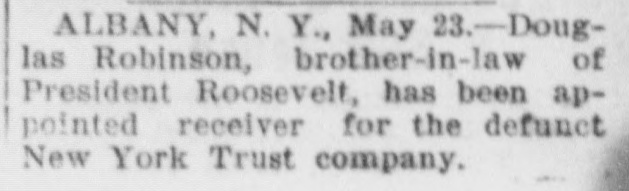 ALBANY, N. Y., May 23.—Doug- las Robinson, brother-in-law of President Roosevelt, has been ap- pointed receiver for the defunct New York Trust company.