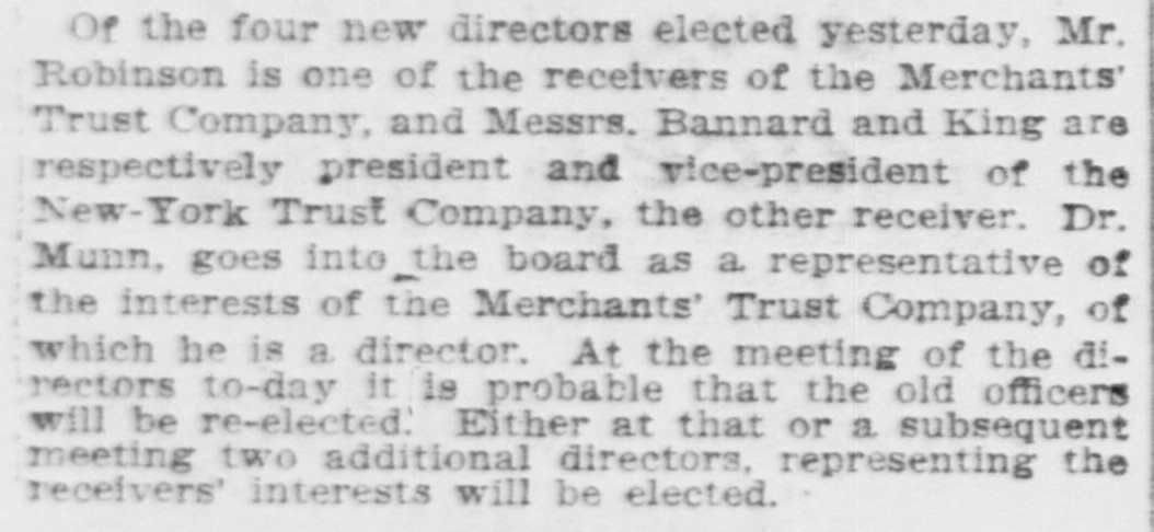 Of the four new directors elected yesterday, Mr. Robinson is one of the receivers of the Merchants' Trust Company, and Messrs. Bannard and King are respectively president and vice-president of the New-York Trust Company, the other receiver. Dr. Munn, goes into the board as a representative of the interests of the Merchants' Trust Company, of which he is a. director. At the meeting of the directors to-day It is probable that the old officers will be re-elected.' Either at that or a. subsequent meeting two additional directors, representing the receivers' interests will be elected.