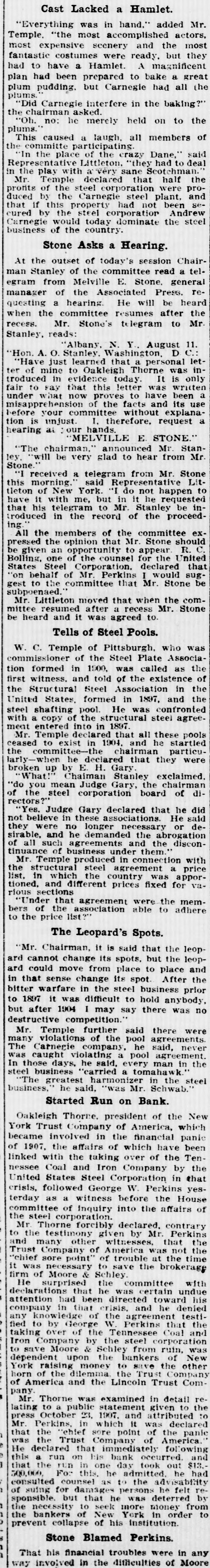 Mr. hand. Cast Lacked a Hamlet. added 'Everything was in accomplished actors. most expensive were ready. Temple. fantastic most "the costumes most Hamlet scenery and A magnificent the but they plan had to had have been a but prepared Carnegie to bake had a all great the plum plums pudding. Carnegie interfere in the baking? the the "Did chairman he asked. merely held on to This participating plums. Oh. no: caused a laugh. all members said of to deal committe the crazy Dane, had the In the ative place Littleton of sane "they Scotchma the in Represent the play with declared avery that were half proMr. Temple of the steel corporation steel plant. and sepronts duced by the property Carnegie had not tior been Andrew cured would country that if by this the steel today corporation dominate the steel Carnegie business of the ChairStone Asks a Hearing. session At the outset the of today's committee read general a telman Stanley of Melville E. Stone. rethe be egram from Associated Press. heard recess. manager questing a of committee hearing. resumes He will after to Mr the when the Mr. Stone's telegram Stanley. reads: 11 Y. August D Have It Hon. A. just o. Stanley. Albany learned Oakleigh Washington. that Thorne a personal was is only let- introduced ter of mine in evidence to this today letter have was written been a say that proves to and its use fair under to what now of the without facts explanabefore prehension your commi 1. therefore. request tion is unjust. our hands. E STONE. hearing ai MELVILLE Mr. StanThe will chairman. be very glad announced to hear Mr. from Stone Mr jey, Stone received a telegram presentative from happen Lit. to this morning New York. said 'I in do it not he request in- ed in :roduced tleton of with me, but Mr Stanley proceed- be that have his it telegram the record to of the excommittee ing All the members opinion of that the Mr appear Stone should R. C. pressed the opportunity counsel to for the United that "on be given one an of the Corporation. declared would sugto the committee Bolling, States behalf Steel of Mr. Perkins that Mr. Stone be the combe heard gest subpoenaed. Littleton moved that a recess when Mr. Stone mittee Mr. resumed and it after was agreed to Tells of Steel Pools. who Pittsburgh. W c. Temple of the Steel Plate Associa- as the commissioner of was called of tion witness. and Association the first Structural formed in Steel 1900. told of in the 1897. existence and in the the States. formed was confronted agreeUnited shafting pool ructural He steel steel copy of the in 1897 pools with a entered declared into that and all he these startled ment ceased Mr. comm Temple to exist declared in the 1904 chairman that they particu- were the larly when he E H. Gary. exclaimed. of the broken up by Chaiman Stanley the chairman disteel that "do What you mean corporation Judge Gary, board of he did rectors? Judge Gary associations. declared He or said de"Yes, believe in these longer necessar they and he reements and were no demanded the the discon not of of business in them... sirable all such under connection with and tinuance Mr Temple produced steel agreem ement was a appor- price sections the list. the in structural which different the country prices fixed for vamemof the list? bers to the price tioned. rious "Under that association agreement were able to adhere The Leopard's Spots. the that leop Chairman, it is spots. said but the leop- and ard cannot from place After bitter Mr. could move change change its its spot to place prior the ard sense steel business in to that 1897 warfare it 1904 was in I difficult the may say to hold there anybody was no but destructive after competition further said there reements were Mr. Temple violations of the pool he agree said, never ment. many The Carnerie violating company every pool man agre in the caught said, tomahaw was those days. he "carried a in the steel The said, "was In steel business greatest harmoni izer Mr. Schwab. business. he Run on Bank. New Started president of the which Oakleigh Thorne. of America, panic York Trust company in the financial have been became involved the affairs of over which of the Ten- the of 1907. the taking Company by linked with Coal and Iron Corporation in that nessee United States Steel George W. Perkins the House yescrisis. followed a witness before the affairs of terday as of inquiry into contrary the committee steel corl oration. forcibly given declared. by Mr that Perkins the Mr Thorne testimony witnesses not the the was time and Company of trouble brokerage "chief Trust to many sore necessary point other of to America save the at the with it was Moore & Schley the committee undue firm He larations of surprised that been he directed was certain and toward he denied his attention declaratic had that risis. agreeme that testi- the company in ledge of the Perkins Coal and any kno by George W Tennessee proporation fied taking to over of by the the steel from ruin, of New was Iron to save company Moore upon & Schley the to bankers save the Company other dependent York raisin dilemma money Lincoln the Trust Trust Comhorn America of the and the in detail the reof examined given to pany Thorne was statement and attributed to lating Mr. to a public 23. 1907. was declared panic October which of the rica. press Mr. Perkins. chief in sore point of America. following that the Trust Company immediately and was declared the that His bank occurred took out $13. had this He run run on in one he day admitted he subtity rethat the For this to the felt counsel as persons he by consulted 500,000 damage was deterred from of suing for but that he more money in order to the sponsible. bankers of to of New seek his York institution tion Stone in any prevent the collapse Blamed Perkins. were That his financial in the troubles difficulties of Moore way involved