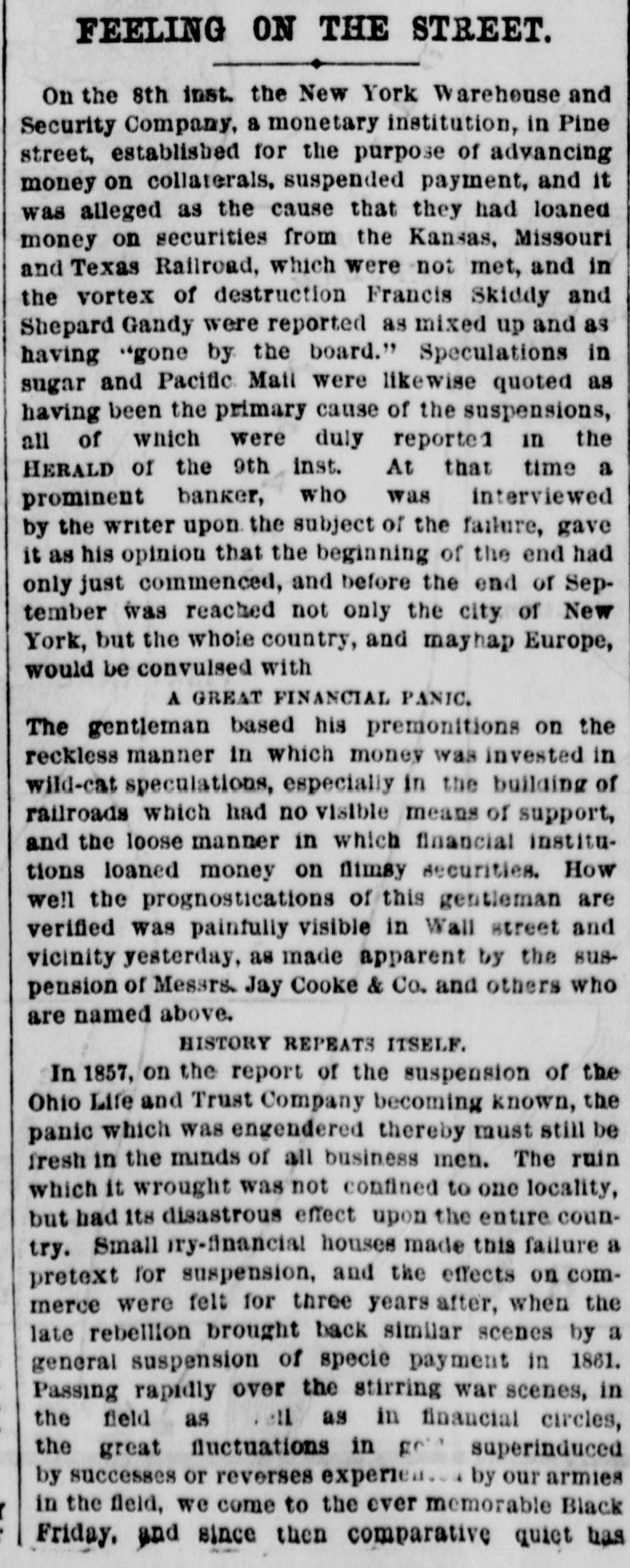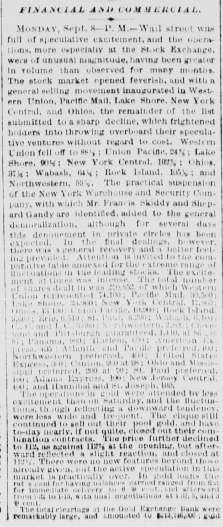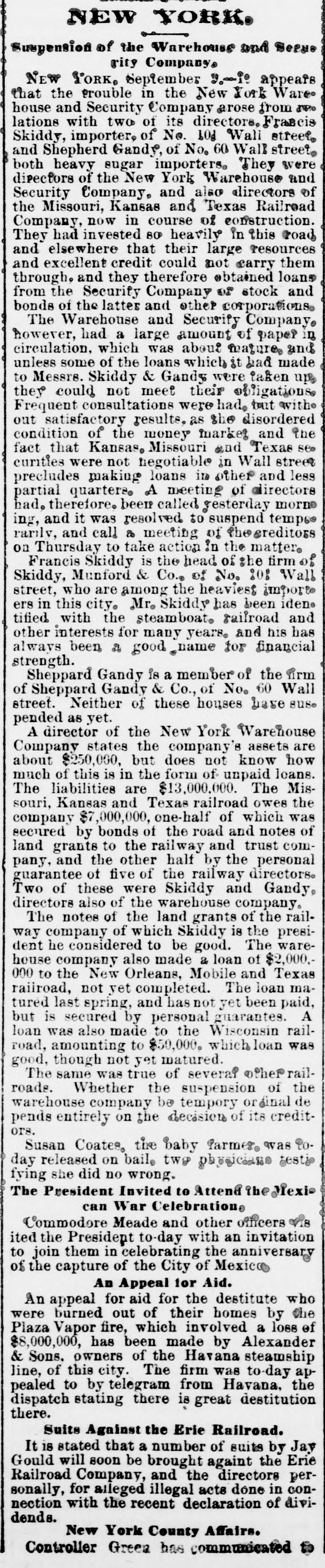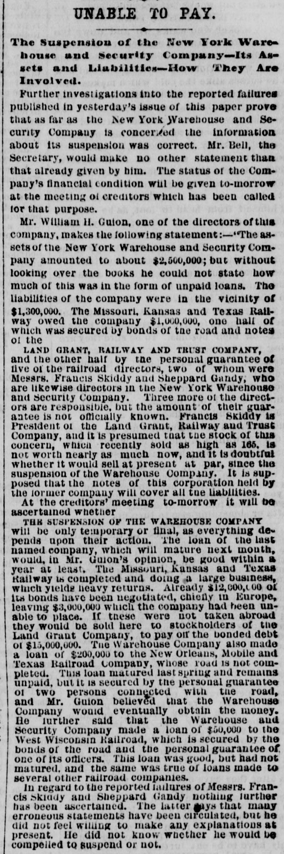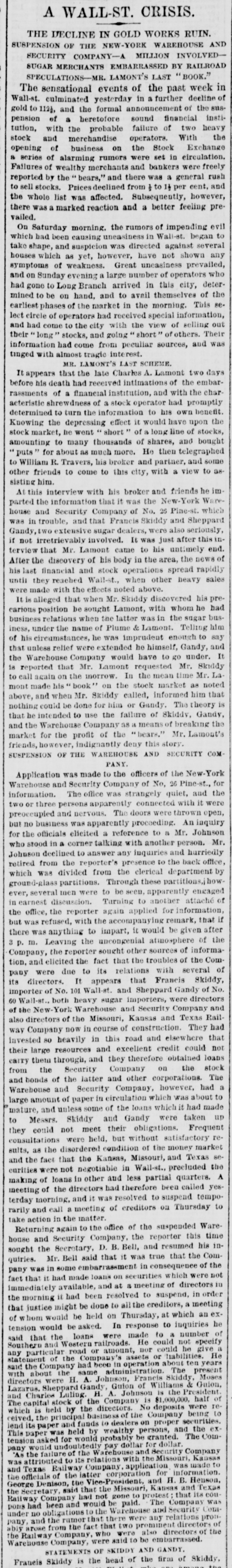 A WALL-ST. CRISIS. THE DECLINE IN GOLD WORKS RUIN. SUSPENSION OF THE NEW-YORK WAREHOUSE AND SECURITY COMPANY-A MILLION INVOLVEDSUGAR MERCHANTS EMBARRASSED BY RAILROAD SPECULATIONS- MR. LAMONT'S LAST 'BOOK." The sensational events of the past week in Wall-st. culminated yesterday in a further deeline of gold to 112g, and the formal announcement of the suspension of a heretofore sound financial institution, with the probable failure of two heavy the stock and merchandise operators. With opening of business on the Stock Exchange a series of alarming rumors were set in circulation. Failures of wealthy merchants and bankers were freely reported by the bears," and there was a general rush to sell stocks. Prices deelined from t to 14 per cent. and the whole list was affected. Subsequently, however, there was a marked reaction and a better feeling prevailed. On Saturday morning. the rumors of impending evil which had been causing uneasiness in Wali-st. began to take shape, and suspicion was directed against several houses which as yet, however, have not shown any symptoms of weakness. Great uneasiness prevailed, and on Sunday evening large number of operators who had gone to Long Branch arrived in this city, determined to be on hand, and to avail themselves of the earliest phases of the market in the morning. This select circle of operators had received special information, and had come to the city with the view of selling out their long" stocks, and going short of others. Their information had come from peculiar sources, and was tinged with almost tragle interest. MR. LAMONT'S LAST SCHEME. It appears that the late Charles A. Lamont two days before his death had received intimations of the embarrassments of a financial institution, and with the char acteristic shrewdness of stock operator had promptly determined to turn the information to his own benefit. Knowing the depressing effect it would have upon the stock market, he went short of long line of stocks, amounting to many thousands of shares, and bought " puts" for about as much more. He then telegraphed to William R. Travers, his broker and partner, and some other friends to come to this city, with a view to as sisting him. At this interview with his broker and friends he im parted the information that it was the New-York Warehouse and Security Company of No. 26 Pine-st. which was in trouble, and that Francis Skiddy and Sheppard Gandy,two extensive sugar dealers, were also seriously, if not irretrievably involved. It was just after this terview that Mr. Lamont came to his untimely end. After the discovery of his body in the area, the news of his last financial and stock operations spread rapidly until they reached Wall-st., when other heavy sales were made with the effects noted above. It is alleged that when Mr. Skiddy discovered his precarious position be sought Lamont, with whom he had business relations when the latter was in the sugar business, under the name of Plume & Lamont. Telling him of his circumstances, he was imprudent enough to say that unless relief were extended he himself, Gandy, and the Warehouse Company would have to go under. It 18 reported that Mr. Lamont requested Mr. Skiddy to call again on the morrow. In the mean time Mr. La mont made his book" on the stock market as noted above, and when Mr. Skiddy called, informed him that nothing could be done for him or Gandy. The theory is that he intended to use the failure of Skiddv. Gandy, and the Warehouse Company as means of breaking the market for the profit of the bears." Mr. Lamont's friends, however, indignantly deny this story. SUSPENSION OF THE WAREHOUSE AND SECURITY COM PANY. Application was made to the officers of the New-York Warehouse and Security Company of No, 26 Pine-st., for information. The office was strangely quiet, and the two or three persons apparently connected with it were preoccupied and nervous. The doors were thrown open, but no business was apparently proceeding. An inquiry for the officials elicited a reference to a Mr. Johnson who stood in a corner talking with another person. Mr. Johnson declined to answer any inquiries and hurriedly retired from the reporter's presence to the back office, which was divided from the clerical department by ground-glass partitions. Through these partitions, ever, several men were to be seen, apparently engaged of in earnest discussion. Turning to another attaché the office, the reporter again applied for information, but was refused, with the accompanying remark, that if there was anything to impart, it would be given after 3 p. m. Leaving the uncongenial atinosphere of the Company, the reporter sought other sources of information. and elicited the fact that the troubles of the Company were due to its relations with several of its directors. It appears that Francis Skiddy, importer of No. 101 Wall-st. and Sheppard Gandy of No. 60 Wall-st. both heavy sugar importers, were directors of the New-York Warehouse and Security Company and also directors of the Missouri, Kansas and Texas Railway Company now in course of construction. They had invested 80 heavily in this road and elsewhere that their large resources and excellent credit could not carry them through, and they therefore obtained loans from the Security Company on the stock and bonds of the latter and other corporations. The Warehouse and Security Company, however, had a large amount of paper in circulation which was about to mature, and unless some of the loans which it had made to Messrs. Skiddy and Gandy were taken up they could not meet their obligations. Frequent consultations were held, but without satisfactory resuits, as the disordered condition of the money market and the fact that the Kaneas, Missouri, and Texas se curities were not negotiable in Wall-st., precluded the making of loans in other and less partial quarters. A meeting of the directors had therefore been called yes terday morning, and it was resolved to suspend temporarily and call meet