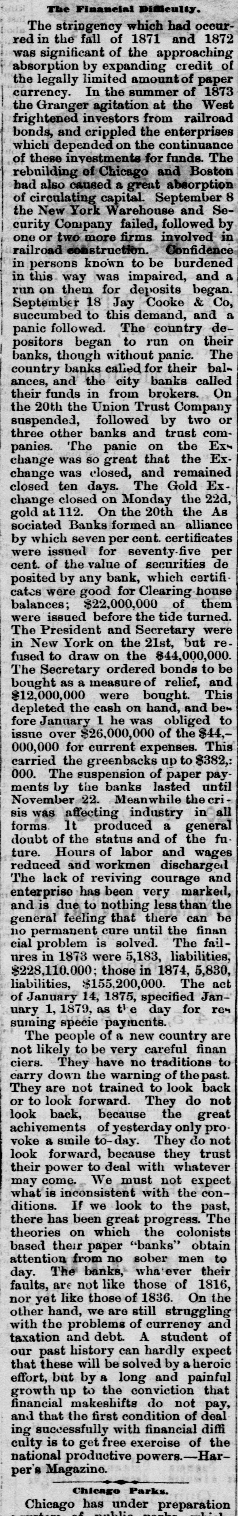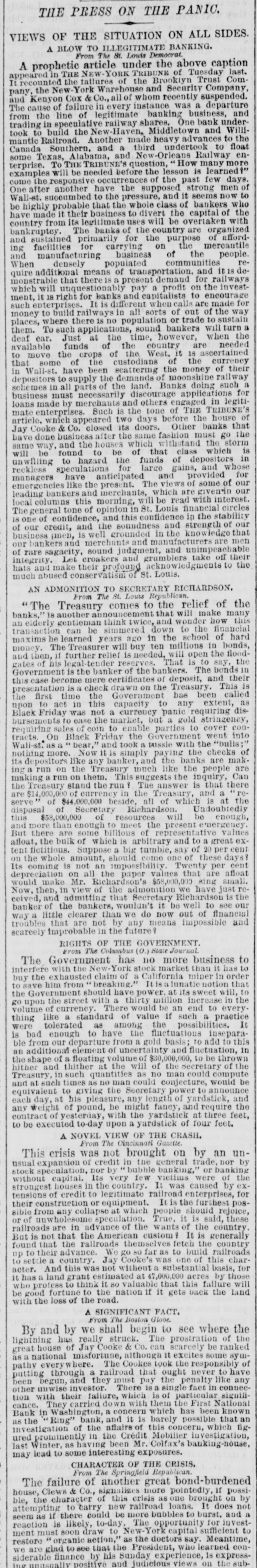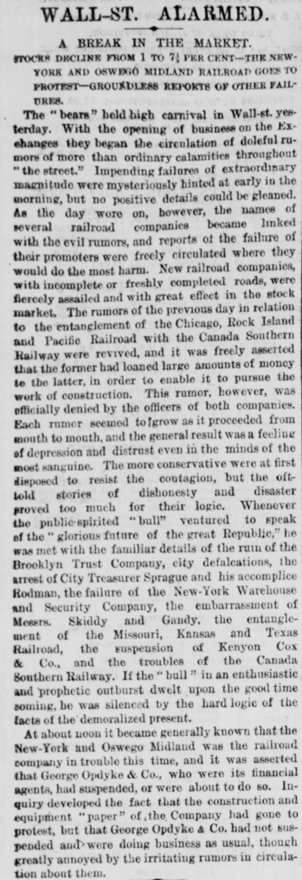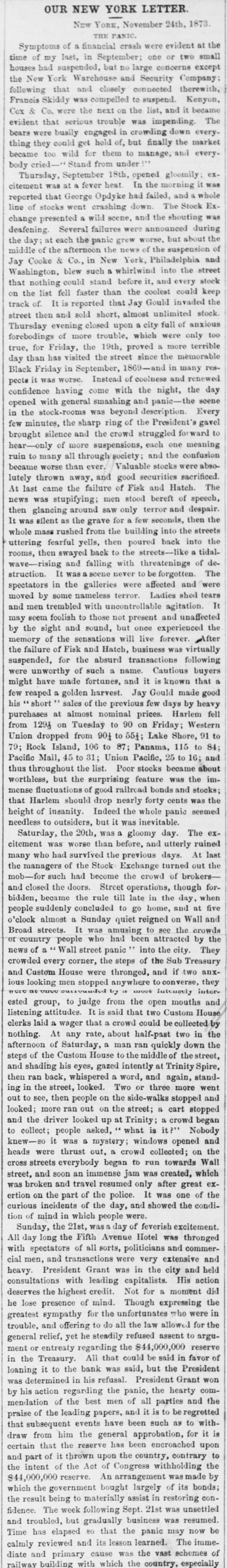 A WALL-ST. CRISIS. THE DECLINE IN GOLD WORKS RUIN. SUSPENSION OF THE NEW-YORK WAREHOUSE AND SECURITY COMPANY-A MILLION INVOLVEDSUGAR MERCHANTS EMBARRASSED BY RAILROAD SPECULATIONS- MR. LAMONT'S LAST 'BOOK." The sensational events of the past week in Wall-st. culminated yesterday in a further deeline of gold to 112g, and the formal announcement of the suspension of a heretofore sound financial institution, with the probable failure of two heavy the stock and merchandise operators. With opening of business on the Stock Exchange a series of alarming rumors were set in circulation. Failures of wealthy merchants and bankers were freely reported by the bears," and there was a general rush to sell stocks. Prices deelined from t to 14 per cent. and the whole list was affected. Subsequently, however, there was a marked reaction and a better feeling prevailed. On Saturday morning. the rumors of impending evil which had been causing uneasiness in Wali-st. began to take shape, and suspicion was directed against several houses which as yet, however, have not shown any symptoms of weakness. Great uneasiness prevailed, and on Sunday evening large number of operators who had gone to Long Branch arrived in this city, determined to be on hand, and to avail themselves of the earliest phases of the market in the morning. This select circle of operators had received special information, and had come to the city with the view of selling out their long" stocks, and going short of others. Their information had come from peculiar sources, and was tinged with almost tragle interest. MR. LAMONT'S LAST SCHEME. It appears that the late Charles A. Lamont two days before his death had received intimations of the embarrassments of a financial institution, and with the char acteristic shrewdness of stock operator had promptly determined to turn the information to his own benefit. Knowing the depressing effect it would have upon the stock market, he went short of long line of stocks, amounting to many thousands of shares, and bought " puts" for about as much more. He then telegraphed to William R. Travers, his broker and partner, and some other friends to come to this city, with a view to as sisting him. At this interview with his broker and friends he im parted the information that it was the New-York Warehouse and Security Company of No. 26 Pine-st. which was in trouble, and that Francis Skiddy and Sheppard Gandy,two extensive sugar dealers, were also seriously, if not irretrievably involved. It was just after this terview that Mr. Lamont came to his untimely end. After the discovery of his body in the area, the news of his last financial and stock operations spread rapidly until they reached Wall-st., when other heavy sales were made with the effects noted above. It is alleged that when Mr. Skiddy discovered his precarious position be sought Lamont, with whom he had business relations when the latter was in the sugar business, under the name of Plume & Lamont. Telling him of his circumstances, he was imprudent enough to say that unless relief were extended he himself, Gandy, and the Warehouse Company would have to go under. It 18 reported that Mr. Lamont requested Mr. Skiddy to call again on the morrow. In the mean time Mr. La mont made his book" on the stock market as noted above, and when Mr. Skiddy called, informed him that nothing could be done for him or Gandy. The theory is that he intended to use the failure of Skiddv. Gandy, and the Warehouse Company as means of breaking the market for the profit of the bears." Mr. Lamont's friends, however, indignantly deny this story. SUSPENSION OF THE WAREHOUSE AND SECURITY COM PANY. Application was made to the officers of the New-York Warehouse and Security Company of No, 26 Pine-st., for information. The office was strangely quiet, and the two or three persons apparently connected with it were preoccupied and nervous. The doors were thrown open, but no business was apparently proceeding. An inquiry for the officials elicited a reference to a Mr. Johnson who stood in a corner talking with another person. Mr. Johnson declined to answer any inquiries and hurriedly retired from the reporter's presence to the back office, which was divided from the clerical department by ground-glass partitions. Through these partitions, ever, several men were to be seen, apparently engaged of in earnest discussion. Turning to another attaché the office, the reporter again applied for information, but was refused, with the accompanying remark, that if there was anything to impart, it would be given after 3 p. m. Leaving the uncongenial atinosphere of the Company, the reporter sought other sources of information. and elicited the fact that the troubles of the Company were due to its relations with several of its directors. It appears that Francis Skiddy, importer of No. 101 Wall-st. and Sheppard Gandy of No. 60 Wall-st. both heavy sugar importers, were directors of the New-York Warehouse and Security Company and also directors of the Missouri, Kansas and Texas Railway Company now in course of construction. They had invested 80 heavily in this road and elsewhere that their large resources and excellent credit could not carry them through, and they therefore obtained loans from the Security Company on the stock and bonds of the latter and other corporations. The Warehouse and Security Company, however, had a large amount of paper in circulation which was about to mature, and unless some of the loans which it had made to Messrs. Skiddy and Gandy were taken up they could not meet their obligations. Frequent consultations were held, but without satisfactory resuits, as the disordered condition of the money market and the fact that the Kaneas, Missouri, and Texas se curities were not negotiable in Wall-st., precluded the making of loans in other and less partial quarters. A meeting of the directors had therefore been called yes terday morning, and it was resolved to suspend temporarily and call meet
