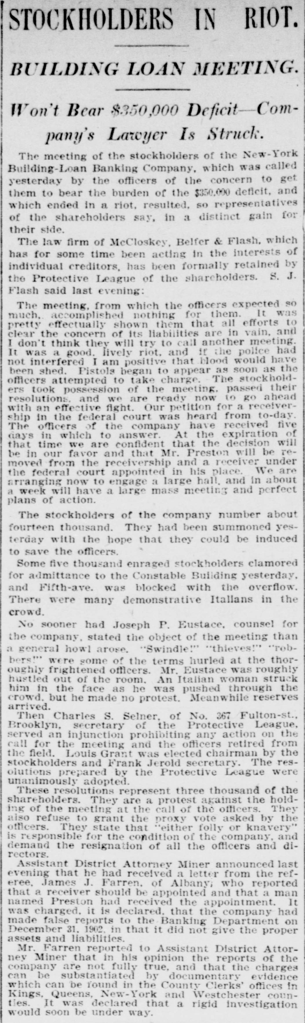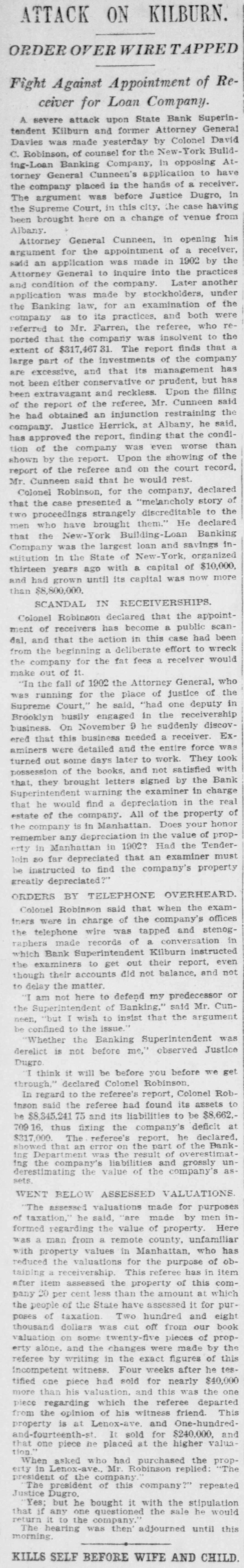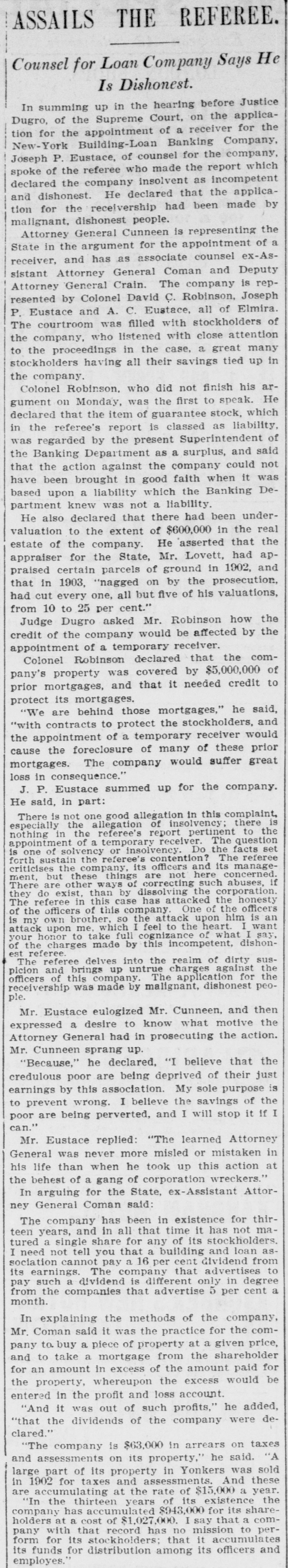 ASSAILS THE REFEREE. Counsel for Loan Company Says He Is Dishonest. In summing up in the hearing before Justice Dugro, of the Supreme Court, on the application for the appointment of a receiver for the New-York Building-Loan Banking Company, Joseph P. Eustace, of counsel for the company, spoke of the referee who made the report which declared the company insolvent as incompetent and dishonest. He declared that the application for the receivership had been made by malignant. dishonest people. Attorney General Cunneen is representing the State in the argument for the appointment of a receiver, and has as associate counsel ex-Assistant Attorney General Coman and Deputy Attorney General Crain. The company is represented by Colonel David C. Robinson, Joseph P. Eustace and A. C. Eustace, all of Elmira. The courtroom was filled with stockholders of the company, who listened with close attention to the proceedings in the case, a great many stockholders having all their savings tied up in the company. Colonel Robinson. who did not finish his argument on Monday, was the first to speak. He declared that the item of guarantee stock, which in the referee's report is classed as liability, was regarded by the present Superintendent of the Banking Department as a surplus, and said that the action against the company could not have been brought in good faith when it was based upon a liability which the Banking Department knew was not a liability. He also declared that there had been undervaluation to the extent of $600,000 in the real estate of the company. He asserted that the appraiser for the State, Mr. Lovett, had appraised certain parcels of ground in 1902, and that in 1903, "nagged on by the prosecution, had cut every one, all but five of his valuations, from 10 to 25 per cent." Judge Dugro asked Mr. Robinson how the credit of the company would be affected by the appointment of a temporary receiver. Colonel Robinson declared that the company's property was covered by $5,000,000 of prior mortgages, and that it needed credit to protect its mortgages. "We are behind those mortgages," he said, "with contracts to protect the stockholders, and the appointment of a temporary receiver would cause the foreclosure of many of these prior mortgages. The company would suffer great loss in consequence." J. P. Eustace summed up for the company. He said, in part: There is not one good allegation in this complaint, especially the allegation of insolvency; there is nothing in the referee's report pertinent to the appointment of a temporary receiver. The question is one of solvency or insolvency. Do the facts set forth sustain the referee's contention? The referee criticises the company, its officers and its management, but these things are not here concerned. There are other ways of correcting such abuses, if they do exist, than by dissolving the corporation. The referee in this case has attacked the honesty of the officers of this company. One of the officers is my own brother, so the attack upon him is an attack upon me, which I feel to the heart. I want your honor to take full cognizance of what I say, of the charges made by this incompetent, dishonest referee. The referee delves into the realm of dirty suspicion and brings up untrue charges against the officers of this company. The application for the receivership was made by malignant, dishonest people. Mr. Eustace eulogized Mr. Cunneen, and then expressed a desire to know what motive the Attorney General had in prosecuting the action. Mr. Cunneen sprang up. "Because," he declared, "I believe that the credulous poor are being deprived of their just earnings by this association. My sole purpose is to prevent wrong. I believe the savings of the poor are being perverted, and I will stop it if I can." Mr. Eustace replied: "The learned Attorney General was never more misled or mistaken in his life than when he took up this action at the behest of a gang of corporation wreckers." In arguing for the State, ex-Assistant Attorney General Coman said: The company has been in existence for thirteen years, and in all that time it has not matured a single share for any of its stockholders. I need not tell you that a building and loan association cannot pay a 16 per cent dividend from its earnings. The company that advertises to pay such a dividend is different only in degree from the companies that advertise 5 per cent a month. In explaining the methods of the company, Mr. Coman said it was the practice for the company to. buy a piece of property at a given price, and to take a mortgage from the shareholder for an amount in excess of the amount paid for the property, whereupon the excess would be entered in the profit and loss account. "And it was out of such profits," he added, "that the dividends of the company were declared." "The company is $63,000 in arrears on taxes and assessments on its property," he said. "A large part of its property in Yonkers was sold in 1902 for taxes and assessments. And these are accumulating at the rate of $15,000 a year. "In the thirteen years of its existence the company has accumulated $943,000 for its shareholders at a cost of $1,027,000. I say that a company with that record has no mission to perform for its stockholders: that it accumulates its funds for distribution among its officers and employes.