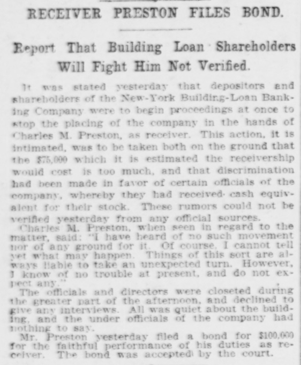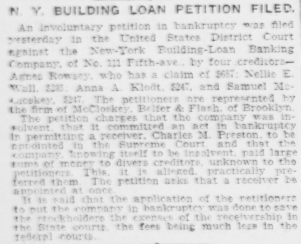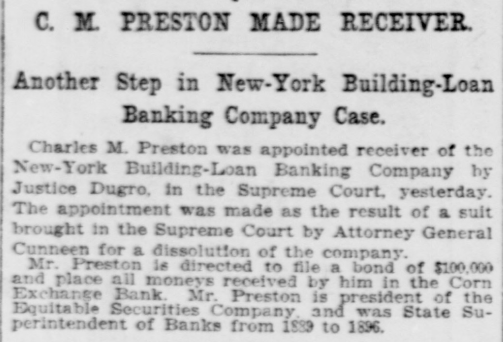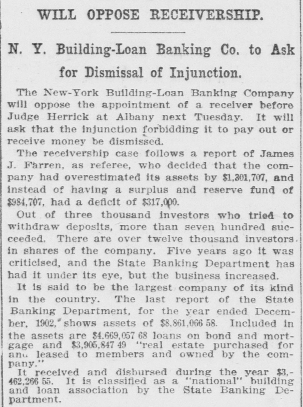 ASSAILS THE REFEREE. Counsel for Loan Company Says He Is Dishonest. In summing up in the hearing before Justice Dugro, of the Supreme Court, on the application for the appointment of a receiver for the New-York Building-Loan Banking Company, Joseph P. Eustace, of counsel for the company, spoke of the referee who made the report which declared the company insolvent as incompetent and dishonest. He declared that the application for the receivership had been made by malignant. dishonest people. Attorney General Cunneen is representing the State in the argument for the appointment of a receiver, and has as associate counsel ex-Assistant Attorney General Coman and Deputy Attorney General Crain. The company is represented by Colonel David C. Robinson, Joseph P. Eustace and A. C. Eustace, all of Elmira. The courtroom was filled with stockholders of the company, who listened with close attention to the proceedings in the case, a great many stockholders having all their savings tied up in the company. Colonel Robinson. who did not finish his argument on Monday, was the first to speak. He declared that the item of guarantee stock, which in the referee's report is classed as liability, was regarded by the present Superintendent of the Banking Department as a surplus, and said that the action against the company could not have been brought in good faith when it was based upon a liability which the Banking Department knew was not a liability. He also declared that there had been undervaluation to the extent of $600,000 in the real estate of the company. He asserted that the appraiser for the State, Mr. Lovett, had appraised certain parcels of ground in 1902, and that in 1903, "nagged on by the prosecution, had cut every one, all but five of his valuations, from 10 to 25 per cent." Judge Dugro asked Mr. Robinson how the credit of the company would be affected by the appointment of a temporary receiver. Colonel Robinson declared that the company's property was covered by $5,000,000 of prior mortgages, and that it needed credit to protect its mortgages. "We are behind those mortgages," he said, "with contracts to protect the stockholders, and the appointment of a temporary receiver would cause the foreclosure of many of these prior mortgages. The company would suffer great loss in consequence." J. P. Eustace summed up for the company. He said, in part: There is not one good allegation in this complaint, especially the allegation of insolvency; there is nothing in the referee's report pertinent to the appointment of a temporary receiver. The question is one of solvency or insolvency. Do the facts set forth sustain the referee's contention? The referee criticises the company, its officers and its management, but these things are not here concerned. There are other ways of correcting such abuses, if they do exist, than by dissolving the corporation. The referee in this case has attacked the honesty of the officers of this company. One of the officers is my own brother, so the attack upon him is an attack upon me, which I feel to the heart. I want your honor to take full cognizance of what I say, of the charges made by this incompetent, dishonest referee. The referee delves into the realm of dirty suspicion and brings up untrue charges against the officers of this company. The application for the receivership was made by malignant, dishonest people. Mr. Eustace eulogized Mr. Cunneen, and then expressed a desire to know what motive the Attorney General had in prosecuting the action. Mr. Cunneen sprang up. "Because," he declared, "I believe that the credulous poor are being deprived of their just earnings by this association. My sole purpose is to prevent wrong. I believe the savings of the poor are being perverted, and I will stop it if I can." Mr. Eustace replied: "The learned Attorney General was never more misled or mistaken in his life than when he took up this action at the behest of a gang of corporation wreckers." In arguing for the State, ex-Assistant Attorney General Coman said: The company has been in existence for thirteen years, and in all that time it has not matured a single share for any of its stockholders. I need not tell you that a building and loan association cannot pay a 16 per cent dividend from its earnings. The company that advertises to pay such a dividend is different only in degree from the companies that advertise 5 per cent a month. In explaining the methods of the company, Mr. Coman said it was the practice for the company to. buy a piece of property at a given price, and to take a mortgage from the shareholder for an amount in excess of the amount paid for the property, whereupon the excess would be entered in the profit and loss account. "And it was out of such profits," he added, "that the dividends of the company were declared." "The company is $63,000 in arrears on taxes and assessments on its property," he said. "A large part of its property in Yonkers was sold in 1902 for taxes and assessments. And these are accumulating at the rate of $15,000 a year. "In the thirteen years of its existence the company has accumulated $943,000 for its shareholders at a cost of $1,027,000. I say that a company with that record has no mission to perform for its stockholders: that it accumulates its funds for distribution among its officers and employes.