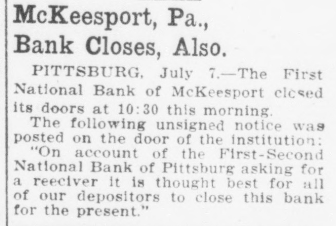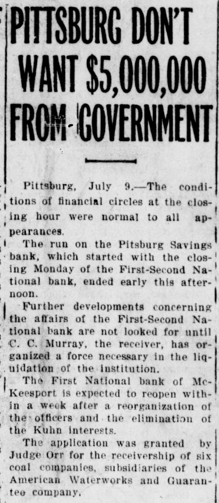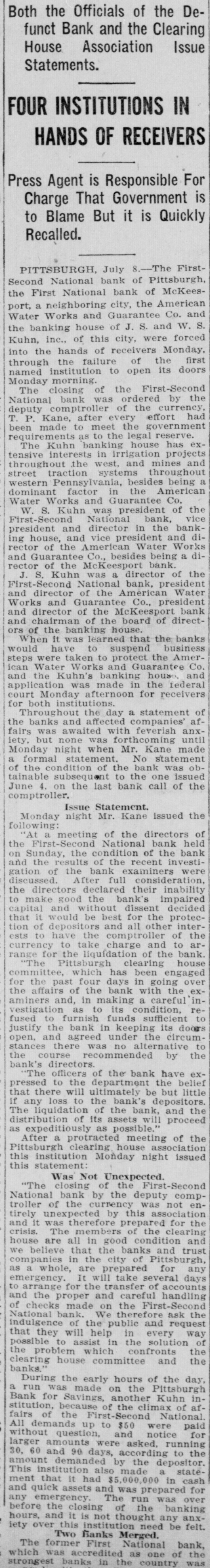 First-Second National of Pittsburgh Forced to Close Doors. SOON FOLLOWED BY TWO OTHERS First National of McKeesport and Bank of J. S. & W. S. Kuhn, Inc., Are Caught-Receiver Appointed for American Water Works and Guarantee Company. Pittsburgh, July 7.-The First-Second National Bank of Pittaburgh, the First National Bank of McKeesport, a neighboring city: the American Water Works and Guarantee Company and the banking-house of J. S. & W. S. Kuhn, Incorporated, of this city, were forced into the hands of receivers to-day through the failure of the first named institution to open its doors this morning. The closing of the First-Second National Bank was ordered by the deputy comptroller of currency, T. P. Kane, after every effort had been made to meet the government requirements as to the legal reserve. The Kuhn banking-house has extensive interests in Irrigation projects throughout the West and in mines and street traction systems throughout Western Pennsylvania, besides being a dominant figure In the American Water Works and Guarantee Company. W. S. Kuhn is president of the FirstSecond National Bank, vice-president and director in the banking-house and vice-president and director of the American Water Works and Guarantee Company, besides a director of the McKeesport bank. J. S. Kuhn is a director of the FirstSecond National Bank, president and director of the American Water Works and Guarantee Company, president and director of the McKeesport bank and chairman of the board of directors of the banking-house. Receivers Asked For. When it was learned that the banks would have to suspend business, steps were taken to protect the American Water Works and Guarantee Company and the Kuhn's banking-house, and application was made in the Federal court this afternoon for receivers for both Institutions. Throughout the day a statement of the banks and affected companies' affairs was awaited with feverish anxiety, but none was forthcoming until tonight. when Mr. Kuhn made a formal statement. No statement of the condition of the bank was obtainable subsequent to the one issued June 4 on the last bank call of the comptroller. The June 4 statement was as follows: Resources: Loans and discounts. $15,704,901.16. Overdrafts, secured and unsecured. $2,571.76. United States bonds to secure circulation, $1,900,000. United States bonds to secure United States deposits, $171,000. United States bonds on hand, $16,000. Premium of united bonds, $10,121.26. Bonds, securities, etc., $8,549,236.95. Banking furniture and lixtures, $176,755.04. Other real estate owned. $4,541,977.65. Due from national banks (not reserve agents). $1,178,987.06 Due from State banks and bankers, $1,316,820.23. Due from approved reserve agents, $4,216,447.75 Checks and other cash items. $160.076.23. Exchanges for clearing house, $693,230.42. Notes of other national banks, $360,000. Fractional paper currency, nickels and cents, $13,237.88. Lawful money reserve in bank, via.: Specie and legal tender notes, $1,S.1.023. Redemption fund with United States Treasury (5 per cent of circulation), 95 per cent. Due from United States treasurer other than 5 per cent redemption fund, $87,500. Total, $38,103,856.39. Other Side of Ledger. Liabilities: Capital stock paid in, $3,400,000. Surplus fund, $1,700,000. Undivided profits, less expenses and taxes paid, $250,068.45. National bank notes outstanding, (Continued on Second Page.)