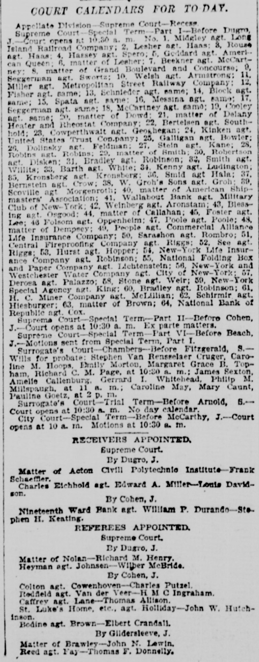 # COURT CALENDARS FOR TO DAY. Appellate Division Supreme Court-Recess. Supreme Court-Special Term-Part I-Before Dugro, J.-Court opens at 10:30 a. m. No. 1. Midgley agt. Long Island Railroad Company; 2, Lesher agt. Haas; 3, Rouze agt. Haas: 4. Hassey agt. Spero; 5, Goddard agt. Ameri- can Queen; 6. matter of Lesher: 7. Beekner agt. McCart- ney; 8, matter of Grand Boulevard and Concourse; 9. Seggerman agt. Swortz; 10. Welsh agt. Armstrong: 11. Miller agt. Metropolitan Street Railway Company: 12, Fisher agt, same; 13, Schnieder agt, same; 14, Block agt. same; 15, Spata agt. same: 16, Messina agt, same; 17, Seggerman agt. same; 18, McCartney agt, samo; 19, Cooley agt. same; 20, matter of Dowd: 21. matter of Delany Heater and Rheostat Company; 22, Bertelsen agt. South- hold; 23, Cowperthwalt agt. Geoghegan; 24, Kinken agt. United States Trust Con.pany: 25, Galligan agt. Bowler: 26. Dolinsky agt. Feldman; 27, Stein agt. Kane; 28. Robins agt. Robins: 29, matter of Smith; 30, Robertson agt. Disken: 31. Bradley agt. Robinson; 32, Smith agt. Willits; 33, Barth agt. White; 34. Kenny agt. Ludington; 35, Kronsberg agt. Kronsberg: 36. Smid agt Hala: 37, Bernstein agt. Crow; 38, W. Groh's Sons agt. Groh: 39, Scoville agt Morgenroth; 40, matter of American Ship- masters' Association; 41. Wallabout Bank agt. Military Club of New-York: 42, Weinberg agt, Aronstam; 43, Bless- ing agt. Osgood: 44, matter of Callahan; 45, Foster agt. Lee; 46 Folsom agt. Oppenheim: 47. Poole agt. Poole; 48, matter of Dempsey: 49, People agt. Commercial Alliance Life Insurance Company; 50, Sarashon agt. Rombro; 51, Central Fireproofing Company agt. Riggs; 52, See agt. Riggs; 53. Hurst agt. Hopper: 54, New-York Life Insur- ance Company agt. Robinson; 55, National Folding Box and Paper Company agt. Lichtenstein; 56, New-York and Westchester Water Company agt. City of New-York; 57, Derosa agt. Palazzo; 58, Stone agt. Weir; 59, New-York Special Agency agt. King: 60, Bradley agt. Robinson; 61, H. C. Miner Company agt. McLillian: 62, Schirmir agt. Hiesburger; 63, matter of Brown; 64, National Bank of Republic agt. Cox. Supreme Court-Special Term-Part II-Before Cohen, J.-Court opens at 10:30 a. m. Ex parte matters. Supreme Court-Special Term-Part VI-Before Beach, J.-Motions sent from Special Term, Part I. Surrogate's Court-Chambers-Before Fitzgerald, S.- Wills for probate: Stephen Van Rensselaer Cruger, Caro- line M. Hoops, Emily Morton, Margaret Grace В. Тор- ham, Richard C. M. Page, at 10:30 a. m.; James Sexton, Amelie Callenburg, Gerrard I. Whitehead, Philip M. Millspaugh, at 11 a. m.; Caroline May, Mary Caunt, Pauline Goetz, at 2 p. m. Surrogate's Court-Trial Term-Before Arnold, 6.- Court opens at 10:30 a. m. No day calendar. City Court-Special Term-Before McCarthy, J.--Court opens at 10 a. m. Motions at 10:30 a. m. # RECEIVERS APPOINTED, Supreme Court. By Dugro, J. Matter of Acton Civill Polytechnic Institute-Frank Schaeffler. Charles Eichhold agt. Edward A. Miller-Louis David- son. By Cohen, J. Nineteenth Ward Bank agt. William P. Durando-Ste- phen H. Keating. # REFEREES APPOINTED. Supreme Court. By Dugro, J. Matter of Nolan-Richard M. Henry. Heyman agt. Johnsen-Wilber McBride. By Cohen, J. Colton agt. Cowenhoven-Charles Putzel. Redfield agt. Van der Veer-H M C Ingraham. Caffrey agt. Lane-Thomas Allison. St. Luke's Home, etc., agt. Holliday-John W. Hutch- inson. Bodine agt. Brown-Elbert Crandall. By Gildersleeve, J. Matter of Brawley-John N. Lewin, Reed agt. Fay-Thomas F. Donnelly.