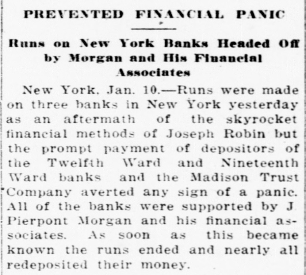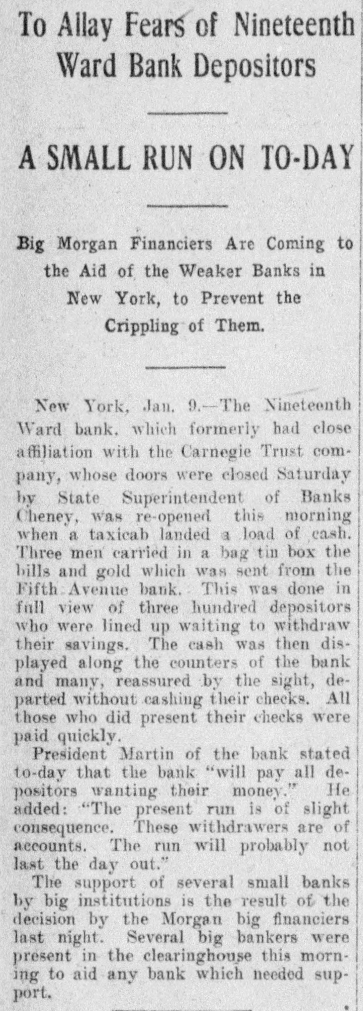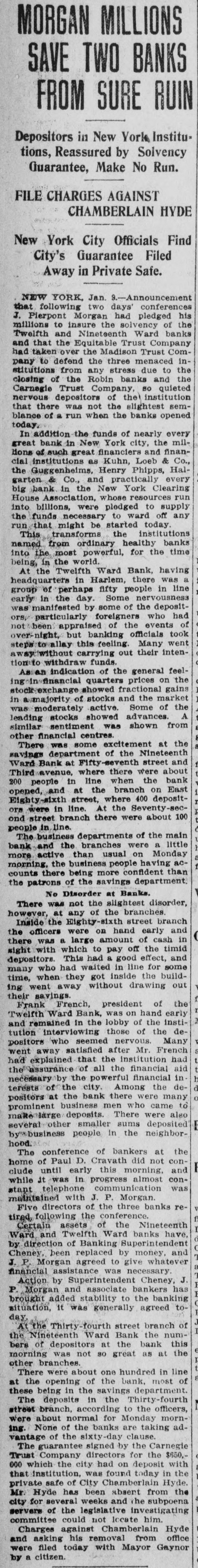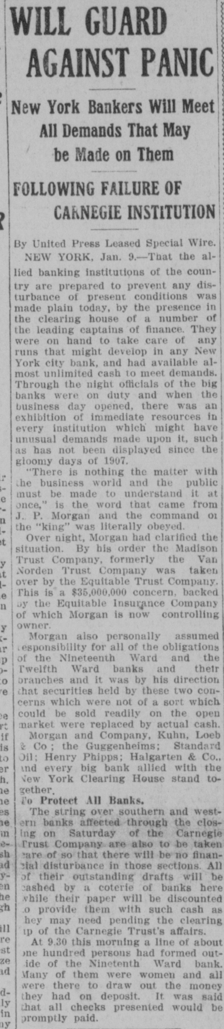 Didn't Risk a Cent and His Equitable Trust Absorbs Madison Institution. GOLD IS UNTOUCHED. Big Packages Sent to Avert Run Are Not Even Opened. In saving the Madison Trust Comany, the Nineteenth Ward Bank and be Twelfth Ward Bank from going the wall by the mere lending of his name to these institutions Mr. Morgan has added about $20,000,000 to the ten billions of dollars he already has under his control, and at the same time obtained possession virtually of the Madison Trust Company. It was learned to-day that the house of Morgan did not put up so much as a cent, because after the publication yesterday that Morgan had come to the rescue of the banks and trust company the Institutions threatened were able to meet the demands made on them from their own resources. Although money was sent to all the banks to be on hand in case it was needed, the big packages of gold and currency were not even opened. Bound to Avert Panic. Business men. and the public generally interpreted Morgan's intervention to mean that powerful financial interests had determined there should be no repetition of the monetary panic of 1907, and that any bank which might be in trouble would be supported. That, practically, is the situation, it is said, and although stockholders may have to pay dearly, the depositors will be protected. In addition to being willing to drive a good bargain the Morgan interests, it is asserted, do not desire any finanetal disturbance at this time, causing, as it would, the securities held by the various banks to be thrown on the stock market and reducing the prices there they have been so anxious to maintain. The Carnegie Trust Company synd:cate paid $315 a share for the Van Norden holdings in the Madison Trust Company. Mr. Morgan has agreed to take them over, it is understood at book. or liquidation value, which it is estimated will be about $184 a share. Got a Bargain Rate. According to Wall street information, the Mndison Trust Company was virtually forced into the Morgan arms. It was said that the Morgan interests for a long time had been determined to eliminate the Carnegie Trust Company and obtain control of the Madison, the majority of the stock of which was held by,a syndicate of Carnegie directors. In support of this a remark said to have been made by Joseph T. Howell. President of the Carnegie Company, was quoted. According to this Mr. Howell had said that the sudden closing of his company by the State Banking Department had been an outrage. Whether or not Mr. Howell made this remark, the sentiment attributed 10 him was held by many of his directors. "The company is absolutely solvent and will pay dollar for dollar," said former Judge Keener, one of its directors. Forced to Go to Morgan? "How, then, do you explain the action of the State Banking Department: he was asked. "That is for them say," he replied, with a shrug. To continue the Wall street story the Nineteenth and Twelfth Ward banks were forced by the State Banking Department to go to the Morgans for aid. The Nineteeuth Ward, it was said, had about 35 per cent. of its deposits in actual cash, and about $1,500,000 in commercial paper 50 good that it could have been sold anywhere. The State Banking Department, it was asserted. declined to give the management time to sell this and informed the bank that it would take possession on Monday morning if the institution had not by that time obtained the support of strong banking