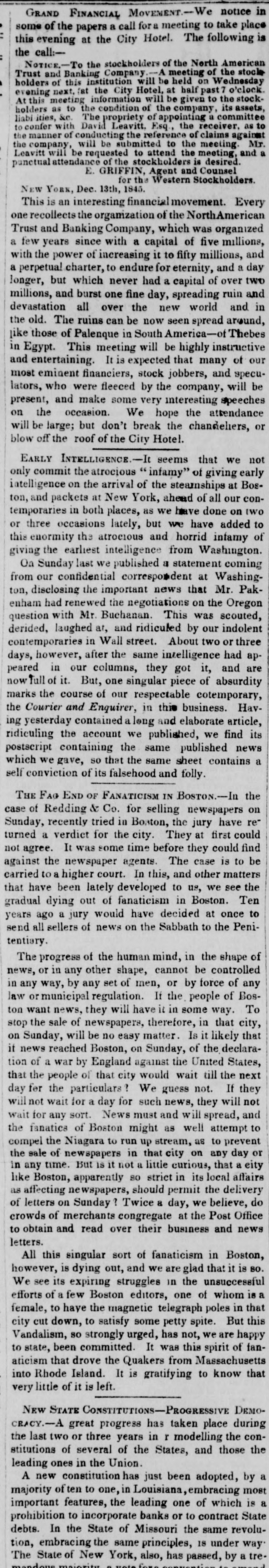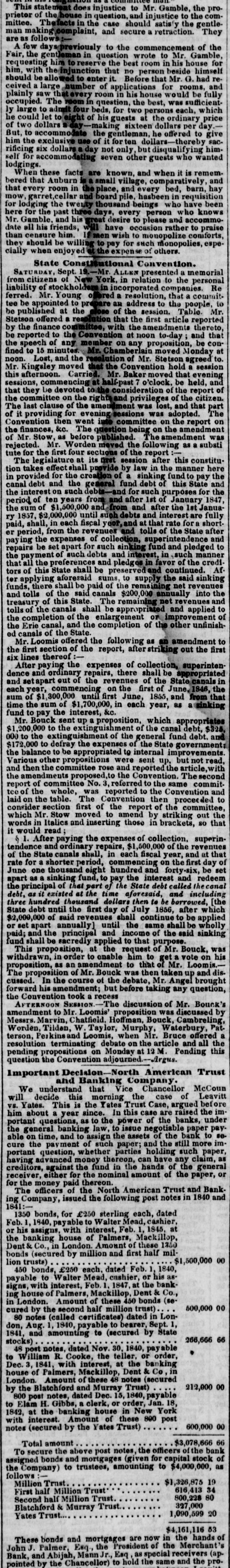 This state does injustice to Mr. Gamble the proprietor of the house question and justice to the com mittee. refacts in the case should satisfy the gentle man making complaint, and secure retraction. They are as follow A few days previously to the of the Fair, the gen leman in question wrote to Mr. Gamble, to him requesting the best his room in for house him. with injunction that no person beside himsel should be allo wed enter to it. had Mr that Before G. ceived large number of cations for rooms. and plainly his in house room saw would be fully occupied. The question the best, was sufficient large ly to two hich for persons beds, each. could of guests at the ordinary price dollars sixteen dollars per day But, accomme ntleman. he offered to give the him exclusive dollars thereby rificing six dolla a day not only but disqualifying him. accommo dating seven other guests who wanted lodgings When these facts known and when it is remem bered that Auburn village, com paratively and that every room in barn. bed, hay every mow,garret.cella hasbeen in requisition have been who for lodging the beings here for the past every person who knows to Gamble and his and desire please rather casion date all his friends to praise than censure him mono to (men polize comforts. they should be will for such monopolies, especially when enjoyed the expens of others. State Cons stutional Convention SATURDAY, Sept. 19.-Mr. ALLEN presented memorial from citizens of York in relation to the persona stockh of Re rporated liability companies. ferred. Mr. resolution. Young that address tee be appointed to the people, the at be published Mr. the session. Table. Stetson offered that the first article reported by the finance amittee the amen dments thereto. the to at be noon that and reported to-day of the member be any speech conon any roposition, lain 15 moved fined to Monday and the of Stetson Mr. Lost, noon. agreed Mr. Kingsley moved that the hold session Mr Baker afternoon. this that Carrie moved evening at sessions, commencing be o'clock. held, half-past of devoted be consid to the that of the deration report they the commi ittee on the rights and privileges of the citize the of was amet last clause lost, part and The that dment for of was adopted. it providing invention then went into committee on the report on the finances, &c. The question being on the amendr of Mr Stow as before published The amendment was rejected Mr Worden moved the following as substi tute for the first four section of the report at legislature after thret this constitu The shall law effect in by the provide manner tion takes here in provided for the sinking fund pay the canal debt and the general fund debt of this State and the interest on such for such purposes for the of 1st after of years ten January period $1,500,000 from 1st and after the the of ry 1857, 2,000,000 until such debts and interes are fully that each rate in fiscal at short year,and fora shall, paid, the tolls after and of from State the period, er of colle otion. and the expenses dence paying to such be and set fund for apart sinking repairs pledged debts such such interest of in ment manner and the that the prefe erences and pledge es in favor of the credit shall be and State con Afthis tors said to the sums, aforesaid sinking supply applying shall be net the revenues paid ning funds,there said $200,000 the of canals into the and tolls ally The this State and net of treasury tolls o the canals shall be approp and applied or of the of enlargement the completion the Erie canal. and the completion of the other unfinish State of the canals ed Mr Loomis offered the followin as an amendment to the first section of the report, after str. iking out the first six lines thereof After paying the expenses of collection, superintenshall there and be or repairs, dence appropriated of out the the setapart State canals i and on the first of June, comme 1946, each the year, first 00,000 until June. 1855, and from that of in $1,700,000 each time sum as year, sinking interest, the &c. to fund pay Mr. Bouck sent up proposition which appropriates to the extinguishment of the canal debt, $325, 000 to the extingu ishment of the fund debt and $172,000 to defray the expense of the State government: the balance to be appropriated to internal improvements. Various other propositions were sent up, but not read, and rose committee then and reported the article the iments proposed.t to the Convention. The second referred to committe No. the of report same commit tee of the whole, was reported to the Convention The proceeded laid on the table then to consider section first of the report of the committee, Mr amend moved Stow to which out striking words in Italics and inserting those in brackets, so that read would it After paying the expenses of collection superinndence and ordina repairs, $1 500.000 of the revenues of the State canals shall in each fiscal year, and at that commend horter the for rate first on of period, day June one thousand eight hundred and forty-six, be set apart as a sinking fund, to pay the interest and redeem the principal of that part of the State debt called at and time the include debt, existed aforesaid three hundred thousand dollar then to be borrowed, [the State debt until the first day of July 1856, after which $2,000,000 of said revenues shall continue to be applied until the same shall be or set apart annually) wholly paid;and the principal and income of the said sinking fund shall be sacredly applied to that purpose This proposition, at the request of Mr. Bouck, was withdrawn, in order to enable him to get a vote on his proposition, as an amendment to that Mr. Looming Bouck then and of Mr. taken The dis proposition up cussed. In the course ot the debate, Mr Angel brought forward his amendment: but before taking any question, the Convention took recess AFTERNOON The discussion of Mr. Bouck's amendment to Mr. Loomis proposition discussed by Messrs.Marvin. hatfield Hoffman, B