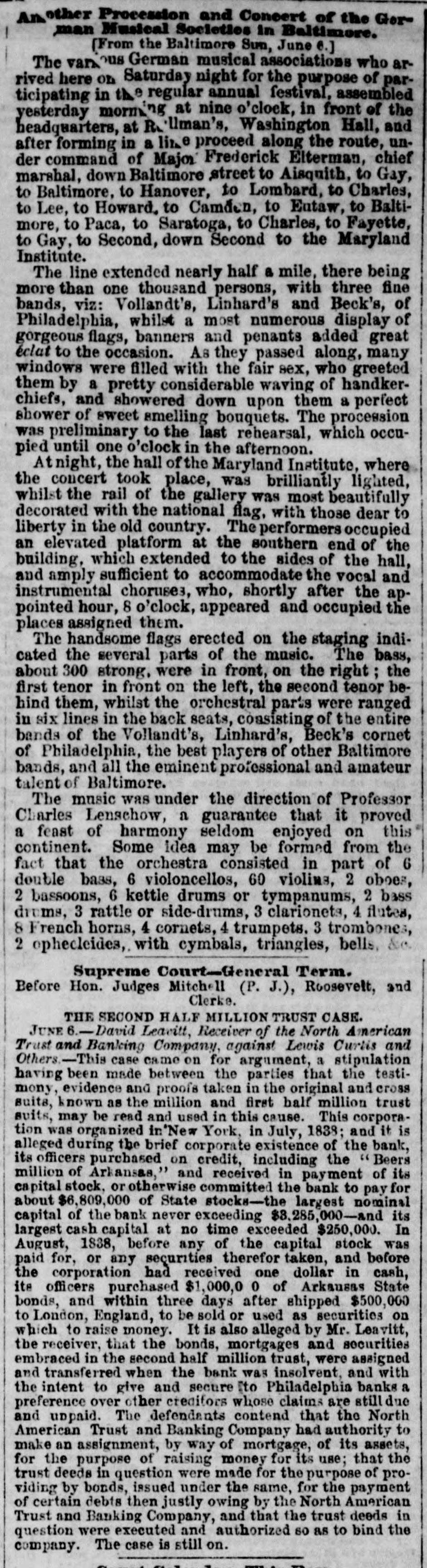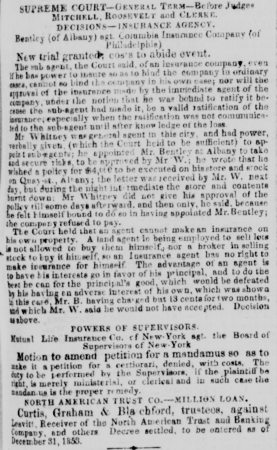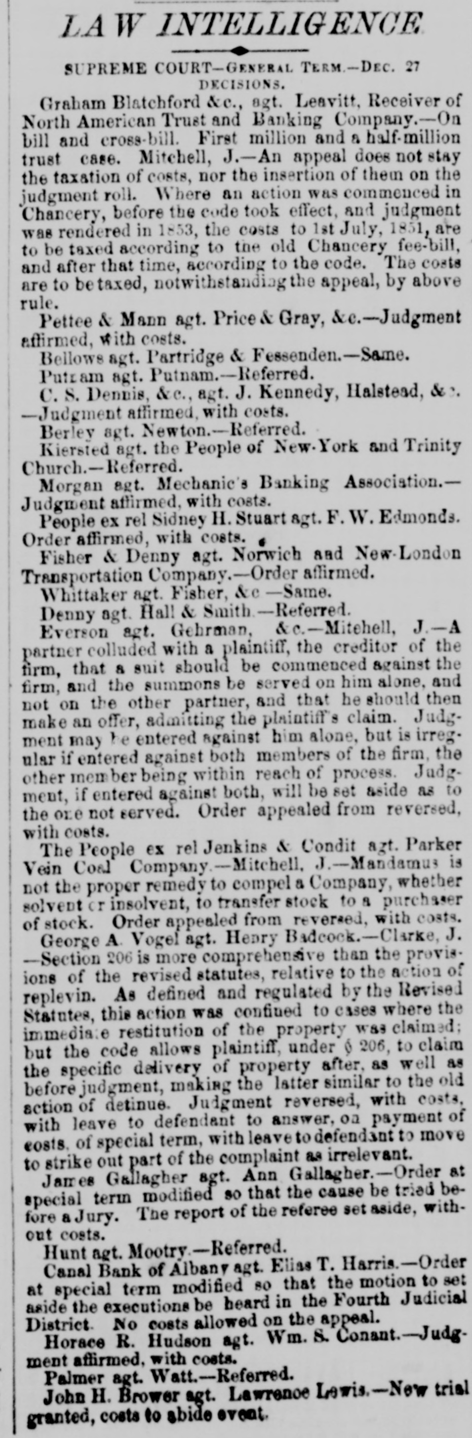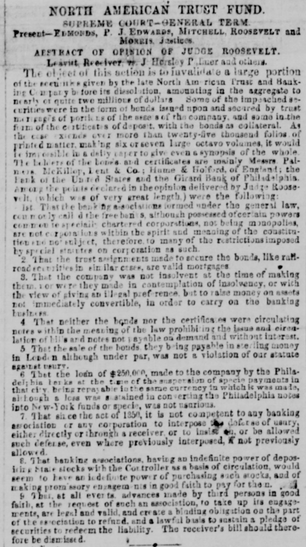 # NORTH AMERICAN TRUST FUND. SUPREME COURT-GENERAL TERM. Present—ELMONDS, P. J. EDWARDS, MITCHELL, ROOSEVELT and MORRIS, Justices. # AESTRACT OF OPINION OF JUDGE ROOSEVELT. Leavitt, Receiver, vs. J. Horsley Palmer and others. The object of this action is to invalidate a large portion of the securities given by the late North American Trust and Banking Company before its diesolation, amounting in the aggregate to nearly or quite two millions of dollars. Some of the impeached securities were in the form of bonds issued upon and secured by trust mortgages of portions of the assets of the company, and some in the form of the certificates of deposit, with the bonds as collateral. As the case extends over more than twenty-five thousand folios of printed matter, making six or seven large octavo volumes, it would be impossible in a daily paper to give even a synopsis of the whole. The holders of the bones and certificates are mainly Messrs. Palmers, McKillop, Lent & Co.; Hame & Holford, of England; the Bank of the United States and the Girard Bank of Philadelphia. Among the points declared in the opinion delivered by Judge Roosevelt, (which was of very great length.) were the following: 1st. That the banking associations formed under the general law, commonly call d the free banks, although possessed of certain powers common to special chartered corporations, not being monopolies, are not corporations within the spirit and meaning of the constitution and no subject, therefore, to many of the restrictions imposed by special statutes on corporation as such. 2. That the trust assignments made to secure the bonds, like railroad securities in similar cases, are valid mortgages. 3. That the company was not insolvent at the time of making them, nor were they made in contemplation of insolvency, or with the view of giving an illegal preference, but to raise money on assets not immediately convertible, in order to carry on the banking business. 4. That neither the bonds nor the certificates were circulating notes within the meaning of the law prohibiting the issue and circulation of bills and notes not payable on demand and without interest. 5. That the sale of the bonds they being payable in sterling money in London although under par, was not a violation of our statute against usury. 6. That the loan of $250,000, made to the company by the Philadelphia banks at the time of the suspension of specie payments in that city, being repayable in the same currency in which it was made, although a loss was sustained in converting the Philadelphia notes into New-York funds or specie, was not usurious. 7. That since the act of 1850, it is not competent to any banking association or any corporation to interpose the defense of usury, either directly or through a receiver, or to insist on, or be allowed such defense, even where previously interposed, if not previously allowed. 8. That banking associations, having an indefinite power of depos-itizing State stocks with the Controller as a basis of circulation, would seem to have an indefinite power of purchasing such stocks, and of making promissory engagements in good faith to pay for them. 9. That, at all events, advances made by third persons in good faith, at the request of such an association, to take up its engagements, are legal and valid, and create a binding obligation on the part of the association to refund, and a lawful basis to sustain a pledge of securities to redeem the liability. The receiver's bill should therefore be dismissed.
