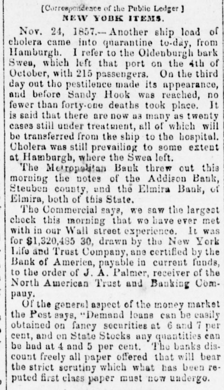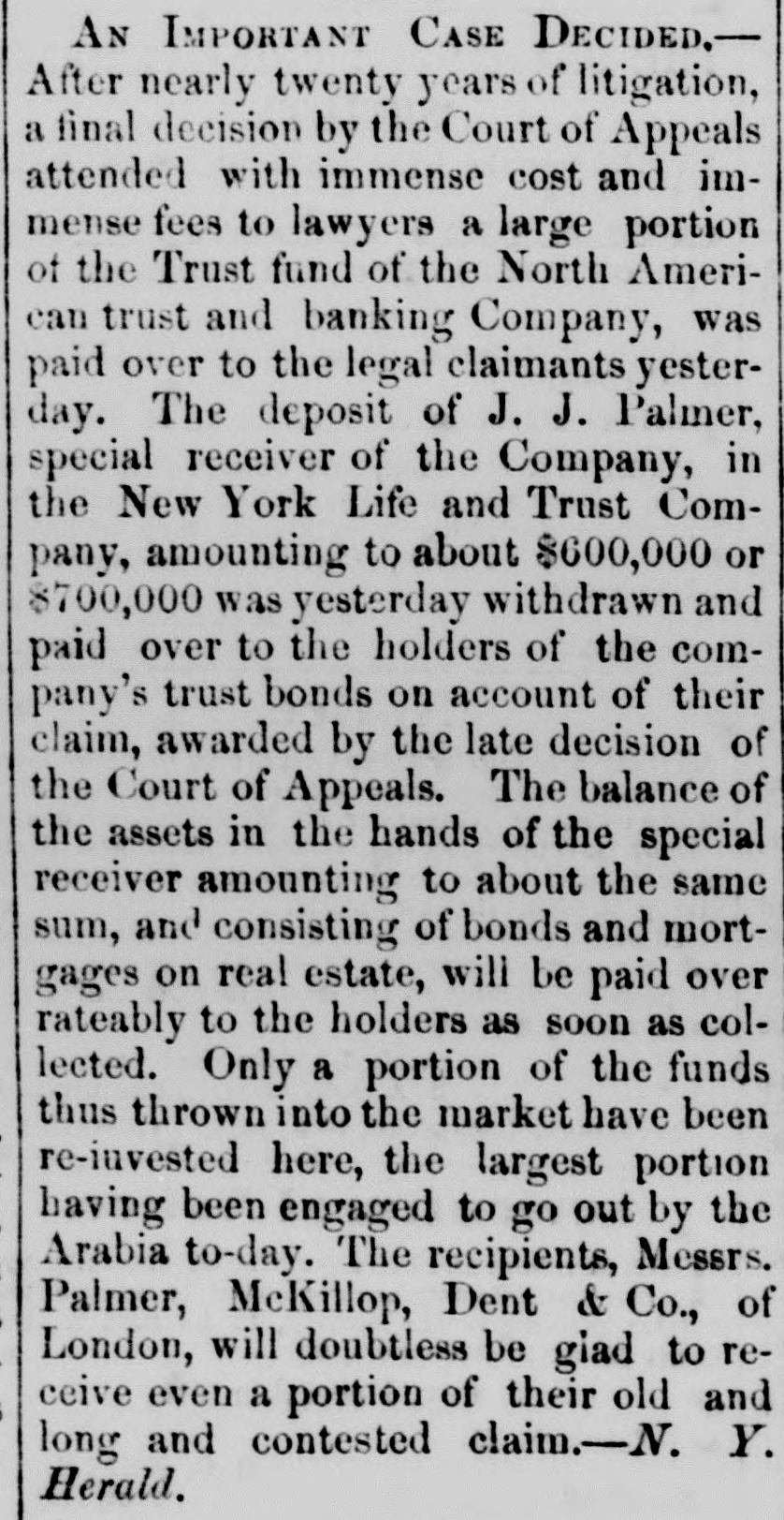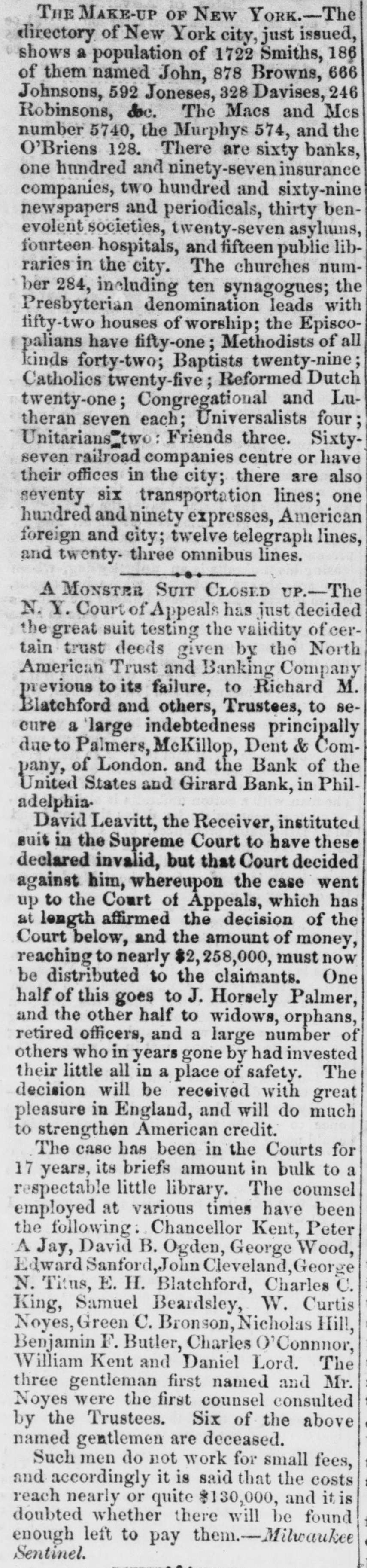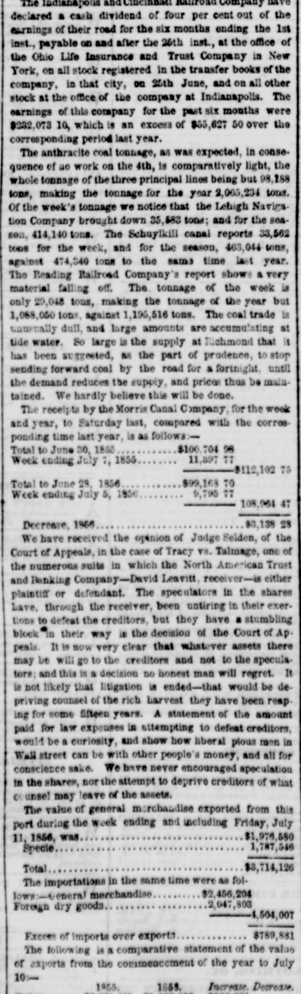 The Indianapolis and Company declared a cash dividend of four per cent out of the earnings of their road for the six months ending the 1st inst., payable on and after the 26th inst., at the office of the Ohio Life Insurance and Trust Company in New York, on all stock registered in the transfer books of the company, in that city, on 25th June, and on all other stock at the office of the company at Indianapolis. The earnings of this company for the past six months were $232,073 10, which is an excess of $55,627 50 over the corresponding period last year. The anthracite coal tonnage, as was expected, in consequence of no work on the 4th, is comparatively light, the whole tonnage of the three principal lines being but 98,188 tons, making the tonnage for the year 2,065,234 tons. Of the week's tonnage we notice that the Lehigh Navigation Company brought down 35,583 tons; and for the season, 414,140 tons. The Schuylkill canal reports 33,562 tops for the week, and for the season, 463,044 tons, against 474,340 tons to the same time last year. The Reading Railroad Company's report shows a very material falling off. The tonnage of the week is only 29,048 tons, making the tonnage of the year but 1,088,050 tons, against 1,195,516 tons. The coal trade is unusually dull, and large amounts are accumulating at tide water. So large is the supply at Richmond that it has been suggested, as the part of prudence, to stop sending forward coal by the road for a fortnight, until the demand reduces the supply, and prices thus be maintained. We hardly believe this will be done. The receipts by the Morris Canal Company, for the week and year, to Saturday last, compared with the corres. ponding time last year, is as follows:$100.704 98 Total to June 30, 1855 11,397 77 Week ending July 7, 1855 $112,102 75 $99,163 70 Total to June 28, 1856 9,795 77 Week ending July 5, 1856 108,964 47 $3,138 28 Decrease, 1866 We have received the opinion of Judge Selden, of the Court of Appeals, in the case of Tracy vs. Talmage, one of the numerous suits in which the North American Trust and Banking Company-David Leavitt, receiver-is either plaintiff or defendant. The speculators in the shares Lave. through the receiver, been untiring in their exertions to defeat the creditors, but they have a stumbling block'in their way in the decision of the Court of Ap. peals. It is now very clear that whatever assets there may be will go to the creditors and not to the speculators: and this is a decision no honest man will regret. It is not likely that litigation is ended-that would be depriving counsel of the rich harvest they have been reap. ing for some fifteen years. A statement of the amount paid for law expenses in attempting to defeat creditors, would be a curiosity, and show how liberal plous men in Wall street can be with other people's money, and all for conscience sake. We have never encouraged speculation in the shares, nor the attempt to deprive creditors of what unsel may leave of the assets. The value of general merchandise exported from this port during the week ending and including Friday, July $1,976,580 11, 1866, was 1,787,546 Specie Total $8,714,126 The importations in the same time were as fol$2,456,204 lows:-General merchandise 2,047,803 Foreign dry goods 4,504,007 $789,881 Excess of imports over exports The following is a comparative statement of the value of exports from the commencement of the year to July 10:1868. Increase. Decrease. 1855.