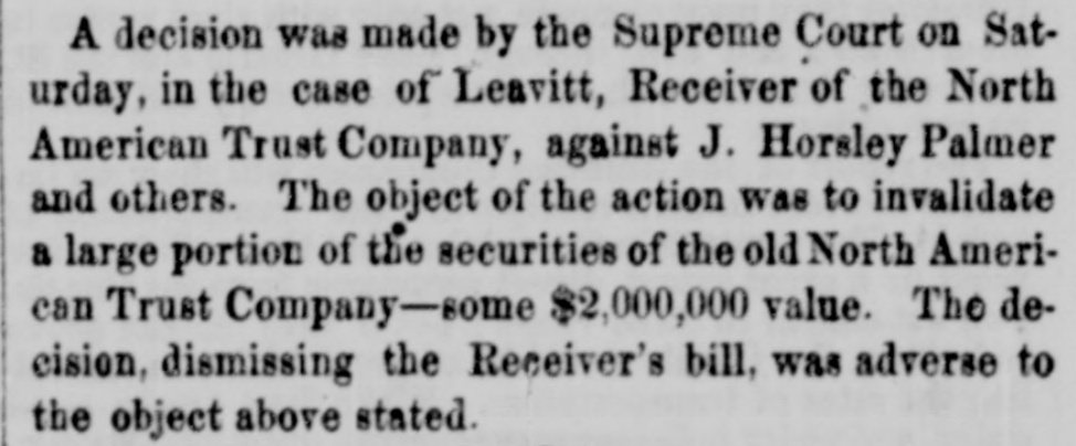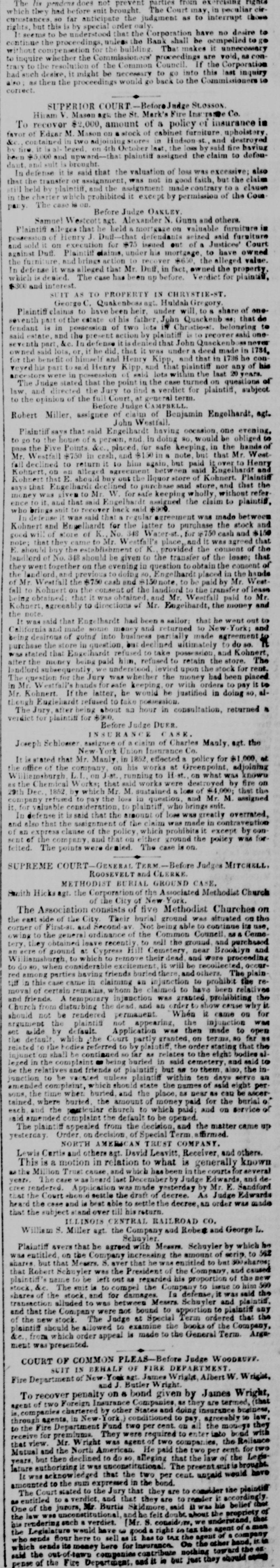 The Is pendens does not prevent parties from which they had before suit brought The Court may, in per uliar circuinstances so far anticipate the judgment as to interrupt those rights, but this is by special order only. seems to be understood that the Corporation have no desire to continue the proceedings, unless the Bank shall be compelled to go without compensation for the building That makes it unnecessary to inquire whether the Commissioners' proceedings are void, as contrary to the resolution of the Common Council. If the Corporation had such desire, it might be necessary to KO into this last inquiry also: as then the proceedings would go back to the Commissioners so correct. SUPERIOR COURT Stosson, Hiram V. Mason age the St. Mark's Fire Inst rane Co. To recover $2,000, amount of a policy of insurance in favor of Edgar M. Mason on a stock of cabinet furniture uphoistery & contained in two adjoining stores in Hudson and destroyed by fire it al- leged. on 4th October last, the loss by said fire having been $5,000 and upward-that plaintid assigned the claim to defenis brought. suit and dant. In defense it is said that the valuation of loss was excessive; also that the transfer or assignment, was not in good faith, but the claim still held by plaintiff, and the assignment made contrary to clause in the charter which prohibited it except by permission of the Com is on. case The pany Before Judge OAKLEY Samuel Westcott ngt. Alexander N. Gunn and others. Plaintiff alleges that he held mortgage on valuable furniture in possession of Henry J. Duff-that defendants seized said furniture and sold it on execution for $75 issued out of Justices' Court against Duff. Plaintiff claims, under his mortgage, to have owned the furniture and brings action to recover $650, the alleged value. In defense it was alleged that Mr. Duff, in fact, owned the property. which is demied. The case has been up before. Verdict for plaints $800 and interest. SUIT AS TO PROPERTY IN CHRYSTIE-ST. George C Quakenboss agt. Huldah Gregory Plaintiff claims to have been heir, under will, to share of oneseventh part of the estate of his father, John Quackenb - that de fendant is in possession of two lots in Christie-st. belonging to said estate. and the present action by plaintiff is to recover said one seventh part, &c. In defense it that John Quackenb as never owned said lots, or, if he did, that it was under deed made in 1784, for the benefit of himself and Henry Kipp, and that in 1736 he con veyedhis part said Henry Kipp and that plaintiff nor any of his ancestors were in possession said lots within the last 20 years. The Judge stated that the point in the case turned on questions of law, and directed the Jury to find a verdict for plaintiff, subject to the opinion of the full Court, at general term. CAMPBELL Before Judge Robert Miller, assignee of claim of Benjamin Engelhardt, agt. Westfall. John Plaintiff savs that said Engelhardt having occasion one evening, to go to the house of person, and in doing 80. would be obliged to pass the Five Points. & placed, for safe keeping, in the hands of Mr. Westfall $750 in cash, and $150 in a note. but that Mr. West fall declined to return it to him again, but paid it over to Henry Kohnert on on alleged agreement between said Engelhardt and Kohnert that E. should buy out the liquor store of Kohnert. Plaintiff says that Engelbardt declined to purchase said store, and that the money was given to Mr W for safe keeping wholly, without refer ence it and that said Engelha assigned the claim to plaintiff, who brings suit to recover back said $900 In defense was said that a gular agreement was made between Kohnert and Ingelhardt for the latter to purchase the stock and good wi of store of K No. 348 Water-st. for cash and $150 note: that they came to Mr. Westfall's place, and it was agreed that E. shou buy the establishment of K provided the consent of the landlord of No. 348 should be given to the transfer of the lease: that they went together on the evening in question to obtain the consent of the landlord and previous todoing Engelhardt placed in the hands of Mr. Westfall the $750 cash and $150 note to be paid by Mr. West fall to Kohnert on the consent of the landlord to the transfer of lease being obtained that it was obtained, and Mr. Westfall paid to Mr. Kohnert, agreeably to directions of Mr. Engelhardt, the money and the note It was said that Enge !hardt had been a sailor: that he went out to ifornia and some money and returned so New York; and being desirous of going into business partially made agreement hase the store in question, but declined ultimately to do so. TL stated that Enge hardt refused to take possession, and Kohnert, after the money being paid him, refused to retain the store. The landlord subsequently we understood. levied upon the stock for rent. The question for the Jury was whether the money had been placed in Mr. W estfall's hands for wafe keeping, or with orders to pay it to Mr. Kohnert. If the latter, he would be justified in doing so, although Englehardt refused to take possession. The Jury, after being about an hour in consultation, returned a verdict for plaintiff for $900, Before Judge DUER. IN R E ASE. Joseph Schlowser assignee of claim of Charles Manly, agt. the New York Union Insurance Co It is stated that Mr. Manly in 1852, effected policy for $1 000, et the office of the company on his works at Greenpoint, adjoining W illiemsburgh, on running to H on what was known 88 the Chemical W orks; that said works were destroyed by fire on 29th Dec. 1852 by which Mr. M. sustained loss of $4,000; that the company refused to pay the loss in question, and Mr. M assigned it. for valuable consideration, to plaintiff, who brings snit. In defense it is said that the amount of loss W88 greatly overrated, and also that the assignment of the claim was made in contravention of an express clanse of the policy, which prohibits it except by con sent of the company and that on eit