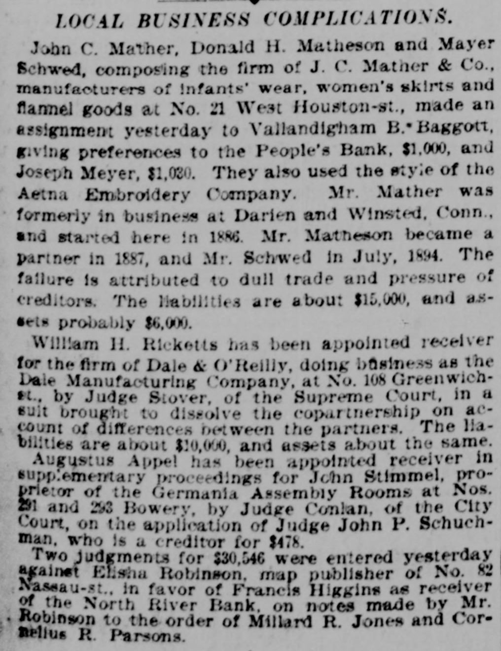 LOCAL BUSINESS COMPLICATIONS. John C. Mather, Donald H. Matheson and Mayer Schwed, composing the firm of J. C. Mather & Co., manufacturers of Infants' wear, women's skirts and flannel goods at No. 21 West Houston-st., made an assignment yesterday to Vallandigham B.*Baggott, giving preferences to the People's Bank, $1,000, and Joseph Meyer, $1,030. They also used the style of the Aetna Embroidery Company. Mr. Mather was formerly in business at Darien and Winsted, Conn., and started here in 1886. Mr. Matheson became a partner in 1887, and Mr. Schwed in July, 1894. The failure is attributed to dull trade and pressure of creditors. The liabilities are about $15,000, and assets probably $6,000. William H. Ricketts has been appointed receiver for the firm of Dale & O'Reilly, doing business as the Dale Manufacturing Company, at No. 108 Greenwichst., by Judge Stover, of the Supreme Court, in a suit brought to dissolve the copartnership on account of differences between the partners. The liabilities are about $10,000, and assets about the same. Augustus Appel has been appointed receiver in supplementary proceedings for John Stimmel, proprietor of the Germania Assembly Rooms at Nos. 291 and 293 Bowery, by Judge Conlan, of the City Court, on the application of Judge John P. Schuchman, who is a creditor for $478. Two judgments for $30,546 were entered yesterday against Elisha Robinson, map publisher of No. 82 Nassau-st.. in favor of Francis Higgins as receiver of the North River Bank, on notes made by Mr. Robinson to the order of Millard R. Jones and Cornelius R. Parsons.