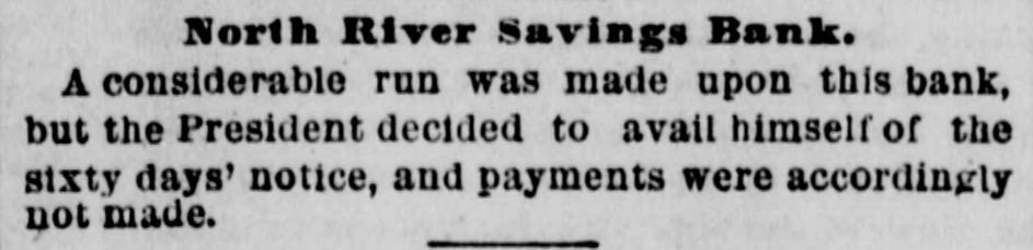 North River Savings Bank. A considerable run was made upon this bank, but the President decided to avail himself of the sixty days' notice, and payments were accordingly not made.