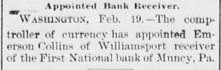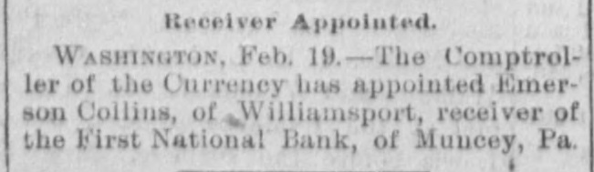 A BANK VAULT LOOTED. A Run by the Depositors-The Cashier Under Arrest. WILLIAMSPORT, PA., Jan. 11. -The First National Bank of Muncy was closed by order of Bank Examiner Dengler today. Previous to the announcement of the suspension there was a run, during which between $7,000 and $8,000, all the money on hand, was paid out. Dela Green, the cashier and ex-bank examiner for this dis trict, was arrested between 10 and 11 o'clock to-night, as startling disclosures were made during the evening. When Examiner Dengler arrived Saturday he found that a portion of the vault combination could not be opened, and he sent to New York for an expert. The man arrived last night and worked five bours before getting the vault door open. MONEY AND BONDS GONE. It was then found that $23,000 in money and bonds were gone, Shortly after this the excited depositors started a run. Dela Green was arrested while in bed and was taken before United States Commissioner Bentley, who demanded bail in $20,000. During the night he will remain in the custody of a deputy marshal. Examiner Dengler said this evening that the affa r3 of the bank are in bad shape, and it looks as if the institution bad been looted. A shortage of at least $40,000 has already been discovered, and the full amount, it is expected, will be much greater. The president is Capt. John W. Bowman, who also acted as cashier during the time that Dela Green was bank examiner. At ridnight the investigation is still under way, and full particulars will not be known until morning.