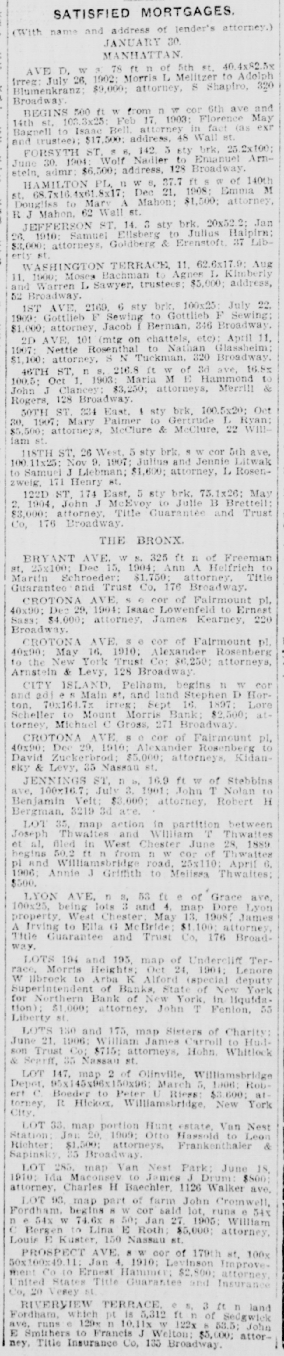 SATISFIED MORTGAGES. (With name and address of lender's attorney.) JANUARY 30. MANHATTAN. AVE D, w s 78 ft n of 5th st, 40.4x82.5x irreg; July 26, 1902: Morris L Melitzer to Adolph Blumenkranz; $9,000; attorney, S Shapiro, 320 Broadway. BEGINS 500 ft w from nw cor 6th ave and 14th st, 103.3x25; Feb 17, 1903: Florence May Bagnell to Isaac Bell, attorney in fact (as exr and trustee); $17,500; address, 48 Wall st. FORSYTH ST, s s, 142, 5 sty brk, 25.2x100; June 30, 1904: Wolf Nadler to Emanuel Arn- stein, admr; $6,500; address, 128 Broadway. HAMILTON PL, n w s, 37.7 ft s w of 140th st, 68.7x16.4x61.8x17; Dec 21, 1908; Emma M Dougliss to Mary A Mahon; $1,500; attorney, R J Mahon, 62 Wall st. JEFFERSON ST, 14, 3 sty brk, 20x52.2; Jan 26, 1910: Samuel Ellsberg to Julius Haipirn; $3,000; attorneys, Goldberg & Erenstoft, 37 Lib- erty st. WASHINGTON TERRACE, 11, 62.6x17.9; Aug 11, 1900; Moses Bachman to Agnes L Kimberly and Warren L Sawyer, trustees; $5,000; address, 52 Broadway. 1ST AVE, 2169, 6 sty brk, 100x25; July 22, 1909: Gottlieb F Sewing to Gottlieb F Sewing; $1,000; attorney, Jacob I Berman, 346 Broadway. 2D AVE, 101 (mtg on chattels, etc); April 11, 1907: Nettie Rosenthal to Nathan Glassheim; $1,100; attorney, S N Tuckman, 320 Broadway. 46TH ST, n s, 216.8 ft w of 3d ave, 16.8x 100.5; Oct 1, 1903: Maria M E Hammond to John J Clancey; $3,250; attorneys, Merrill & Rogers, 128 Broadway. 50TH ST, 334 East, sty brk, 100.5x20; Oct 30, 1907; Mary Palmer to Gertrude L Ryan; $5,500; attorneys, McClure & McClure, 22 Will- lam st. 118TH ST, 26 West, 5 sty brk, s w cor 5th ave, 100.11x25; Nov 9, 1907; Julius and Jennie Litwak to Samuel J Liebman; $1,600; attorney, L Rosen- zweig, 171 Henry st. 122D ST, 174 East, 5 sty brk, 75.1x26; May 2, 1904, John J McEvoy to Julie B Bretteil; $3,000; attorney, Title Guarantee and Trust Co, 176 Broadway. THE BRONX. BRYANT AVE, W s, 325 ft n of Freeman st, 25x100; Dec 15, 1904; Ann A Helfrich to Martin Schroeder; $1,750; attorney, Title Guarantee and Trust Co, 176 Broadway. CROTONA AVE, s e cor of Fairmount pl, 40x90; Dec 29, 1904: Isaac Lowenfeld to Ernest Sass; $4,000; attorney, James Kearney, 220 Broadway. CROTONA AVE, s e cor of Fairmount pl, 40x90; May 16, 1910; Alexander Rosenberg to the New York Trust Co; $6,250; attorneys, Arnstein & Levy, 128 Broadway. CITY ISLAND, Pelham, begins n w cor and adjs s Main st, and land Stephen D Hor- ton, 70x164.7x irreg; Sept 16, 1897: Lore Scheller to Mount Morris Bank; $2,500; at- torney, Michael C Gross, 271 Broadway. CROTONA AVE, s e cor of Fairmount pl, 40x90; Dec 29, 1910; Alexander Rosenberg to David Zuckerbrod; $5,000; attorneys, Kidansky & Levy, 35 Nassau st. JENNINGS ST, n s, 16.9 ft w of Stebbins ave, 100x16.7; July 3, 1901; John T Nolan to Benjamin Velt; $3,000; attorney, Robert H Bergman, 3219 3d ave. LOT 35, map action in partition between Joseph Thwaites and William T Thwaites et al, filed in West Chester June 28, 1889 begins 50.2 ft n from n w cor of Thwaites pl and Williamsbridge road, 25x110; April 6, 1906; Annie J Griffith to Melissa Thwaites; $500. LYON AVE, n s, 53 ft e of Grace ave, 100x25, being lots 3 and 4, map Dore Lyon property, West Chester, May 13, 1908, James A Irving to Ella G McBride; $1,100; attorney, Title Guarantee and Trust Co, 176 Broad- way. LOTS 194 and 195, map of Undercliff Ter- race, Morris Heights; Oct 24, 1901; Lenore Wilbrock to Arba K Alford (special deputy Superintendent of Banks, State of New York for Northern Bank of New York, in liquida- tion); $1,000; attorney, John T Fenton, 55 Liberty st. LOTS 150 and 175, map Sisters of Charity; June 21, 1906; William James Carroll to Hud- son Trust Co; $715; attorneys, Hohn, Whitlock & Scarff, 35 Nassau st. LOT 147, map 2 of Olinville, Williamsbridge Depot, 95x145x96x150x96; March 5, 1906; Rob- ert C Boeder to Peter U Riess; $3,600; at- torney, It Hickox, Williamsbridge, New York City. LOT 33, map portion Hunt estate, Van Nest Station; Jan 20, 1909; Otto Hassold to Leon Richter; $1,500; attorneys, Frankenthaler & Sapinsky, 35 Broadway. LOT 285, map Van Nest Park; June 18, 1910: Ida Maconsey to James J Drum: $800; attorney, Charles H Baechler, 1126 Walker ave. LOT 93, map part of farm John Cromwell, Fordham, begins s w cor said lot, runs e 54 x w 74.6x s 50; Jan 27, 1905; William C Bergen to Lina E Roth; $5,000; attorney, Louis E Kuster, 150 Nassau st. PROSPECT AVE, s w cor of 179th st, 100x 50x100x49.11; Jan 4, 1910; Levinson Improve- ment Co to Ernest Hammer; $2,500; attorney, United States Title Guarantee and Insurance Co, 20 Vesey st. RIVERVIEW TERRACE, e s, 3 ft n land Fordham, which pt is 5,312 ft n of Sedgwick ave, runs e 129x n 10.11x w 122x s 58.5; John E Smithers to Francis J Welton; $5,000; attor- ney, Title Insurance Co, 135 Broadway.