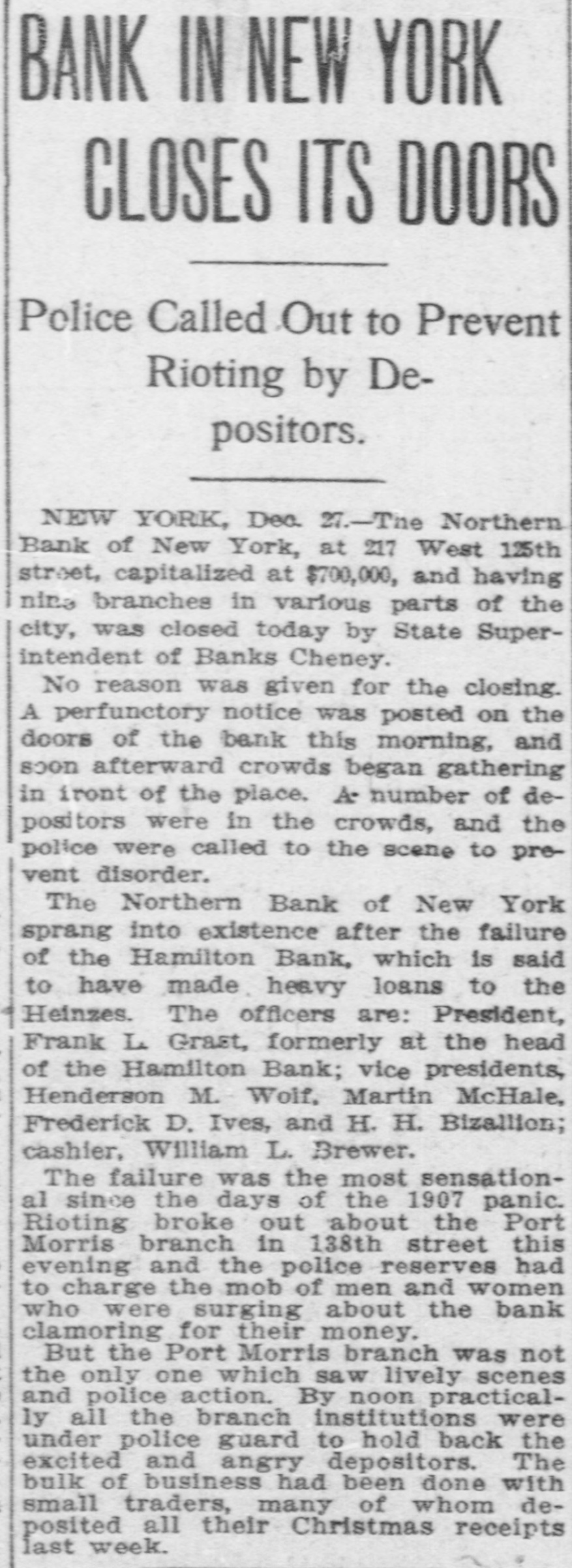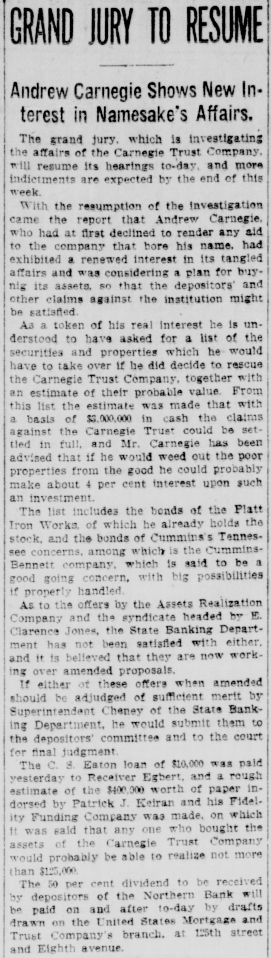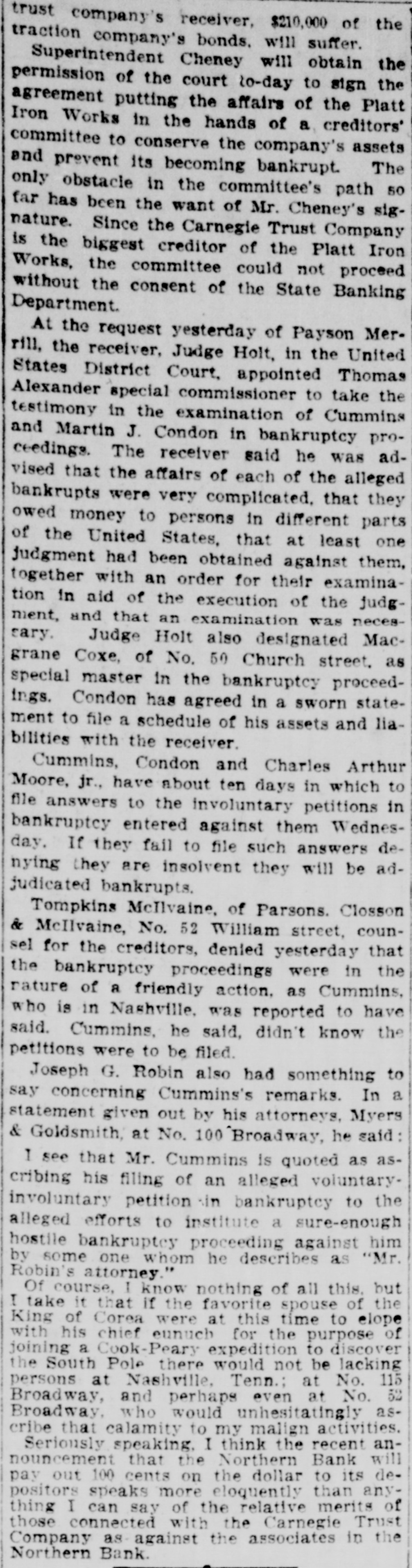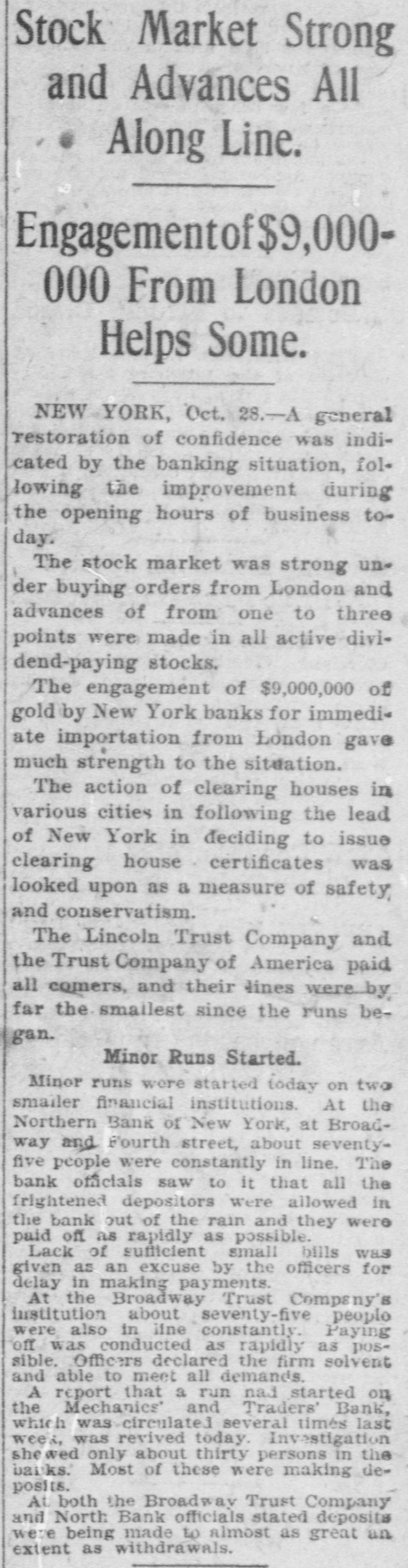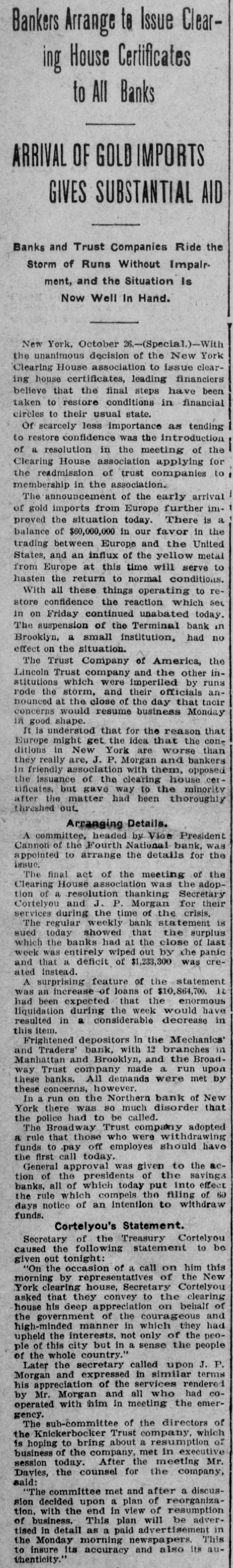Bankers Arrange to Issue Clearing House Certificates to All Banks ARRIVAL OF GOLD IMPORTS GIVES SUBSTANTIAL AID Banks and Trust Companies Ride the Storm of Runs Without Impairment, and the Situation Is Now Well In Hand. New York, October 26.-(Special.)-With the unanimous decision of the New York Clearing House association to issue clearing house certificates, leading financiers believe that the final steps have been taken to restore conditions in financial circles to their usual state. Of scarcely less importance as tending to restore confidence was the introduction of a resolution in the meeting of the Clearing House association applying for the readmission of trust companies to membership in the association. The announcement of the early arrival of gold imports from Europe further improved the situation today. There is a balance of $60,000,000 in our favor in the trading between Europe and the United States, and an influx of the yellow metal from Europe at this time will serve to hasten the return to normal conditions. With all these things operating to restore confidence the reaction which seu in on Friday continued unabated today. The suspension of the Terminal bank in Brooklyn, a small institution, had no effect on the situation. The Trust Company of America, the Lincoln Trust company and the other institutions which were imperiled by runs rode the storm, and their officials announced at the close of the day that tneir concerns would resume business Monday in good shape. It is understod that for the reason that Europe might get the idea that the cone ditions in New York are worse than they really are, J. P. Morgan and bankers in friendly association with them, opposed the issuance of the clearing house cer tificates, but gave way to the minority after the matter had been thoroughly threshed out Arranging Details. A committee, headed by Vice President Cannon of the Fourth National bank. was appointed to arrange the details for the issue. The final act of the meeting of the Clearing House association was the adoption of a resolution thanking Secretary Cortelyou and J. P. Morgan for their services during the time of the crisis, The regular weekly bank statement is sued today showed that the surplus which the banks had at the close of last week was entirely wiped out by the panic and that a deficit of $1,233,300 was created instead. A surprising feature of the statement was an increase of loans of $10,864,700. 11 had been expected that the enormous liquidation during the week would have resulted in a considerable decrease in this item. Frightened depositors in the Mechanics' and Traders bank. with 12 branches in Manhattan and Brooklyn, and the Broadway Trust company made a run upon these banks. All demands were met by these concerns, however. In a run on the Northern bank of New York there was so much disorder that the police had to be called. The Broadway Trust company adopted a rule that those who were withdrawing funds to pay off employes should have the first call today. General approval was given to the action of the presidents of the saving3 banks, all of which today put into effect the rule which compels the filing of 60 days notice of an intention to withdraw funds. Cortelyou's Statement. Secretary of the Treasury Cortelyou caused the following statement to be given out tonight: "On the occasion of a call on him this morning by representatives of the New York clearing house, Secretary Cortelyou asked that they convey to the clearing house his deep appreciation on behalf of the government of the courageous and high-minded manner in which they had upheld the interests, not only of the people of this city but in a sense the people of the whole country.' " Later the secretary called upon J. P. Morgan and expressed in similar terms his appreciation of the services rendered by Mr. Morgan and all who had cooperated with him in meeting the emergency. The sub-committee of the directors of the Knickerbocker Trust company, which is hoping to bring about a resumption of business of the company, met in executive session today. After the meeting Mr. Davies, the counsel for the company, said: "The committee met and after a discussion decided upon a plan of reorganization, with the end in view of resumption of business. This plan will be advertised in detail as a paid advertisement in the Monday morning newspapers. This to insure its accuracy and also its authenticity."