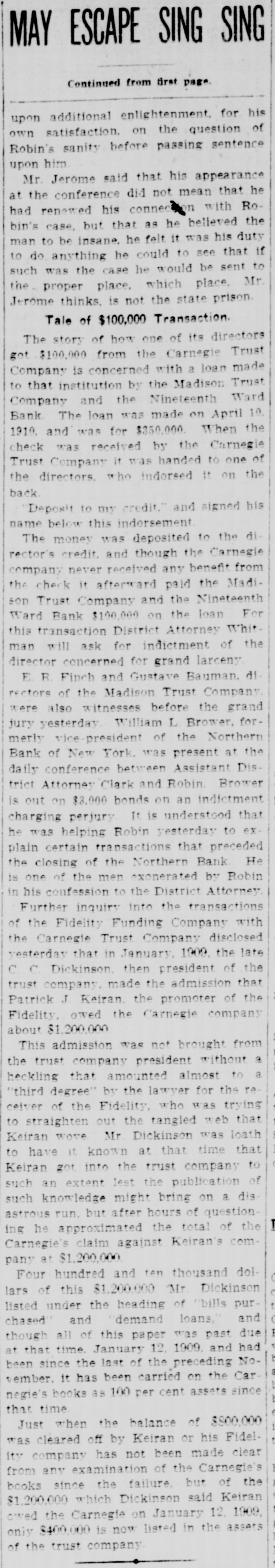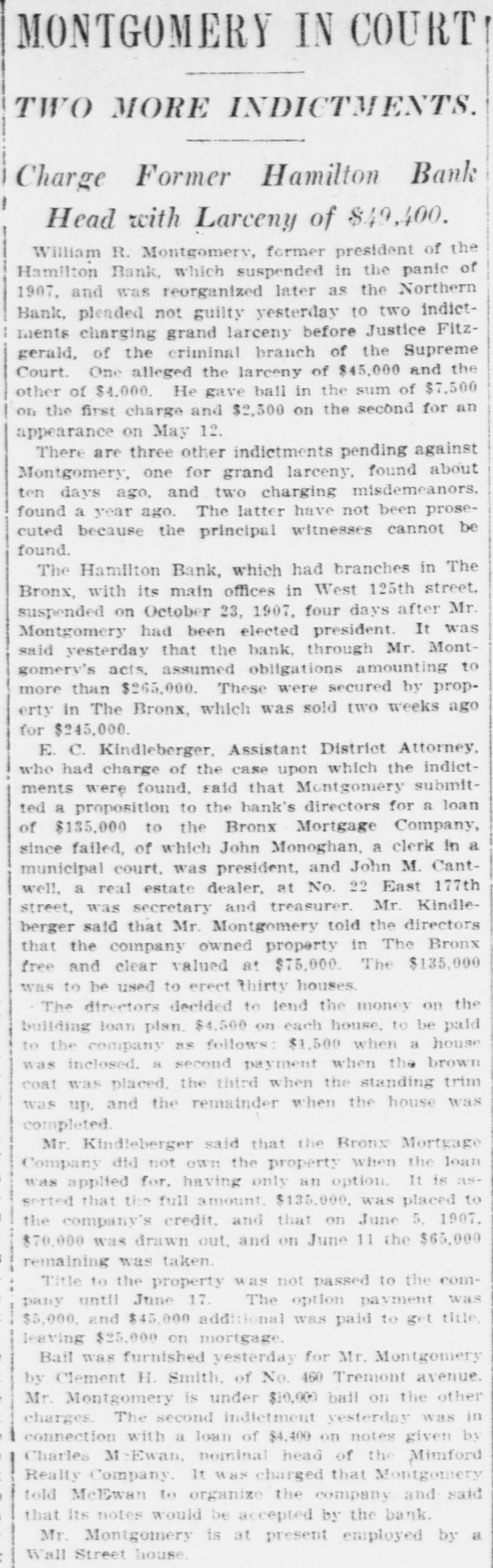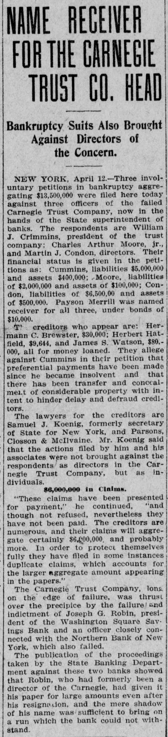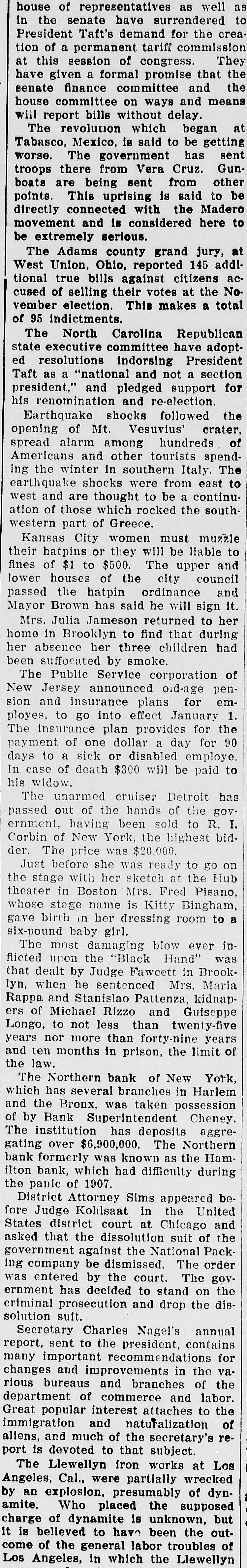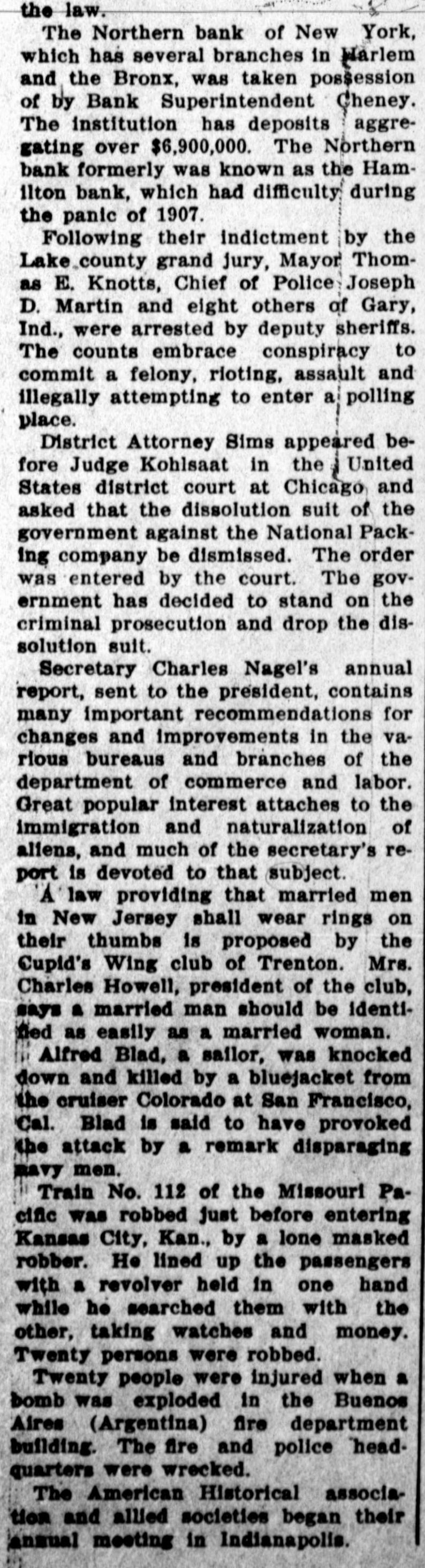Bankers Arrange to Issue Clearing House Certificates to All Banks ARRIVAL OF GOLD IMPORTS GIVES SUBSTANTIAL AID Banks and Trust Companies Ride the Storm of Runs Without Impairment, and the Situation Is Now Well In Hand. New York, October 26.-(Special.)-With the unanimous decision of the New York Clearing House association to issue clearing house certificates, leading financiers believe that the final steps have been taken to restore conditions in financial circles to their usual state. Of scarcely less importance as tending to restore confidence was the introduction of a resolution in the meeting of the Clearing House association applying for the readmission of trust companies to membership in the association. The announcement of the early arrival of gold imports from Europe further improved the situation today. There is a balance of $60,000,000 in our favor in the trading between Europe and the United States, and an influx of the yellow metal from Europe at this time will serve to hasten the return to normal conditions. With all these things operating to restore confidence the reaction which seu in on Friday continued unabated today. The suspension of the Terminal bank in Brooklyn, a small institution, had no effect on the situation. The Trust Company of America, the Lincoln Trust company and the other institutions which were imperiled by runs rode the storm, and their officials announced at the close of the day that tneir concerns would resume business Monday in good shape. It is understod that for the reason that Europe might get the idea that the cone ditions in New York are worse than they really are, J. P. Morgan and bankers in friendly association with them, opposed the issuance of the clearing house cer tificates, but gave way to the minority after the matter had been thoroughly threshed out Arranging Details. A committee, headed by Vice President Cannon of the Fourth National bank. was appointed to arrange the details for the issue. The final act of the meeting of the Clearing House association was the adoption of a resolution thanking Secretary Cortelyou and J. P. Morgan for their services during the time of the crisis, The regular weekly bank statement is sued today showed that the surplus which the banks had at the close of last week was entirely wiped out by the panic and that a deficit of $1,233,300 was created instead. A surprising feature of the statement was an increase of loans of $10,864,700. 11 had been expected that the enormous liquidation during the week would have resulted in a considerable decrease in this item. Frightened depositors in the Mechanics' and Traders bank. with 12 branches in Manhattan and Brooklyn, and the Broadway Trust company made a run upon these banks. All demands were met by these concerns, however. In a run on the Northern bank of New York there was so much disorder that the police had to be called. The Broadway Trust company adopted a rule that those who were withdrawing funds to pay off employes should have the first call today. General approval was given to the action of the presidents of the saving3 banks, all of which today put into effect the rule which compels the filing of 60 days notice of an intention to withdraw funds. Cortelyou's Statement. Secretary of the Treasury Cortelyou caused the following statement to be given out tonight: "On the occasion of a call on him this morning by representatives of the New York clearing house, Secretary Cortelyou asked that they convey to the clearing house his deep appreciation on behalf of the government of the courageous and high-minded manner in which they had upheld the interests, not only of the people of this city but in a sense the people of the whole country.' " Later the secretary called upon J. P. Morgan and expressed in similar terms his appreciation of the services rendered by Mr. Morgan and all who had cooperated with him in meeting the emergency. The sub-committee of the directors of the Knickerbocker Trust company, which is hoping to bring about a resumption of business of the company, met in executive session today. After the meeting Mr. Davies, the counsel for the company, said: "The committee met and after a discussion decided upon a plan of reorganization, with the end in view of resumption of business. This plan will be advertised in detail as a paid advertisement in the Monday morning newspapers. This to insure its accuracy and also its authenticity."