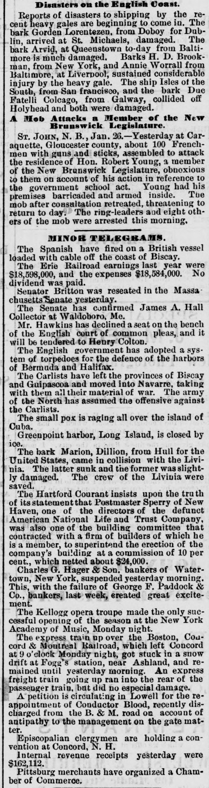 # Disasters on the English Coast. Reports of disasters to shipping by the recent heavy gales are beginning to come in. The bark Gorden Lorentezen, from Doboy for Dublin, arrived at St. Michaels, damaged. The bark Arvid, at Queenstown to-day from Baltimore is much damaged. Barks H. D. Brook-man, from New York, and Annie Worrall from Baltimore, at Liverpool, sustained considerable injury by the heavy gale. The ship Isles of the South, from San francisco, and the bark Duc Fatelli Colcago, from Galway, collided off Holyhead and both were damaged. # A Mob Attacks a Member of the New Brunswick Legislature. ST. JOHN, N. B., Jan. 26.-Yesterday at Caraquette, Gloucester county, about 100 French-men with guns and sticks, assembled to attack the residence of Hon. Robert Young, a member of the New Brunswick Legislature, obnoxious to them on account of his action in reference to the government school act. Young had his premises barricaded and armed inside. The mob after consultation retreated, threatening to return to day. The ring-leaders and eight others of the mob were arrested this morning. # MINOR TELEGRAMS. The Spanish have fired on a British vessel loaded with cable off the coast of Biscay. The Erie Railroad earnings last year were $18,598,000, and the expenses $18,584,000. No dividend was paid. Senator Britton was reseated in the Massachusetts Senate yesterday. The Senate has confirmed James A. Hall Collector at Waldoboro, Me. Mr. Hawkins has declined a seat on the bench of the English court of common pleas, and it will be tendered to Henry Colton. The English government has adopted a system of torpedoes for the defence of the harbors of Bermuda and Halifax. The Carlists have left the provinces of Biscay and Guipascoa and moved into Navarre, taking with them all their material of war. The army of the North has assumed the offensive against the Carlists. The small pox is raging all over the island of Cuba. Greenpoint harbor, Long Island, is closed by ice. The bark Marion, Dillion, from Hull for the United States, came in collision with the Livinia. The latter sunk and the former was slightly damaged. The crew of the Livinia were saved. The Hartford Courant insists upon the truth of its statement that Postmaster Sperry of New Haven, one of the directors of the defunct American National Life and Trust Company, was also one of the building committee that contracted with a firm of builders of which he is a member, to superintend the erection of the company's building at a commission of 10 per cent., which netted about $24,000. Charles G. Hager & Son, bankers of Watertown, New York, suspended yesterday morning. This, with the failure of George F. Paddock & Co., bankers, last week, created great excitement. The Kellogg opera troupe made the only successful opening of the season at the New York Academy of Music, Monday night. The express train up over the Boston, Concord & Montreal Railroad, which left Concord at 9 o'clock Monday night, got stuck in a snow drift at Fogg's station, near Ashland, and remained until yesterday morning. An express freight train going up ran into the rear of the passenger train, but did no especial damage. A petition is circulating in Lowell for the reappointment of Conductor Blood, recently discharged from the B. & M. road on account of antipathy to the management on the gate matter. Episcopalian clergymen are holding a convention at Concord, N. H. Internal revenue receipts yesterday were $162,112. Pittsburg merchants have organized a Chamber of Commerce.