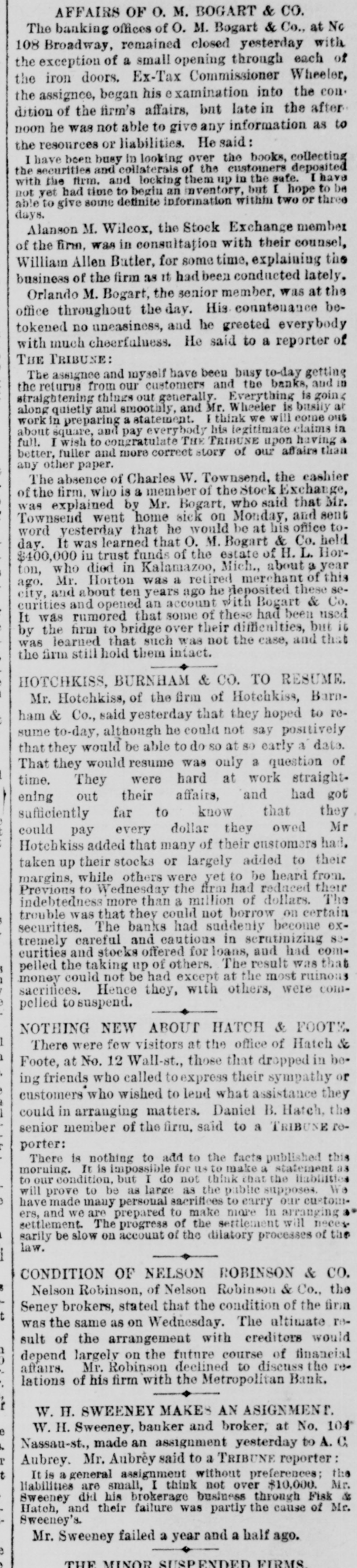 AFFAIRS OF O. M. BOGART & CO. The banking offices of O. M. Bogart & Co., at No 108 Broadway, remained closed yesterday with the exception of a small opening through each of the iron doors. Ex-Tax Commissioner Wheeler, the assignee, began his e xamination into the con. dition of the firm's affairs, but late in the after noon he was not able to give any information as to the resources or liabilities. He said I have been busy In looking over the books, collecting the securities and collaterals of the customers deposited with the firm. and locking them up in the safe. I have not yet had time to begin an inventory, but I hope to be able to give some definite information within two or three days. Alanson M. Wilcox, the Stock Exchange member of the firm, was in consultation with their counsel, William Allen Butler, for some time, explaining the business of the firm as it had been conducted lately. Orlando M. Bogart, the senior member, was at the office throughout the day. His conntenance betokened no uneasiness, and he greeted everybody with much cheerfuluess. He said to a reporter of THE TRIBUNE: The assignee and myself have been busy to-day getting the returns from our customers and the banks, and in straightening things out generally. Everything is going along quietly and smoothly, and Mr. Wheeler is busily at work in preparing a statement. I think we will come out about square, and pay everybody his legitimate claims in full. I wish to congratulate THE TRIBUNE upon having a better, fuller and more correct story of our affairs than any other paper. The absence of Charles W. Townsend. the eashier of the firm, who is a member of the Stock Exchange, was explained by Mr. Bogart, who said that Mr. Townsend went home sick on Monday, and sent word yesterday that he would be at his office today. It was learned that O. M. Bogart & Co. held $400,000 in trust funds of the estate of H. L. Horton, who died in Kalamazoo, Mich., about a year ago. Mr. Horton was a retired merchant of this city, and about ten years ago he deposited these securities and opened an account with Bogart & Co. It was rumored that some of these had been used by the firm to bridge over their difficulties, but it was learned that such was not the case, and that the firm still hold them intact. HOTCHKISS, BURNHAM & CO. TO RESUME. Mr. Hotehkiss, of the firm of Hotehkiss, Barnham & Co., said yesterday that they hoped to resume to-day, although he could not say positively that they would be able to do so at so early a date. That they would resume was only a question of time. They were hard at work straightening out their affairs, and had got sufficiently far to know that they could pay every dollar they owed Mr Hotehkiss added that many of their customers had. taken up their stocks or largely added to their margins, while others were yet to be heard from. Previous to Wednesday the firm had reduced their indebtedness more than a million of dollars. The trouble was that they could not borrow on certain securities. The banks had suddenly become extremely careful and cautious in scrutinizing 88curities and stocks offered for loans, and had compelled the taking up of others. The result was that money could not be had except at the most ruinous sacrifices. Hence they, with others, were compelled tosuspend. NOTHING NEW ABOUT HATCH & FOOTE. There were few visitors at the office of Hatch & Foote, at No. 12 Wall-st., those that dropped in being friends who called to express their sympathy or customers who wished to lend what assistance they could in arranging matters. Daniel B. Hatch, the senior member of the firm, said to a TRIBUNE reporter: There is nothing to add to the facts published this morning. It is impossible for us to make a statement as to our condition, but I do not think that the liabilities will prove to be as large as the public supposes. We have made many personal sacrifices to earry our customers, and we are prepared to make more in arranging settlement. The progress of the settlement will necessarily be slow on account of the dilatory processes of the law. CONDITION OF NELSON ROBINSON & CO. Nelson Robinson, of Nelson Robinson & Co., the Seney brokers, stated that the condition of the firm was the same as on Wednesday. The ultimate result of the arrangement with creditors would depend largely on the future course of financial affairs. Mr. Robinson declined to discuss the relations of his firm with the Metropolitan Bank. W. H. SWEENEY MAKES AN ASIGNMENT. W. H. Sweeney, banker and broker, at No. 104 Nassau-st,, made an assignment yesterday to A. C, Aubrey. Mr. Aubrêy said to a TRIBUNE reporter It is a general assignment without preferences; the liabilities are small, I think not over $10,000. Mr. Sweeney did his brokerage business through Fisk & Hatch, and their failure was partly the cause of Mr. Sweeney's. Mr. Sweeney failed a year and a half ago. THE MINOR SUSPENDED FIRMS