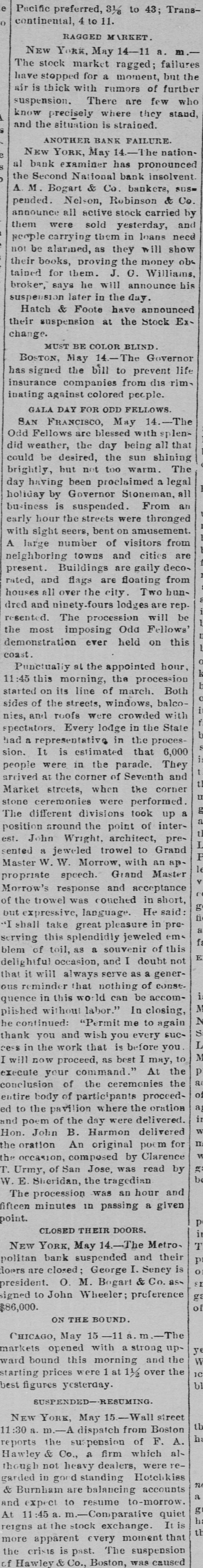 continental, 4 10 11. RAGGED MARKET NEW YORK, May 14-11 a. The stock market ragged; failures for a but the rumors air is stopped thick with moment, of further suspension. There are few who know precisely where they stand, and the situation is strained. ANOTHER BANK FAILURE. NEW YORK, May 14.-The national bank examiner has pronounced the Second National bank insolvent. M. Bogart & Co. bankers, SUS= Robinson & announce pended. all Nelson, active stock carried Co. by them were sold yesterday, and people carrying them in loans need not be alarmed, as they will show the obs them. J. their tained books, for proving G. money Williams, broker, says he will announce his suspension later in the day. Hatch & Foote have announced their suspension at the Stock Exchange. MUST BE COLOR BLIND. BOSTON, May 14.-The Governor has signed the bill to prevent life insurance companies from dis rim, inating against colored people. GALA DAY FOR ODD FELLOWS. SAN FRANCISCO, May 14.-The Odd Fellows are blessed with splen> that sun could did weather, be desired, the day the being shining all not too day been a all holiday brightly, having by but Governor proclaimed Stoneman, warm. legal The streets were seers, on amusement. business early with sight hour is the suspended. bent From thronged an A large number of visitors from neighboring towns and cities are present. Buildings are gaily decorated, and flags are floating from houses all over the city. Two hundred and ninety-fours lodges are rep. resented. The procession will be the most imposing Odd Fellows' demonstration ever held on this coast Punctually al the appointed hour, 11:45 this morning, the procession started on its line of march. Both sides of the streets, windows, balconies, and roofs were crowded with spectators. Every lodge in the State had a representative in the procession. It is estimated that 6,000 people were in the parade. They arrived at the corner of Seventh and Market streets, when the corner 11 stone ceremonies were performed. The different divisions took up a position around the point of interest. John Wright. architect, preL sented a jeweled trowel to Grand P Master W. W. Morrow, with an aple propriate speech. Grand Master Morrow's response and acceptance of the trowel was couched in short, g but expressive, language. He said: ti "I shall take great pleasure in prea serving this splendidly jeweled em fa blem of toil, as a souvenir of this delightful occasion, and I doubt not that it will always serve as a generous reminder that nothing of consequence in this world can be accomM plished without labor." In closing, N he continued: "Permit me to again S thank you and wish you every sucL cess in the work that is before you. M I will now proceed, as best I may, to pl execute your command." At the a conclusion of the ceremonies the of entire body of participants proceed~ a ed to the pavilion where the oration in and poem of the day were delivered. W Hon. John B. Harmon delivered III the oration An original poem for W the occasion, composed by Clarence g T. Urmy, of San Jose, was read by be W. E. Sheridan, the tragedian The procession was an hour and fifteen minutes in passing a given point. p CLOSED THEIR DOORS. in T NEW YORK, May 14.-The Metro, politan bank suspended and their pt o doers are closed: George I. Seney is SI president. O. M. Bogart & Co. ass ga signed to John Wheeler; preference of $86,000. ON THE BOUND. CHICAGO, May 15 -11 a. m -The ye markets opened with a strong upW ward bound this morning and the 1C starting prices were 1 at 11/2 over the bl best figures yesterday. SUSPENDED-RESUMING. NEW YORK, May 5.-Wall street th 11:30 a. m.-A dispatch from Boston ha reports the suspension of F. A. Hawley & Co., a firm which although not heavy dealers, were regarded in good standing Hotelkies n & Burnham are balancing accounts a and expect to resume to-morrow. gi At 11:45 a. m.-Comparative quiet h reigns at the stock exchange. It is th more apparent every moment that the crists is past. The suspension cf Hawley & Co., Boston, was caused