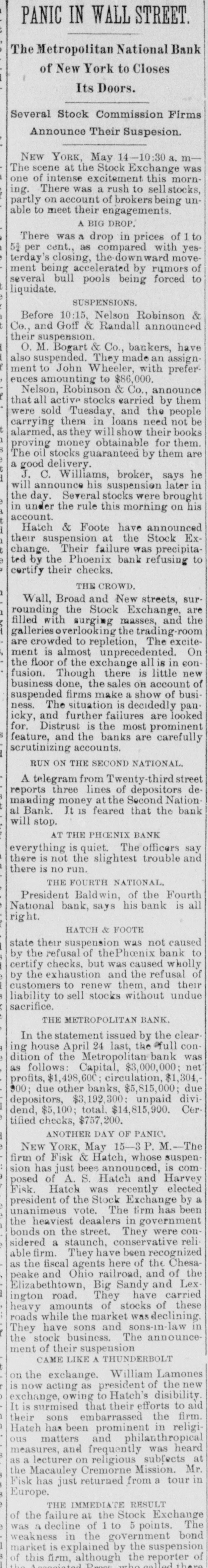 PANIC IN WALL STREET. The Metropolitan National Bank of New York to Closes Its Doors. Several Stock Commission Firms Announce Their Suspesion. NEW YORK, May 14-10:30 a. mThe scene at the Stock Exchange was one of intense excitement this morning. There was a rush to sell stocks, partly on account of brokers being unable to meet their engagements. A BIG DROP. There was a drop in prices of 1 to 54 per cent., as compared with yesterday's closing, the-downward movement being accelerated by rumors of several bull pools being forced to liquidate. SUSPENSIONS. Before 10:15, Nelson Robinson & Co., and Goff & Randall announced their suspension. O. M. Bogart & Co., bankers, have also suspended. They made an assignment to John Wheeler, with preferences amounting to $86,000. Nelson, Robinson & Co., announce that all active stocks earried by them were sold Tuesday, and the people carrying them in loans need not be alarmed, as they will show their books proving money obtainable for them. The oil stocks guaranteed by them are a good delivery. J. C. Williams, broker, says he will announce his suspension later in the day. Several stocks were brought in under the rule this morning on his account. Hatch & Foote have announced their suspension at the Stock Exchange. Their failure was precipitated by the Phoenix bank refusing to certify their checks. THE CROWD. Wall, Broad and New streets, surrounding the Stock Exchange, are filled with surging masses, and the galleries overlooking the trading-room are crowded to repletion, The excitement is almost unprecedented. On the floor of the exchange all is in confusion. Though there is little new business done, the sales OH account of suspended firms make a show of business. The situation is decidedly panicky, and further failures are looked for. Distrust is the most prominent feature, and the banks are carefully scrutinizing accounts. RUN ON THE SECOND NATIONAL. A telegram from Twenty-third street reports three lines of depositors demanding money at the Second National Bank. It IS feared that the bank will stop. AT THE PHOENIX BANK everything is quiet. The officers say there is not the slightest trouble and there is no run. THE FOURTH NATIONAL. President Baldwin, of the Fourth National bank, says his bank is all right. HATCH & FOOTE state their suspension was not caused by the refusal of thePhoenix bank to certify checks, but was caused wholly by the exhaustion and the refusal of customers to renew them, and their liability to sell stocks without undue sacrifice. THE METROPOLITAN BANK. In the statement issued by the clearing house April 24 last, the full condition of the Metropolitan bank was as follows: Capital, $3,000,000; net profits, $1,498,600; circulation, $1,304,900; due other banks, $5,815,000; due depositors, $3,192,300: unpaid dividend, 100; total. $14,815,900. Certified checks, $757,200. ANOTHER DAY OF PANIC. NEW YORK, May 15-3 P. M.-The firm of Fisk & Hatch, whose suspension has just beee announced, is composed of A. S. Hatch and Harvey Fisk. Hatch was recently elected president of the Stock Exchange by a unanimous vote. The firm has been the heaviest deaalers in government bonds on the street. They were considered a staunch, conservative reliable firm. They have been recognized as the fiscal agents here of the Chesapeake and Ohio railroad. and of the