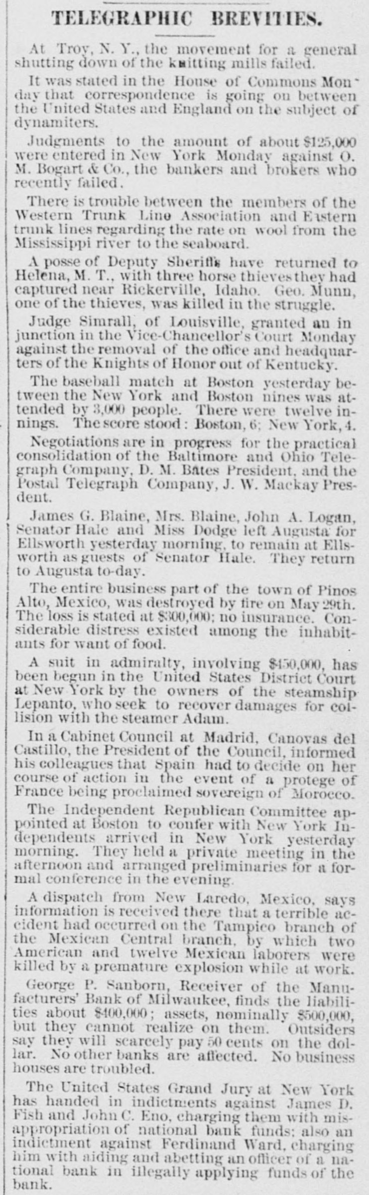 TELEGRAPHIC BREVITIES. At Troy, N. Y., the movement for a general shutting down of the kmitting mills failed. It was stated in the House of Commons Mon day that correspondence is going on between the United States and England on the subject of dynamiters. Judgments to the amount of about $125,000 were entered in New York Monday against O. M. Bogart & Co., the bankers and brokers who recently failed. There is trouble between the members of the Western Trunk Line Association and Eastern trunk lines regarding the rate on wool from the Mississippi river to the seaboard. A posse of Deputy Sheriffs have returned to Helena, M. T., with three horse thieves they had captured near Rickerville, Idaho, Geo. Munn, one of the thieves, was killed in the struggle. Judge Simrall, of Louisville, granted an in junction in the Vice-Chancellor's Court Monday against the removal of the office and headquarters of the Knights of Honor out of Kentucky. The baseball match at Boston yesterday between the New York and Boston nines was attended by 3,000 people. There were twelve innings. The score stood: Boston, 6; New York, 4. Negotiations are in progress for the practical consolidation of the Baltimore and Ohio Telegraph Company, D. M. Bates President, and the Postal Telegraph Company, J. W. Mackay Presdent. James G. Blaine, Mrs. Blaine, John A. Logan, Senator Hale and Miss Dodge left Augusta for Ellsworth yesterday morning, to remain at Ellsworth as guests of Senator Hale. They return to Augusta to-day. The entire business part of the town of Pinos Alto, Mexico, was destroyed by fire on May 29th. The loss is stated at $300,000; no insurance. Considerable distress existed among the inhabitants for want of food. A suit in admiralty, involving $450,000, has been begun in the United States District Court at New York by the owners of the steamship Lepanto, who seek to recover damages for collision with the steamer Adam. In a Cabinet Council at Madrid, Canovas del Castillo, the President of the Council, informed his colleagues that Spain had to decide on her course of action in the event of a protege of France being proclaimed sovereign of Morocco. The Independent Republican Committee appointed at Boston to confer with New York Independents arrived in New York yesterday morning. They held a private meeting in the afternoon and arranged preliminaries for a formal conference in the evening. A dispatch from New Laredo, Mexico, says information is received there that a terrible accident had occurred on the Tampico branch of the Mexican Central branch, by which two American and twelve Mexican laborers were killed by a premature explosion while at work. George P. Sanborn, Receiver of the Manufacturers' Bank of Milwaukee, finds the liabilities about $400,000; assets, nominally $500,000, but they cannot realize on them. Outsiders say they will scarcely pay 50 cents on the dollar. No other banks are affected. No business houses are troubled. The United States Grand Jury at New York has handed in indictments against James D. Fish and John C. Eno, charging them with misappropriation of national bank funds: also an indictiment against Ferdinand Ward, charging him with aiding and abetting an officer of a national bank in illegally applying funds of the bank.