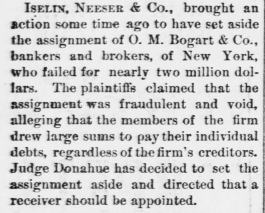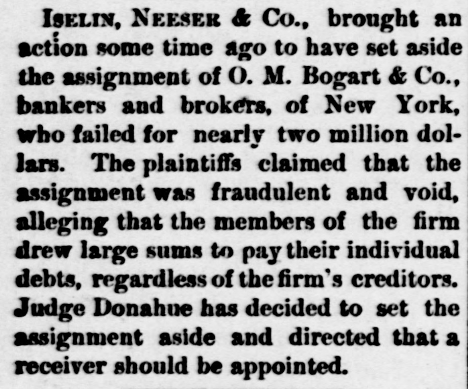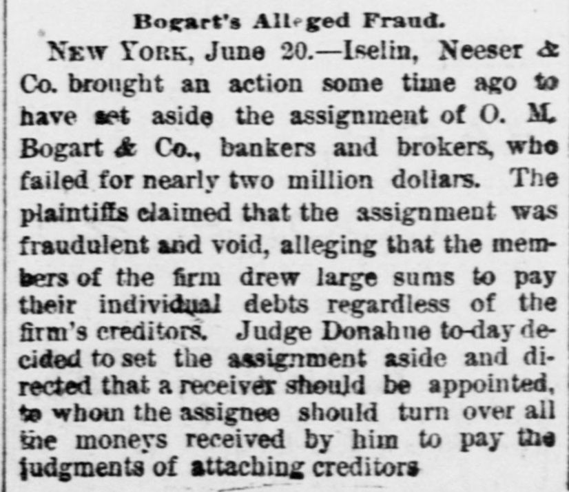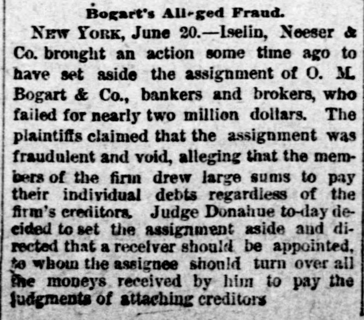 Bogart's Alleged Fraud. NEW YORK, June 20.-Iselin, Neeser & Co. brought an action some time ago to have set aside the assignment of O. M. Bogart & Co., bankers and brokers, who failed for nearly two million dollars. The plaintiffs claimed that the assignment was fraudulent and void, alleging that the members of the firm drew large sums to pay their individual debts regardless of the firm's creditors. Judge Donahue to-day decided to set the assignment aside and directed that a receiver should be appointed, to whom the assignee should turn over all the moneys received by him to pay the judgments of attaching creditors