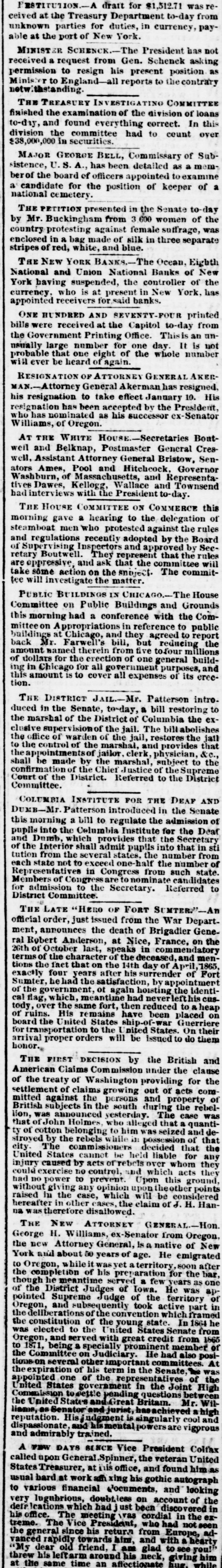ESTITUTION A draft for 1,512.71 was ceived at the Treasury Department to-day from unknown parties for duties, in currency, payable at the port of New York. MINIST ER SCHENCK. The President has not received a request from Gen. Schenck asking permission to resign his present position as Minister to England- all reports to the contrary withstanding THE TREASURY INVESTIGATING COMMITT finished the examination of the division of loans to-day, and found everything correct. In this division the committee had to count over $38,000,000 in securities. MAJOR GEORGE BELL, Commissary of Subsistence, U. S. has been detailed as a member of the board of officers appointed to examine a candidate for the position of keeper of a national cemetery. THE PETITION presented in the Senate to day by Mr. Buckingham from 3 600 women of the country protesting against female suffrage, was enclosed in a bag made of silk in three separate stripes of red, white, and blue. THE NEW YORK BANKS.--] The Ocean. Eighth National and Union National Banks of New York having suspended, the controller of the currency. who is at present in New York, has appointed receivers for said banks. ONE HU NDRED AND SEVENTY FOU printed bills were received at the Capitol to-day from the Government Printing Office. This is an unusually large number for one day. It is not probable that one eight of the whole number will ever be heard of again. RESIGNATION OF ATTORNEY GENERAL AKERMAN -Attorney General Akerman has resigned, his resignation to take effect January 10. His resignation has been accepted bv the President. who has nom inated as his successor ex- Senator Williams, of Oregon. AT THE WHITE HOUSE Secretaries Boatweil and Belknap, Postmaster General Creswell, Assistant Attorney General Bristow, Senators Ames, Pool and Hitchcock. Governor Washburn, of Massach usetts, and Representatives Dawes, Kellogg, Wallace and Townsend had interviews with the President to-day. THE HOUSE COMMITTEE ON COMMERCE this morning gave a hearing to the delegation of steamboat men who protested against the rules and regulations recently adopted by the Board of Supervising Inspectors and by Secretary Boutwell They represent that the rules are appressive and ask that the comm ittee will take some action on the snoject The committee will investigate the matter. PUBLIC Bt ILDINGS IN CHICAGO.- The House Committee on Public Buildings and Grounds this morning had a conference with the Committee on Appropriations in reference to public building at Chicago, and they agreed to report back Mr Farwell's bill, but reducing the amount named therein from five to four millions of dollars for the erection of one general building in Chicago for all government rposes, and this amount is to cover all expenses of its erection. THE DISTRICT JAIL-Mr. Patterson intro. duced in the Senate, to-day, a bill restoring to the marshal of the District of Columbia the exclusive supervision of the jail. The billabolishes the office of warden of the jail, restores the jail to the control of the marshal, and provides that the a pointmentsof jailor. clerk physician, &c., shall be made by the marshal. subject to the confirmation of the Chief Justice of the Supreme Court of the District. Referred to the District Committee. COLUMBIA INSTITUTE FOR THE DEAF AND DUMB-Mr. Patterson introduced in the Senate this morning a bill to regulate the admission of pupils into the Columbia Institute for the Deaf and Dumb. which provides that the Secretary of the Interior shall admit pupils into that in sti tution from the several states. the number from each state not to exceed one-half the number of Representatives in Congress from such state. Members of Congress are nominate candidates for admission to the Secretary. Referred to District Committee. THE LATE 'HERO OF FORT SUNTER."official order, just issued from the War Depart. ment, announces the death of Brigadier General Robert Anderson, at Nice, France, on the 26th of October last, speaks in commendatory terms of the character of the deceased, and men tions the fact that on the 14th day of April,1865. exactly four years after his surrender of Fort Sumter. he had the satisfaction, by appointment of the government, ot again hoisting the identical flag. which, meantime had neverlefthiscus tody, over the same fort, then reduced to aheap of ruins. His remains have been placed on board the United States ship-of-war Guerriere fortransportation to the nited States. On their arrival proper orders will be issued to do them honor. THE FIRST DECISION by the British and American Claims Commission under the clause of the treaty of Washington providing for the settlement of claims growing out of acts committed against the persons and property of British subjects in the south during the rebellion, was announced yesterday. The case was that of John Holmes who alleged that quantity of cotton belonging to him was seized and destroyed by the rebels while possession of that city The commissioners decided that the United States cannot be held liable for any injury caused by acts of rebels over whom they could exercise no control, and which acts they had no power to prevent. Upon this ground without giving any opinion upon theother points raised in the case, which will be considered hereafter in other cases, the claim of J. H. Hanna was therefore disallowed. THE NEW ATTORNEY GENERAL Hon George H. Williams, ex -Senator from Oregon, the new Attorney General, Is a native of New York and about 50 years of age. He emigrated to Oregon, while it was vet territory soon after the completion of his preparation for the bar. though the meantime served few years as one of the District Judges of Iowa. He was appointed Supreme Judge of the territory of Oregon, and subsequently took active part in the deliberations of the convention which framed the constitution of the young state In 1864 he was elected to the United States Senate from Oregon. and served with great credit from 1865 to 1871, being a speci