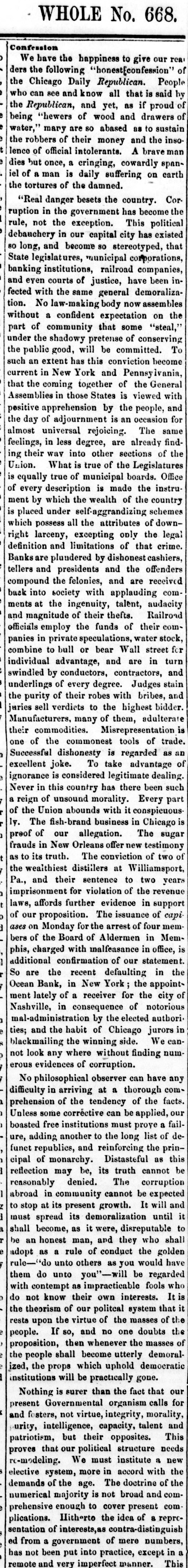 WHOLE No. 668. b Confession have the happiness to give our of We the following "+honest[confesion" People ders Chicago Daily Republican. is said the see and know all that by of who the Republican, can and yet, and as if drawers proud of being "hewers of wood abased as to sustain mary are so and the inso official the water," robbers of their intolerants. money A bravem lence of once, a cringing, cowardly span- earth iel dies of but a man is daily suffering on the tortures of the damned. "Real danger besets the country. become Cor- the ruption in the government has This political not the exception. has existed rule, in our capital city that debauchery and become so stereotyped, corporations, 80 long, legislat municipal companies State institutions, railroad been in banking courts of justice, have demoralizaand eyen with the same general assembles fected No law-making body now on the tion. a confident expectation "steal," without of community that some conserving part the shadowy pretense committed. of To under public good, will be become the extent has this conviction ivania, current such an in New York and of Pennsy the General that the coming together is viewed with in those States and Assemblies apprehension by the occasion people, for positive of adjournment is an The same the day universal rejoicing. already findalmost in less degree, are of the feelings, their wav into other sections Legislatures ing What is true of the Office Union. true of municipal boards. the instruis equally description is made the country of ment every by which the wealth of schemes placed under self-aggrandizing of downis possess all the attributes the legal which larceny, excepting only that crime. right and limitations of cashiers, definition plundered by dishonest offenders Banksare and presidents and the received compound the tellers into society felonies, with and applauding talent, are audacity comback at the ingenuity, Railroad ments magnitude of their thefts. of their coinofficials and employ the speculations, funds water stock in private Wall street individual panies combine to advantage, bull or bear and are in turn and by conductors, contractors, Judges stain swindled underlings of every degree. with bribes, and of their robes bidder. the purity verdiets to the highest adulterate juries sell many of them, is Manufacturers. commodities. Misrepresentation of trade. their the commonest tools as an one Successful of dishonesty To take is regarded advantage of excellent joke. is considered legitimate been dealing such ignorance this country has there part Never in of unsound morality. conspieuous Every a reign Union abounds with it Chicago of the The fish-brand business in The sugar ly. of our allegation. testimony The conviction preof frauds in New Orleans offer new of two of as to wealthiest its truth. distillers at Williamsport two years the and their sentence of to the revenue imprisonment Pa., for violation in support affords further evidence of capi laws, proposition. The issuance of four mem of our Monday for the arrest in Memases on the Board of Aldermen office, bers of charged with malfeasance statement in phis, confirmation of our in the additional the recent defaulting the appoint So are Bank, in New York the city of Ocean lately of a receiver for notorious ment in consequence of authori Nashville, by elected and side. mal-administration the habit of Chicago jurors We blackmailing ties; look any where the winning without finding erous not evidences of corruption. No philosophical observer thorough can have any facts. difficulty in of arriving the tendency at a of applied, the prehension corrective can be Unless some free institutions must prove list of deboasted adding another to the long the prinure, and reinforcing as be funct republics, monarchy. Distasteful this cipal of its truth cannot reflection may be, The corruption reasonably denied. be expected abroad in community cannot It will and it at its present growth. until to stop its demoralization to must become, spread as it were, disreputable who shall shall honest man, and they the golden adopt be an "do as a unto rule others of conduct as you be would regarded have rule-' them do unto as you" impracticable -will fools It is who with contempt know their own interests. that do not of our politcal system of the the theorism the virtue of the masses doubts the rests upon If so, and no one people. then whenever the masses demoral- of proposition, shall become utterly democratic the people props which uphold our ized, institutions the will be practically gone. is surer than the fact that calls for Nothing Governmental organism morality, present fosters, not virtue, integrity, talent and and intelligence, capacity, This urity, opposites. needs proves patriotism, that our but political their structure institute a new re-modeling. We must accord with the system, more in doctrine of the elective the age. The and demands of majority is not broad com numerical cover present prehensive enough Hitherto to the idea of a reprccontra-distinguish plications. interests, numbers, sentation of government of mere except in remote ed from a put into practice, This has not and been very imperfect manner.